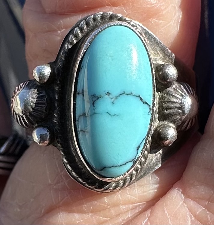 Just picked this up at a local resale shop. I am not familiar with the hallmark. Can anyone help with it and a guesstimate on type of turquoise? I appreciate any help from the forum peeps that are always willing to help.