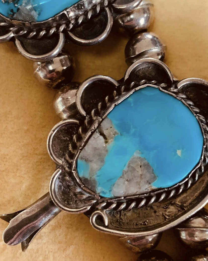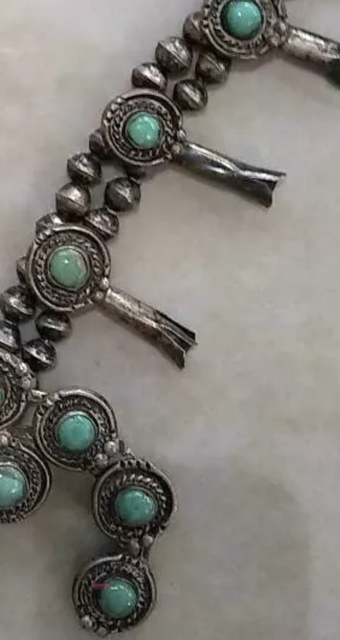 With my admittedly limited knowledge, I would say both are handmade, the green one seems older with fully hand made and soldered beads. Can’t really tell anything about the stones, the pic is to fuzzy to make out any detail. The blue one, the bead halves were soldered together by hand, but the bead halves themselves were machine made on a press. I would think they were both real turquoise but need clearer pics of both with the backs and close ups on some of the stones. I’m thinking 60’s - 80’s with the green one possibly a little older. I’ll leave values to the more experienced and also corrections if I got it to terribly wrong.