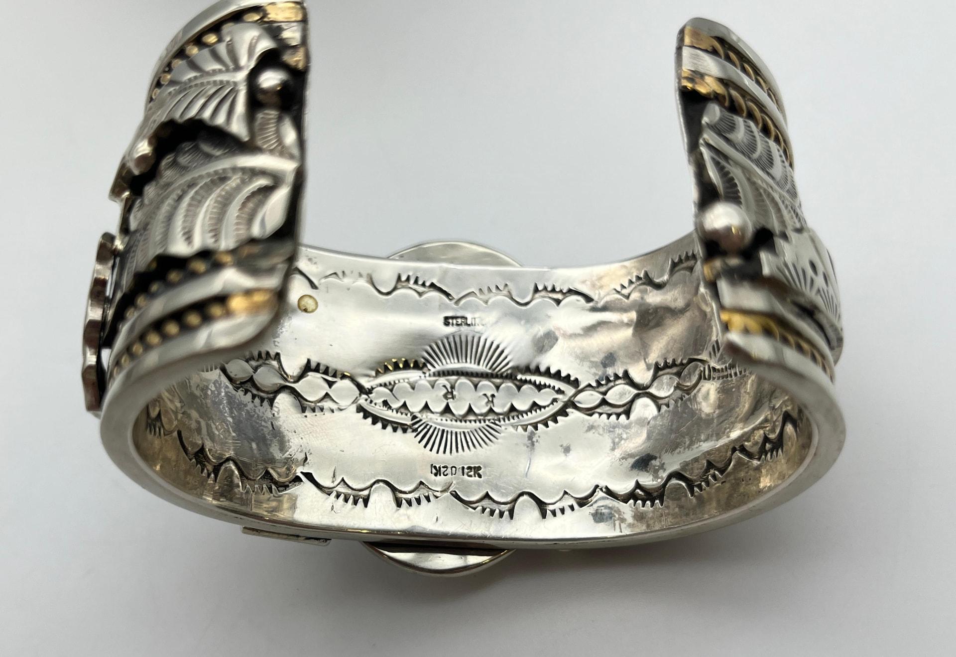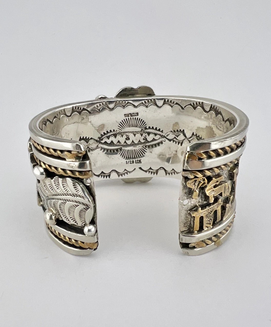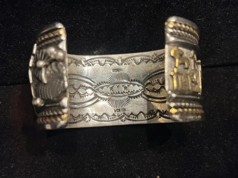I am so thankful that there is a forum like this dedicated to turquoise, native american, and southwestern jewelry. I’ve been lurking for a while, reading your forum and any books that I can get my hands on from my local library. I’ve collected several pieces by known artists, but there’s a piece I’ve purchased recently, that haven’t done my homework on. I love it anyway, regardless if it’s a production piece or not; but, I’m hoping you can help me shed some light. I’ve seen similar pieces and stampwork (pictures below), but the sellers guess different artists. One mentioned Russ Rockbridge, one mentioned Richard Reeves, and others do not bother to guess based on the hallmark. The “RR” does not look like Russ Rockbridge or Richard Reeves based on the art-amerindien hallmark website or Medicine Man Gallery (Mark Sublette). I thought the stampwork does look like in the hallmark labeled as Rob Tsosie; however, I can’t find any examples of Rob Tsosies’ work online.