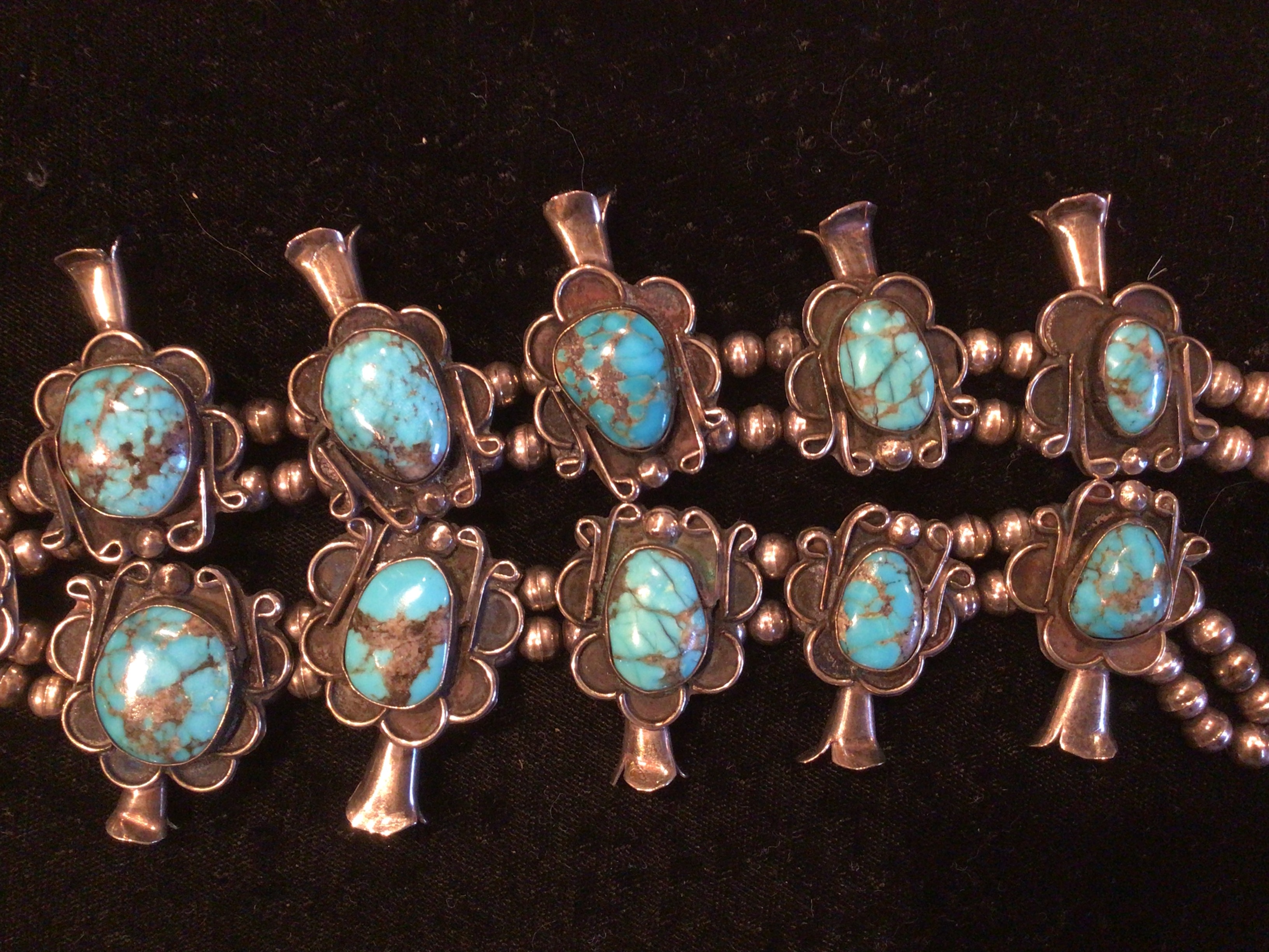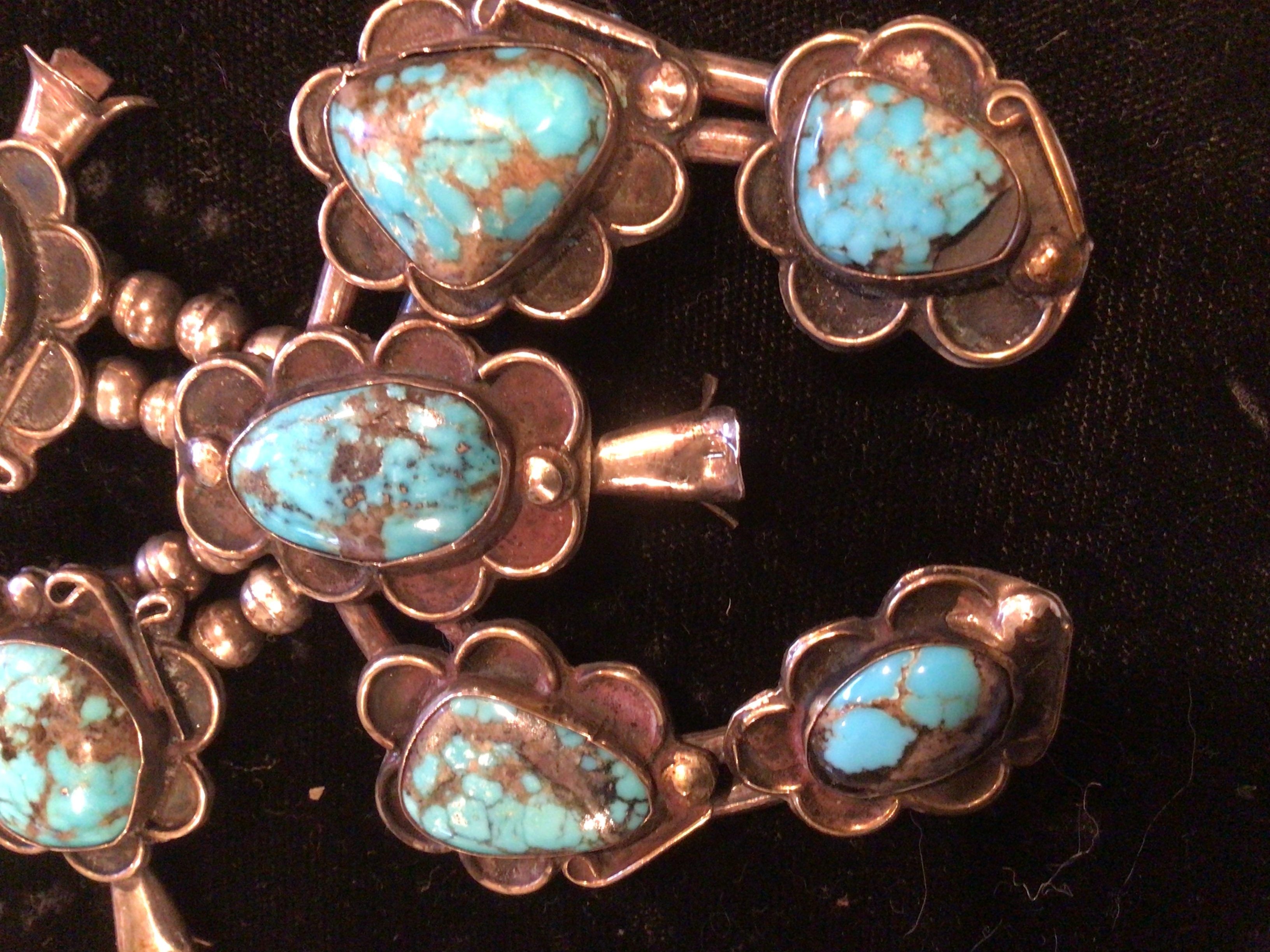 As I was going through my inventory of retail pieces, I came upon this petite squash blossom I purchased several years ago along with others pieces from the estate of an elderly woman who collected in the 50ās - 60ās. I kept this piece back; the turquoise just spoke to me. Although it does not have the characteristic lavender or Smokey characters, the stones are natural and deep blue with brownish veining. The last stone on the right side of the Naja is missing a small piece allowing visualization of the same color throughout the interior of the cab. Bisbee is just my gut feeling; Iād really appreciate the opinions of others.