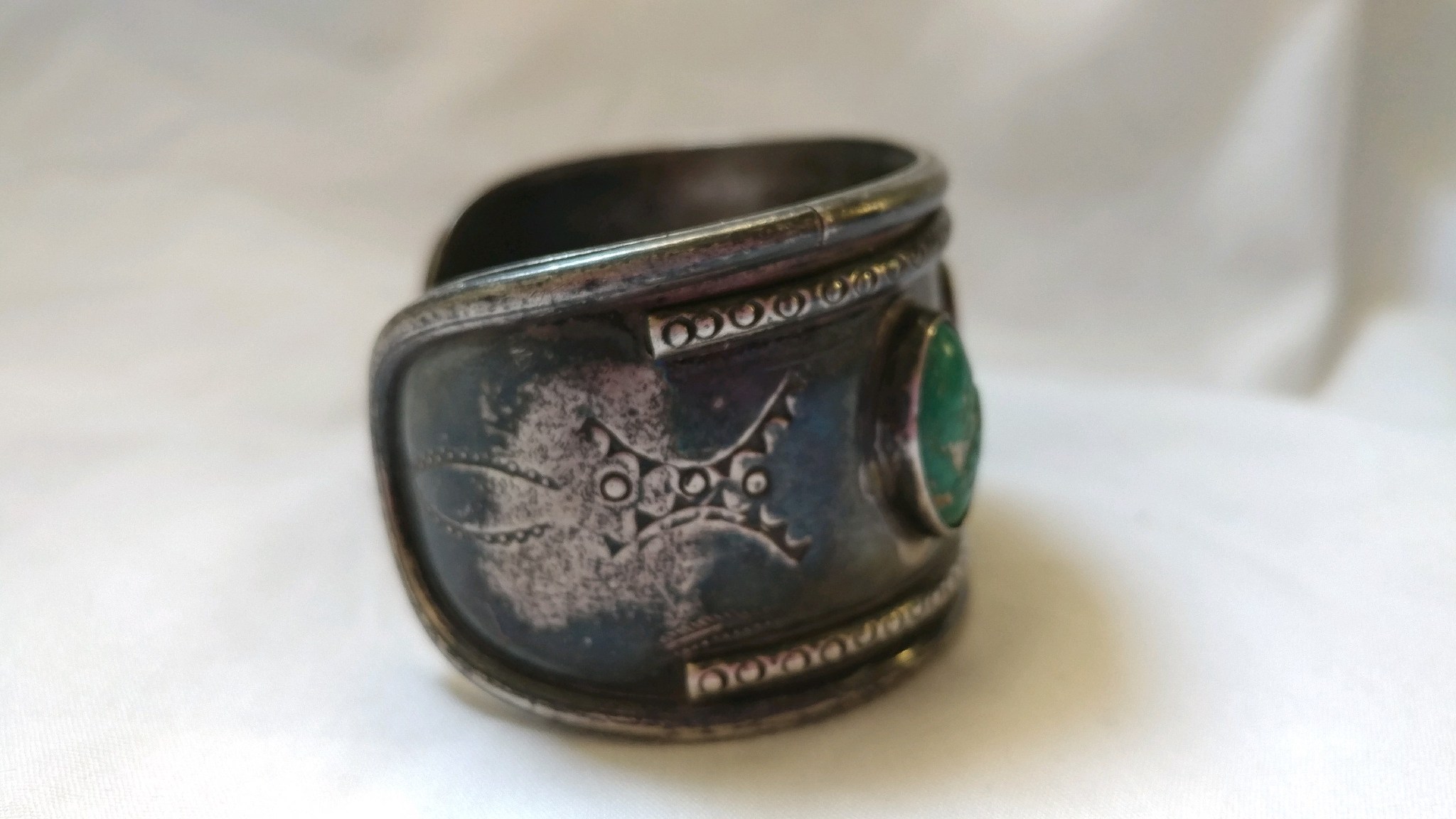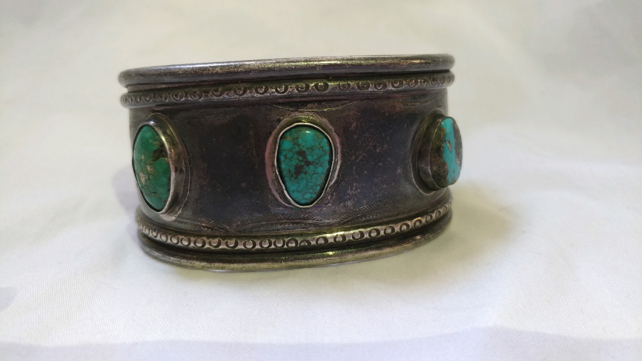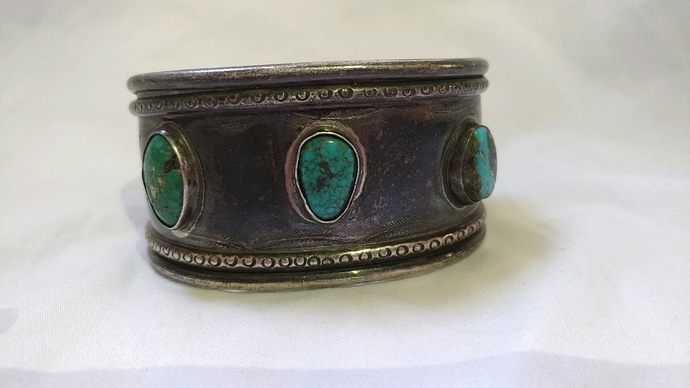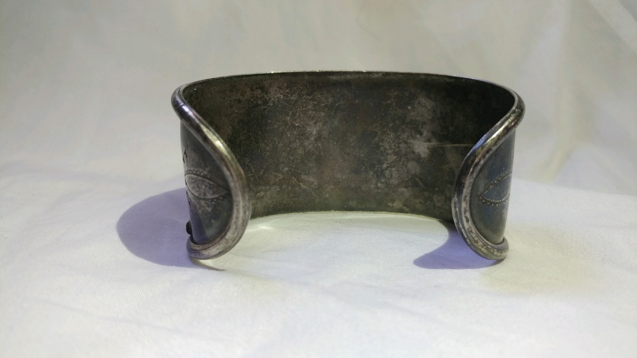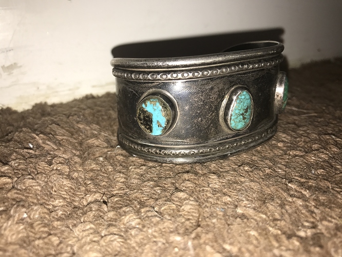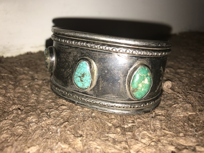 The interior of the cuff has some faint sand- cast divots, and features three different turquoise pieces. One stone appears to be Morenci or Ithaca Peak turquoise, I have not yet been able to identify the remaining two stones. As stated previously, the “Yazzie” mark is not stamped, it is hand inscribed. It does not appear to be done by machine or dremel. I have read that most Native jewelry makers did not start stamping their hallmarks until the 20’s or 30’s, but I don’t think my cuff appears to be that old. Was it common for any of the Yazzie family members to hallmark their work in this way? If anyone has any information about Yazzie family jewelry, please let me know! any info helps!