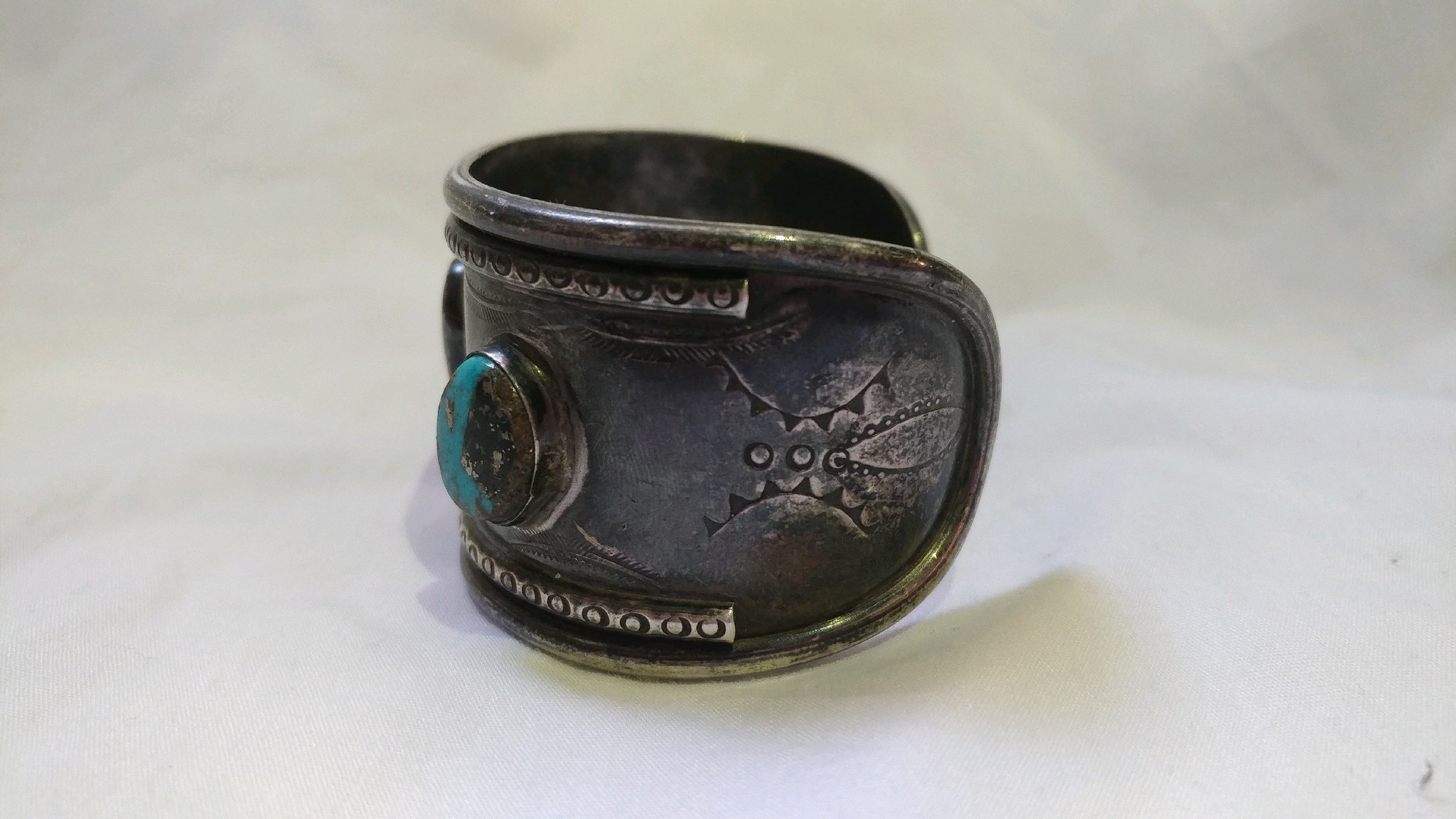 I recently purchased this men’s turquoise cuff. To my surprise, when I got home and inspected it further, I noticed the name “yazzie” faintly hand- inscribed on the back. After doing further research, the Yazzie family has been making jewelry for quite some time; each member of the family has their own unique style. With that being said, there is no first name or first initial to accompany the mark. So, hopefully someone can help further identify which Yazzie actually made this cuff!