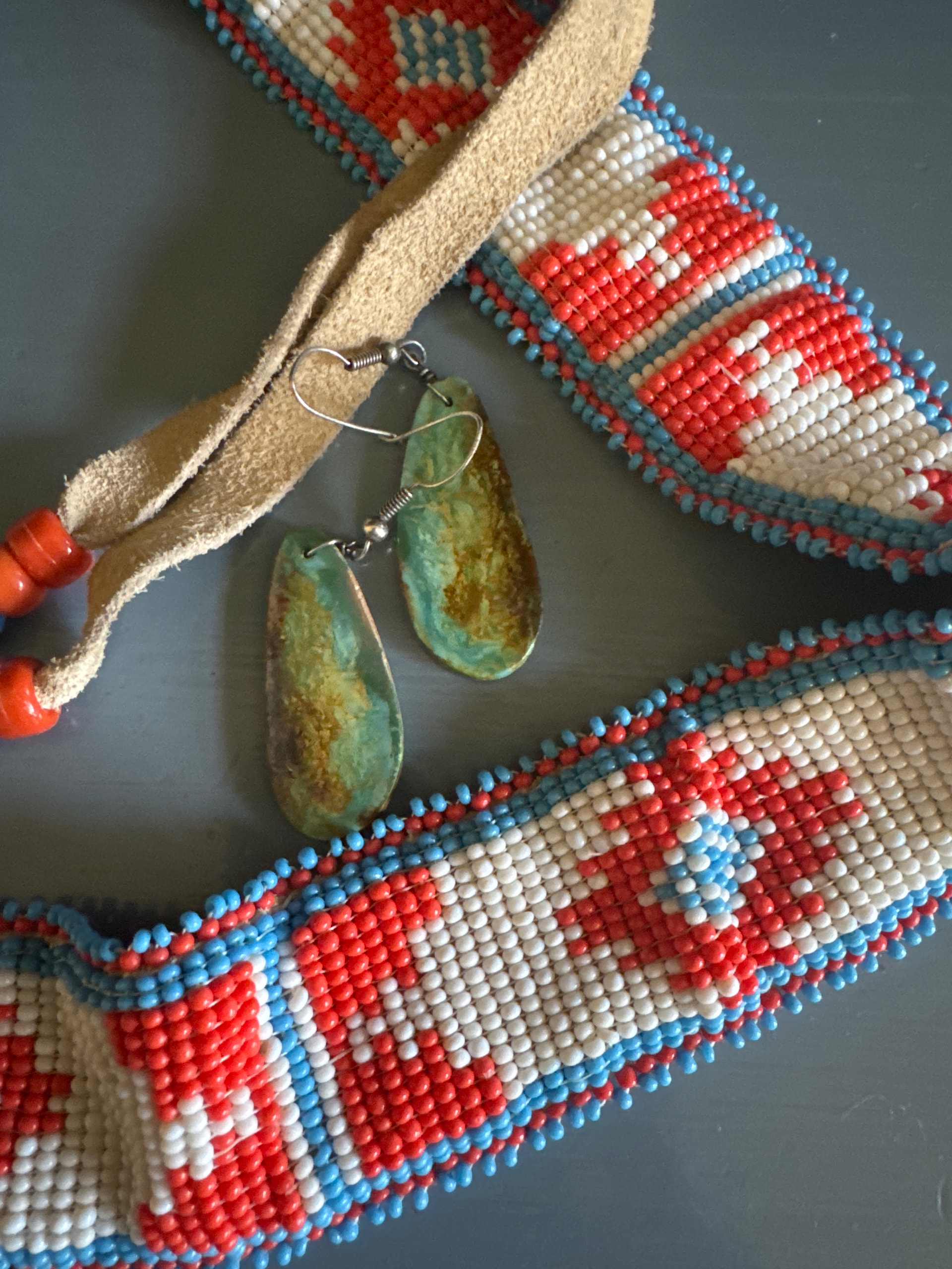 BTW I also found these earrings at the same sale, and the bead belt.What a great battery bird necklace (also called Santo Domingo depression era necklaces)! They were definitely made later than the '50s, but I don’t know exactly how to tell the age. I linked an article that has some info, but I couldn’t find anything that was specific. I have read that in earlier necklaces the beads are made from gypsum as versus glass. And some of the even older beads are made of bone. I’ve also read that the color red was not used on the earliest ones, but I’ve seen conflicting info on that. I have one that I know that my mom bought in 1969, but I don’t know how old it is even though it does have gypsum beads. Yours reminds me a lot of mine, except the color in yours is much brighter, but then my necklace sat in a bag in a closet for literally 50 years (it was my sister’s; she didn’t like it so it got tucked away, and I found it when my mom passed). Your string does look newer, but I wonder if it was restrung at some point? I had mine restrung so it has a newer string and clasp.