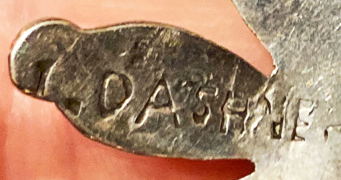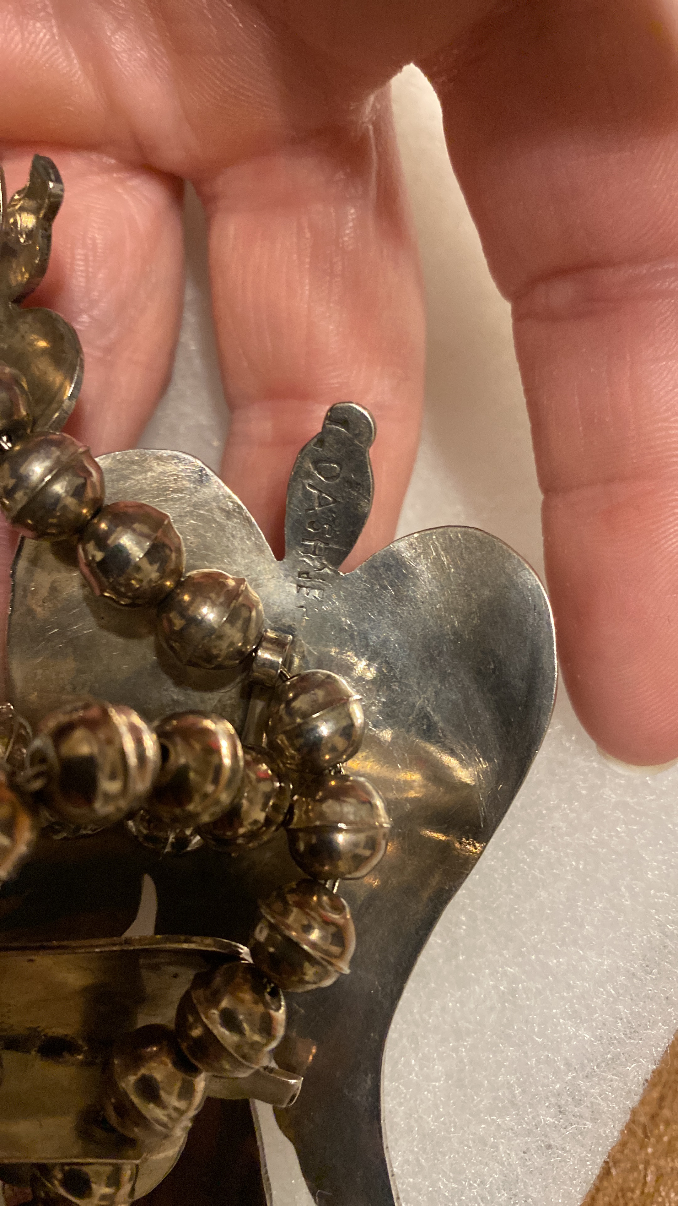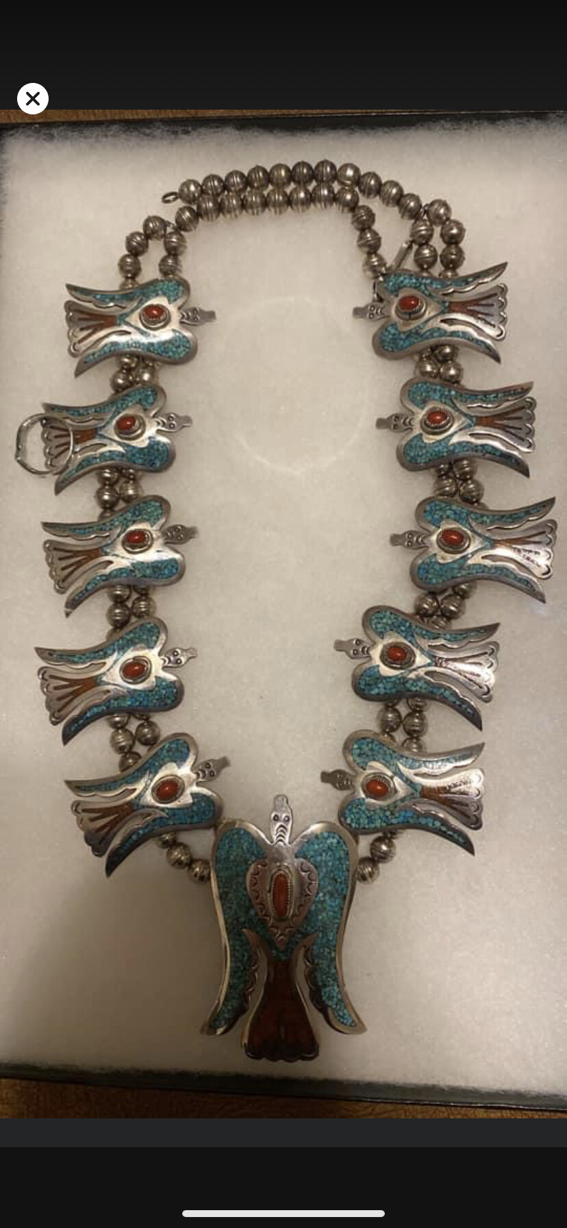 I have a partial signature on this vintage peyote bird chip inlay necklace, I’m fairly new to NA jewelry and have tried to figure out what the signature could be, but keep running into dead ends. The necklace with the coral center stone is mine. The necklace with the turquoise center stone is a very similar necklace that was on display at the Wheelwright Museum, but unfortunately it also only had a partial signature, an “M” or “W” and the museum didn’t have any information on the artist. So the second necklace could be completely unrelated. Does this work or signature look familiar to anyone?