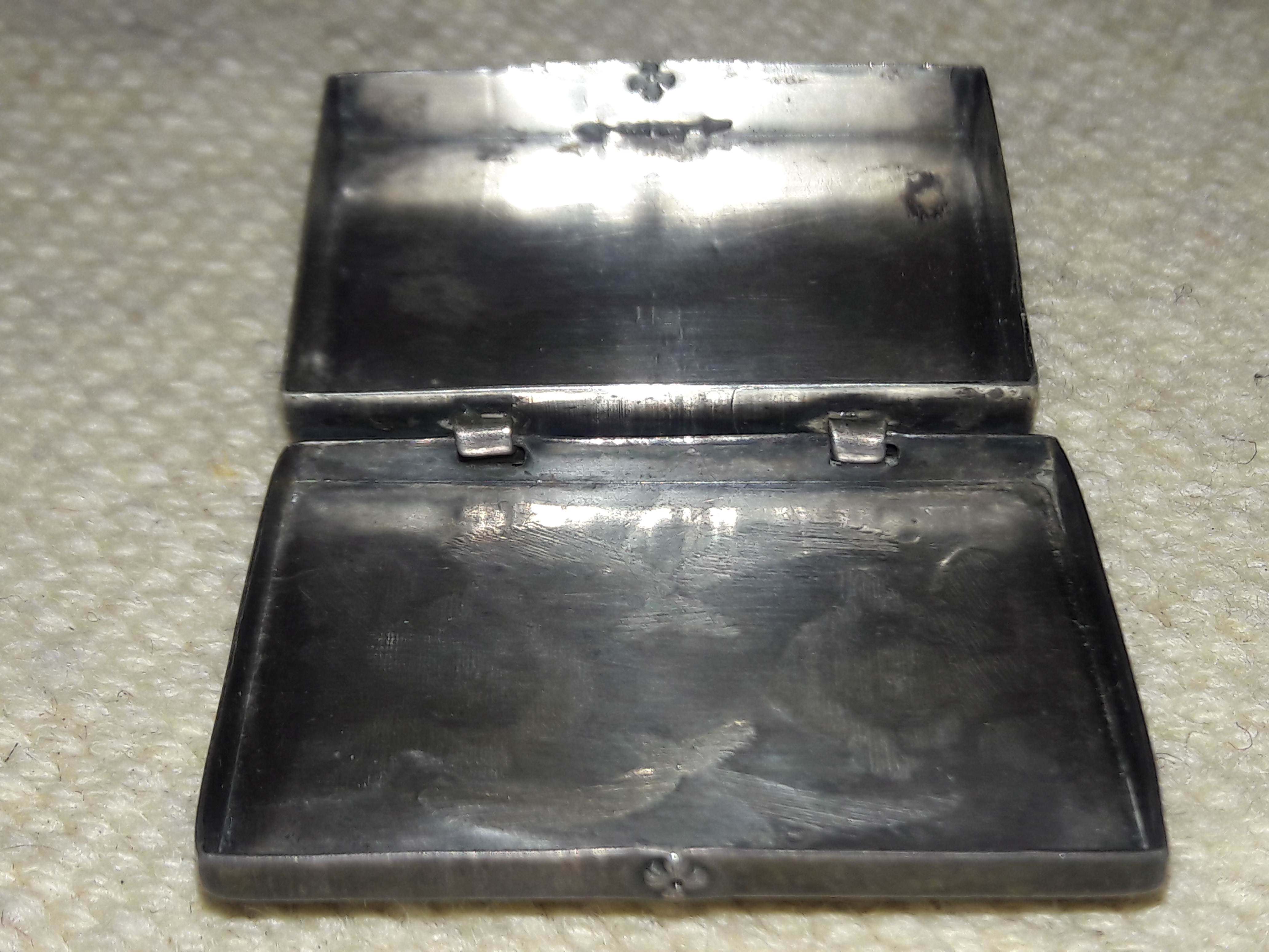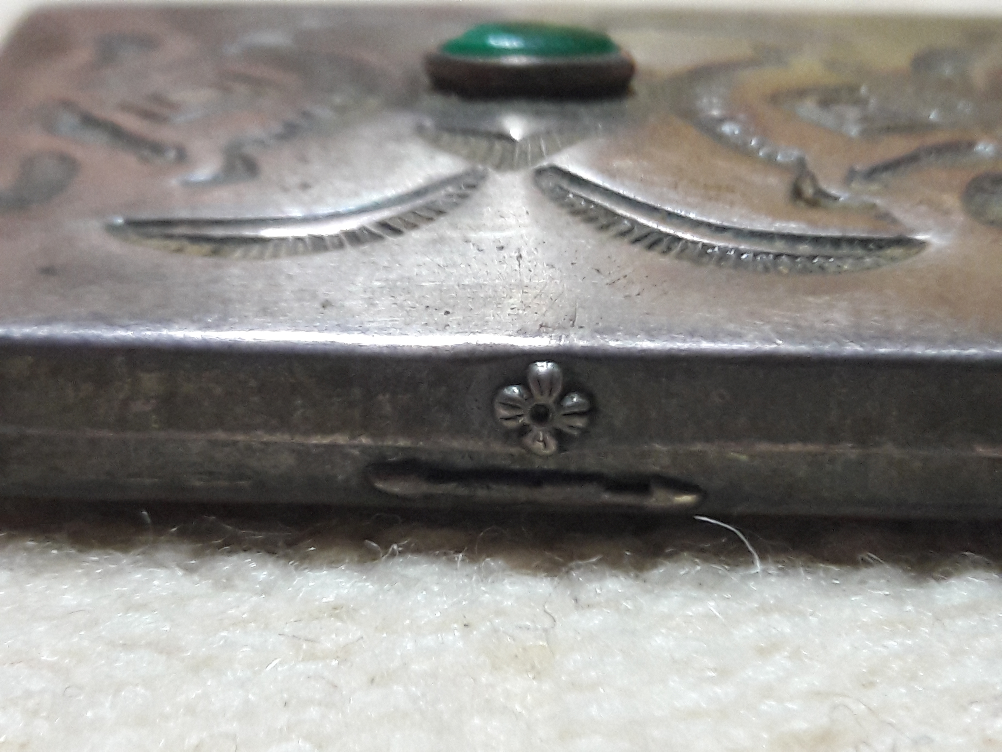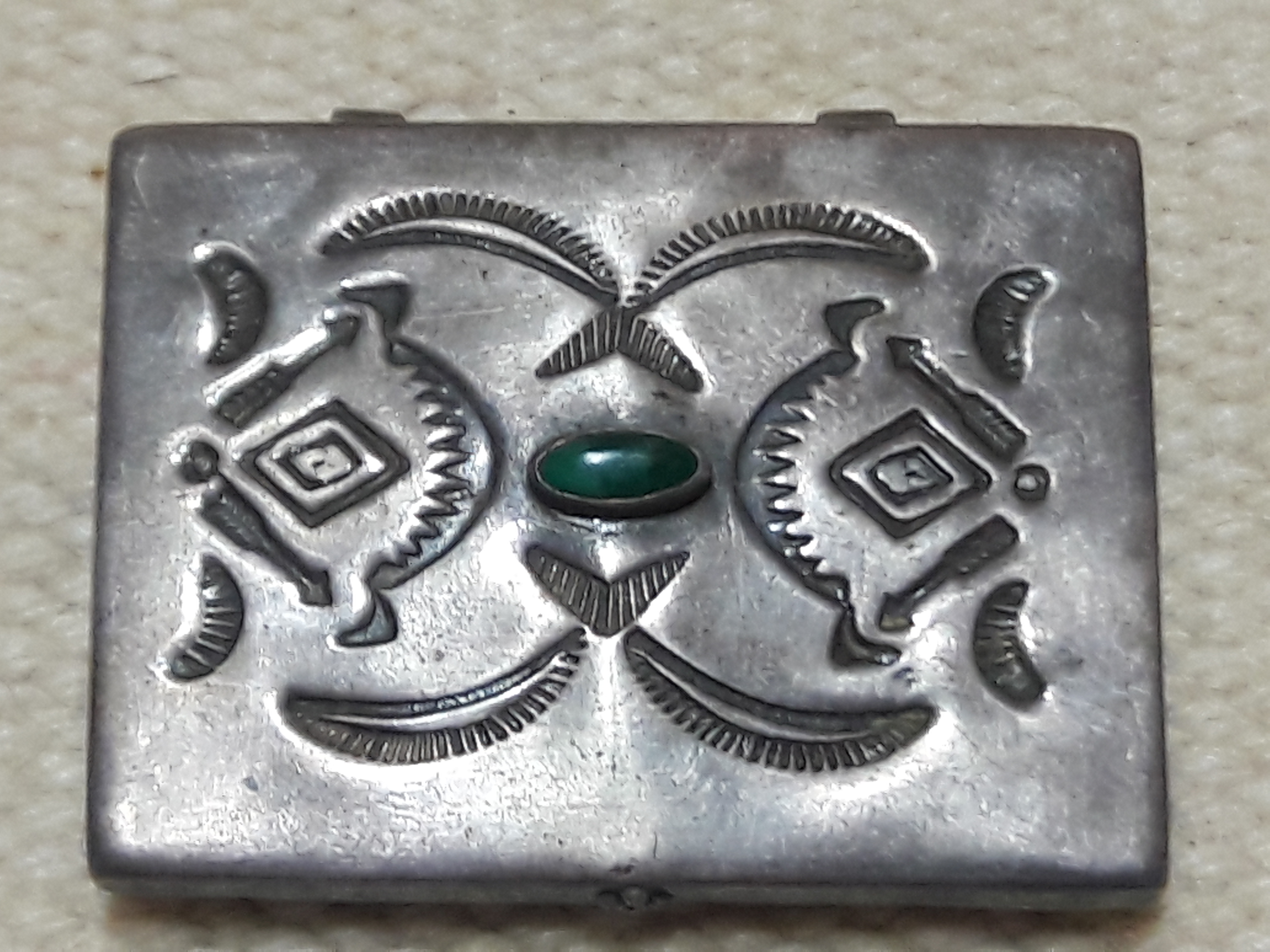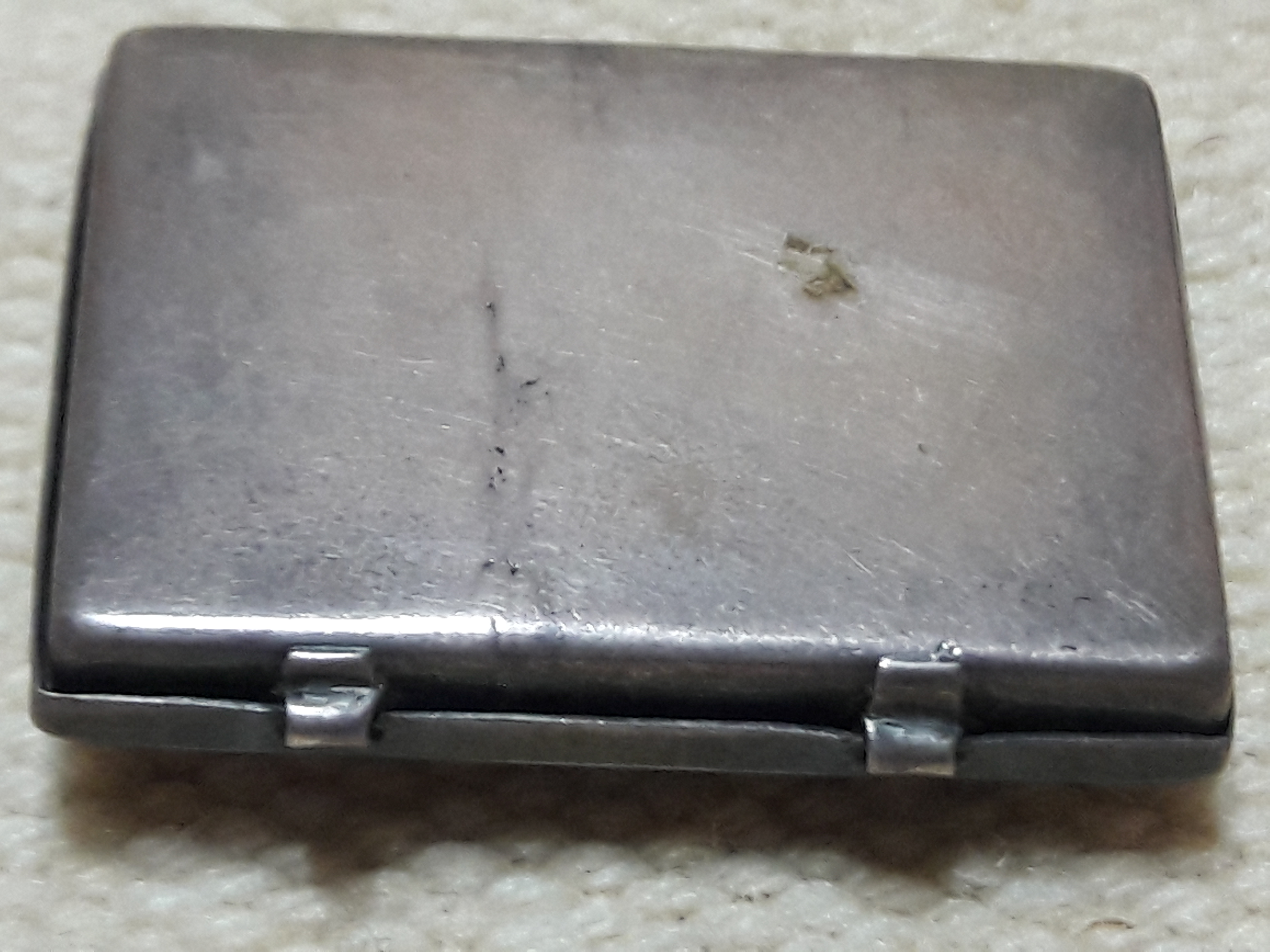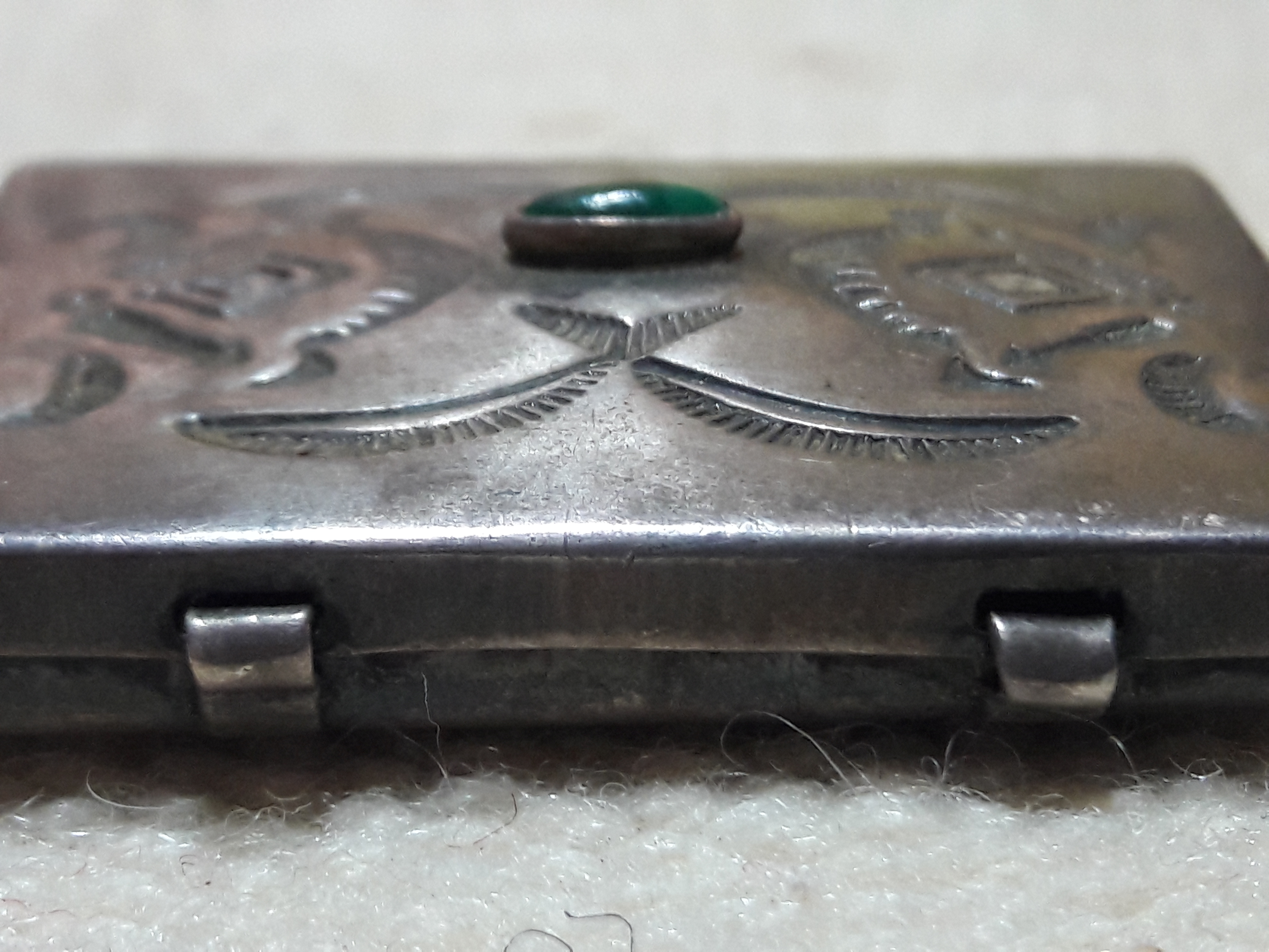1-7/8" wide x 1-3/8" deep x 5/16" tall. The lid is domed slightly and with the turquoise cabochon it is 1/2" tall. It weighs 24g.