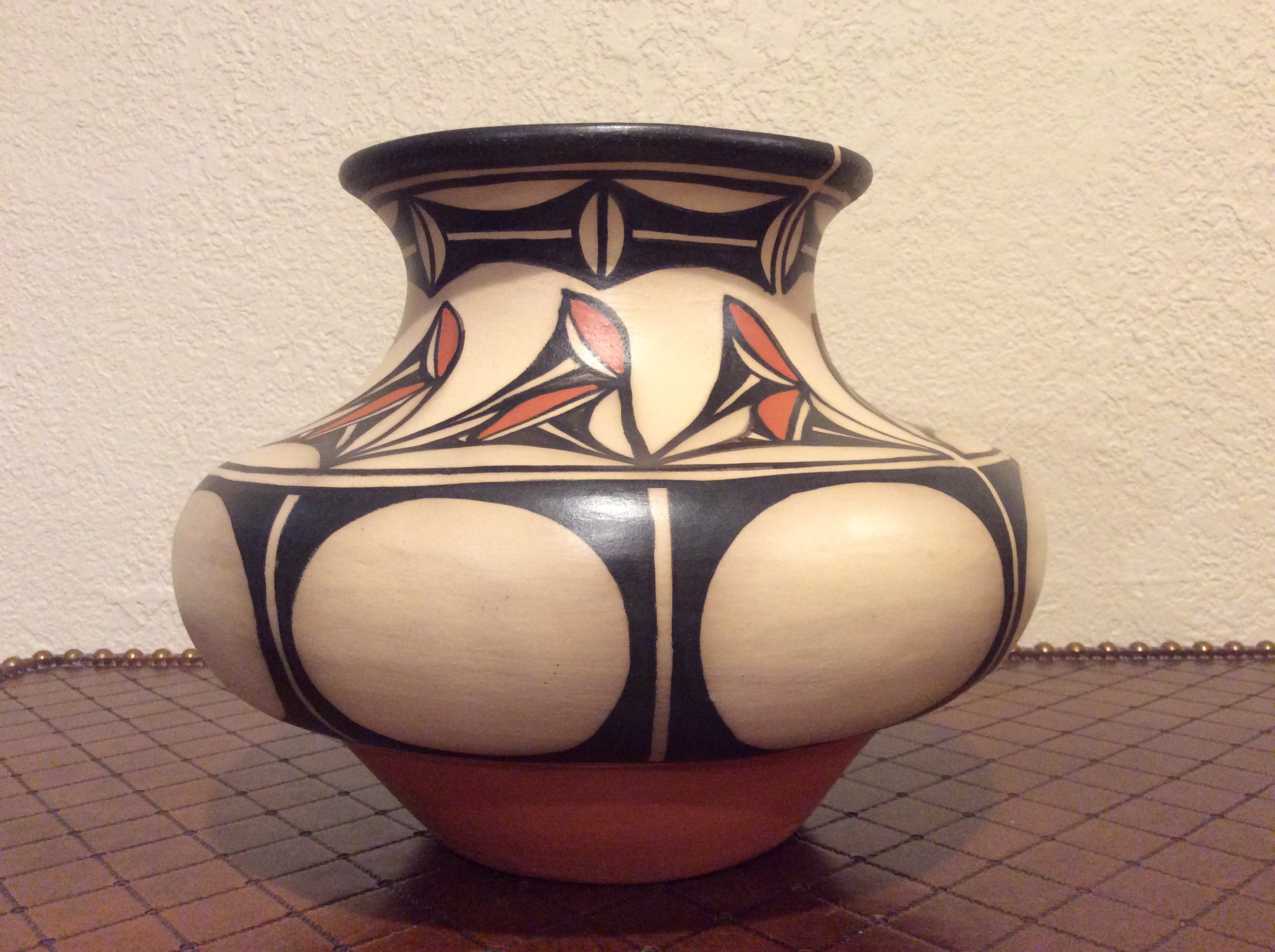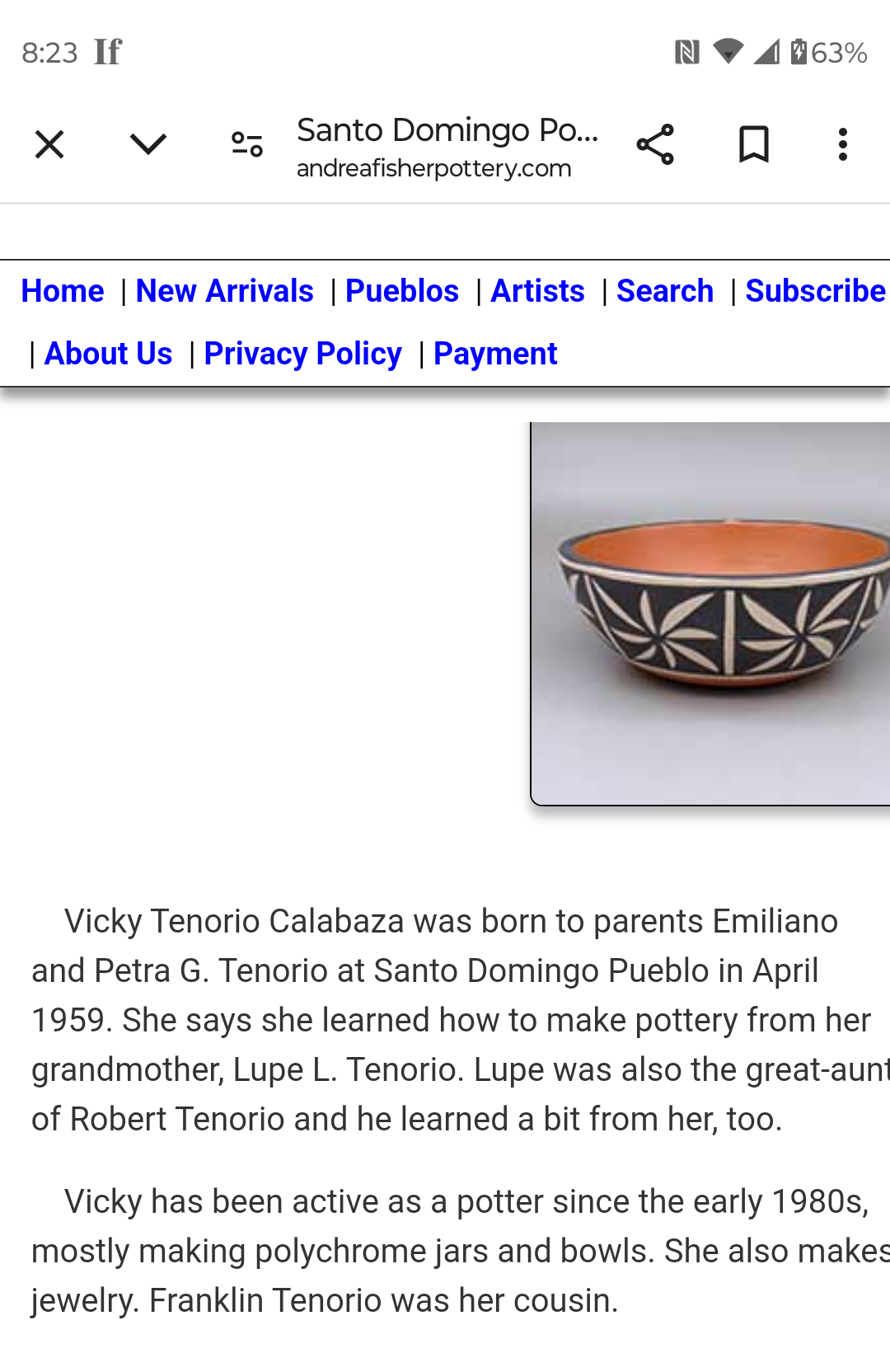 Nicely decorated bowl! And another Tenorio potter! There are quite a few Tenorio’s at Kewa. For example, Robert Tenorio and Tomas Tenorio, both excellent potters are not related; not sure where Vicky fits into the picture. Robert is getting up in age and has no children. His extended family, brother-in law, Howard Tenorio and his family make gorgeous hand rolled turquoise and/or shell heishi jewelry.