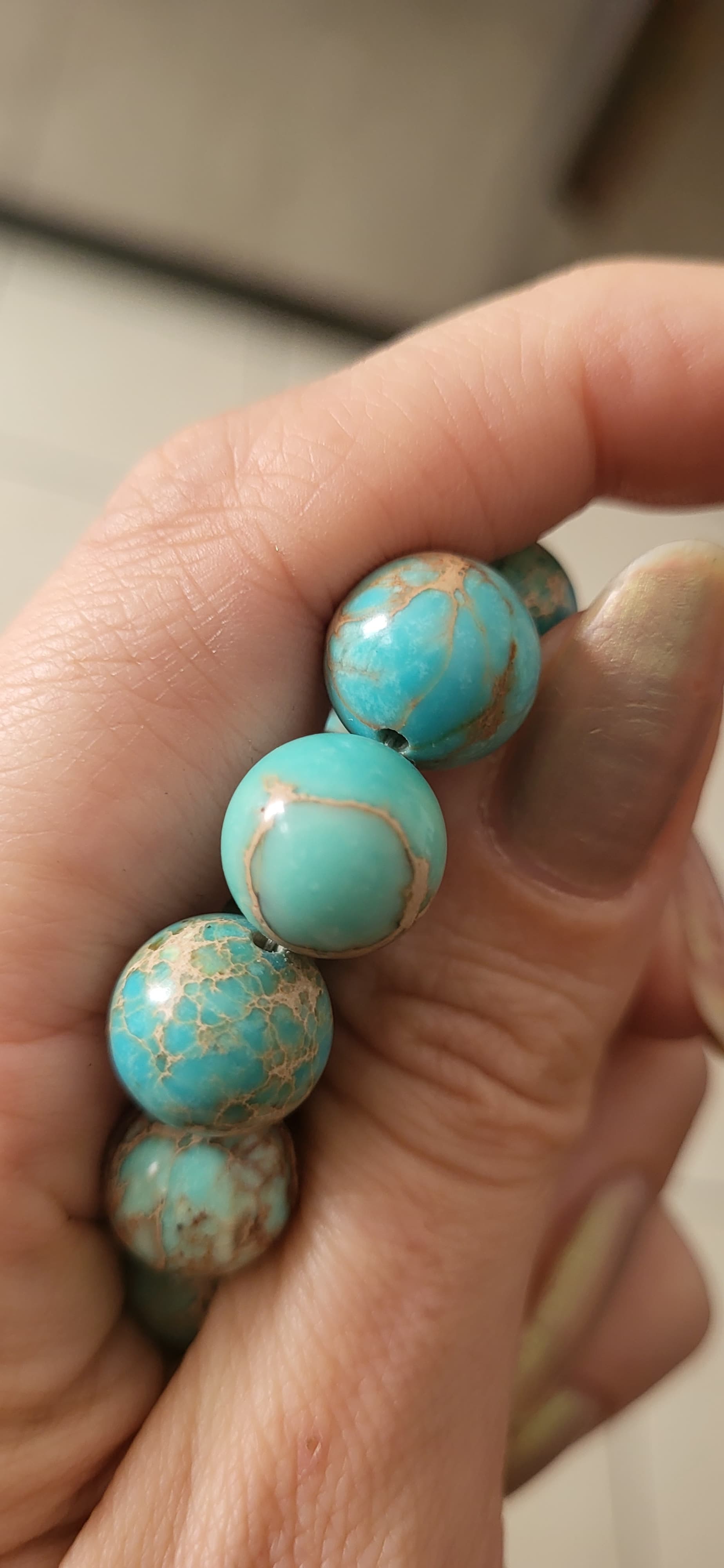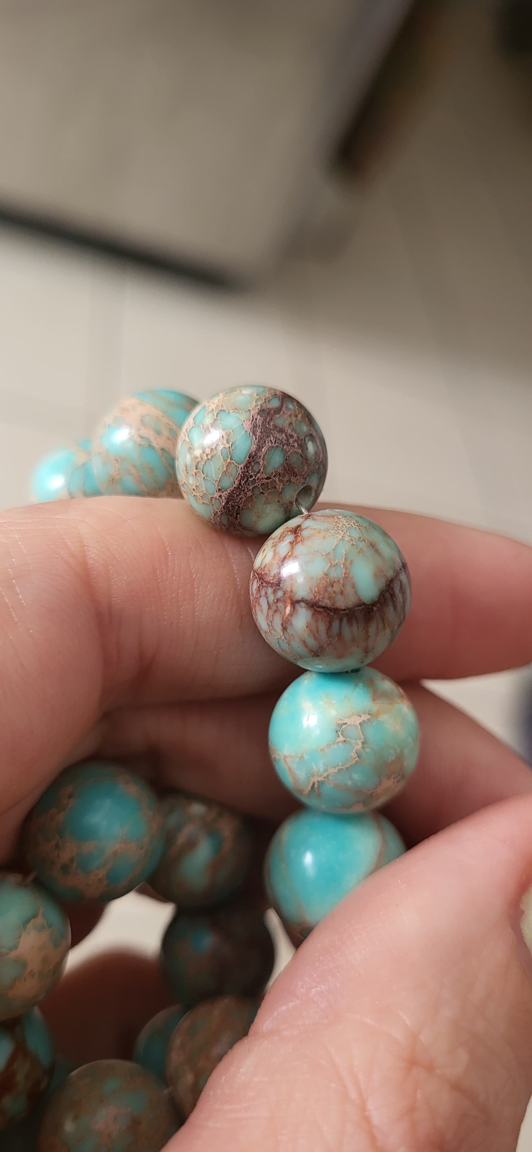 Can someone help me identify what kind of stone this is? I received the necklace as a gift from a friend. It was mixed with bone beads (I removed them) Is it variscite or is it turquoise?..
