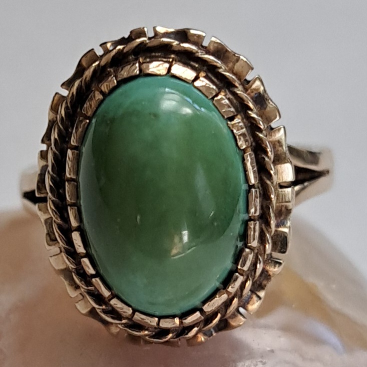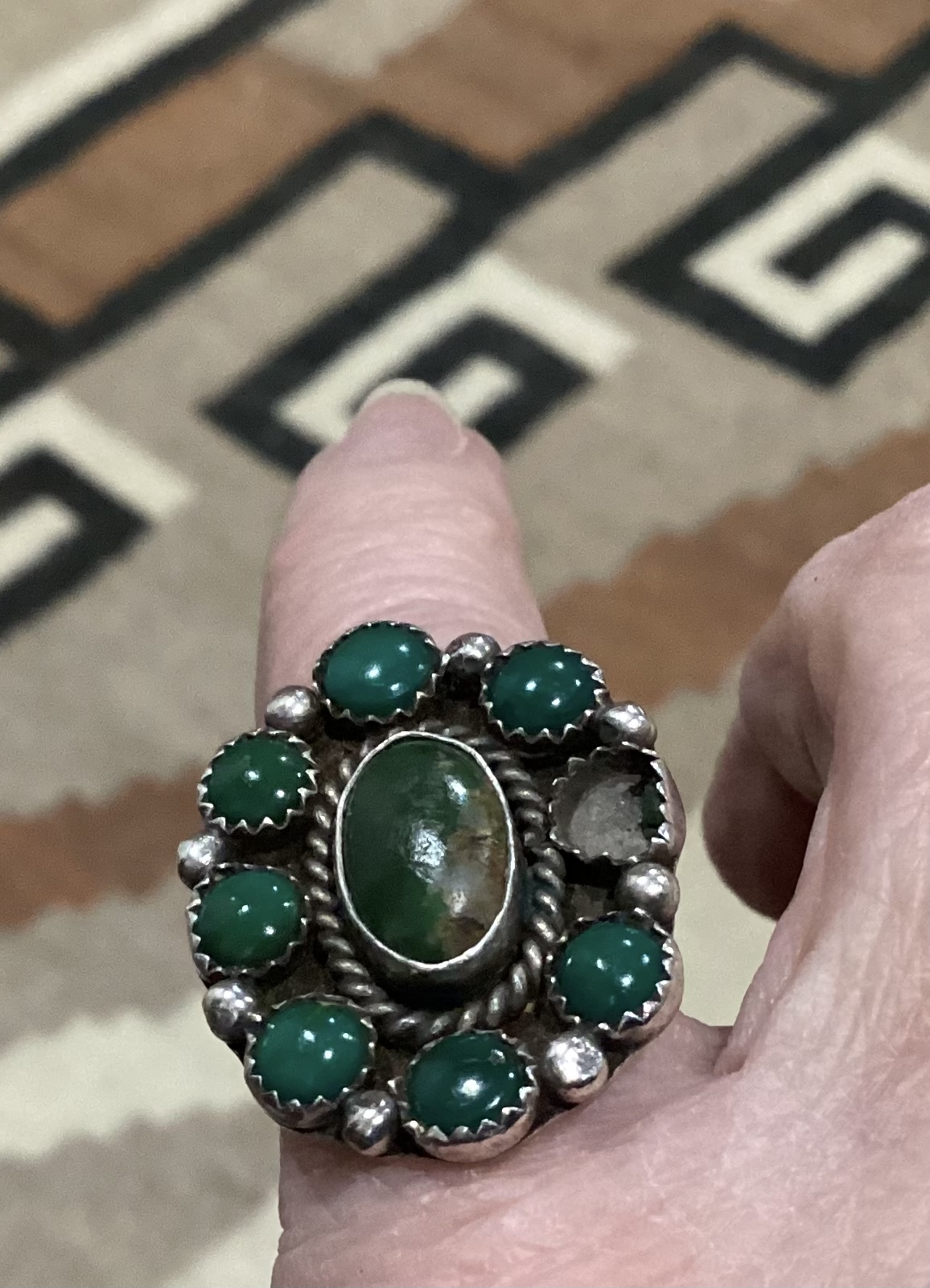 Some time ago I want through a green turquoise phase and picked up quote a few of older pieces with lovely green turquoise. I still am very attracted to great older green turquoise jewelry. I just pulled out this sweet ring from my “need repair” box. I’d pretty much forgotten about it since I doubted I could find a similar replacement stone. Wish I knew the original color…interesting that all the stones are the same color😊