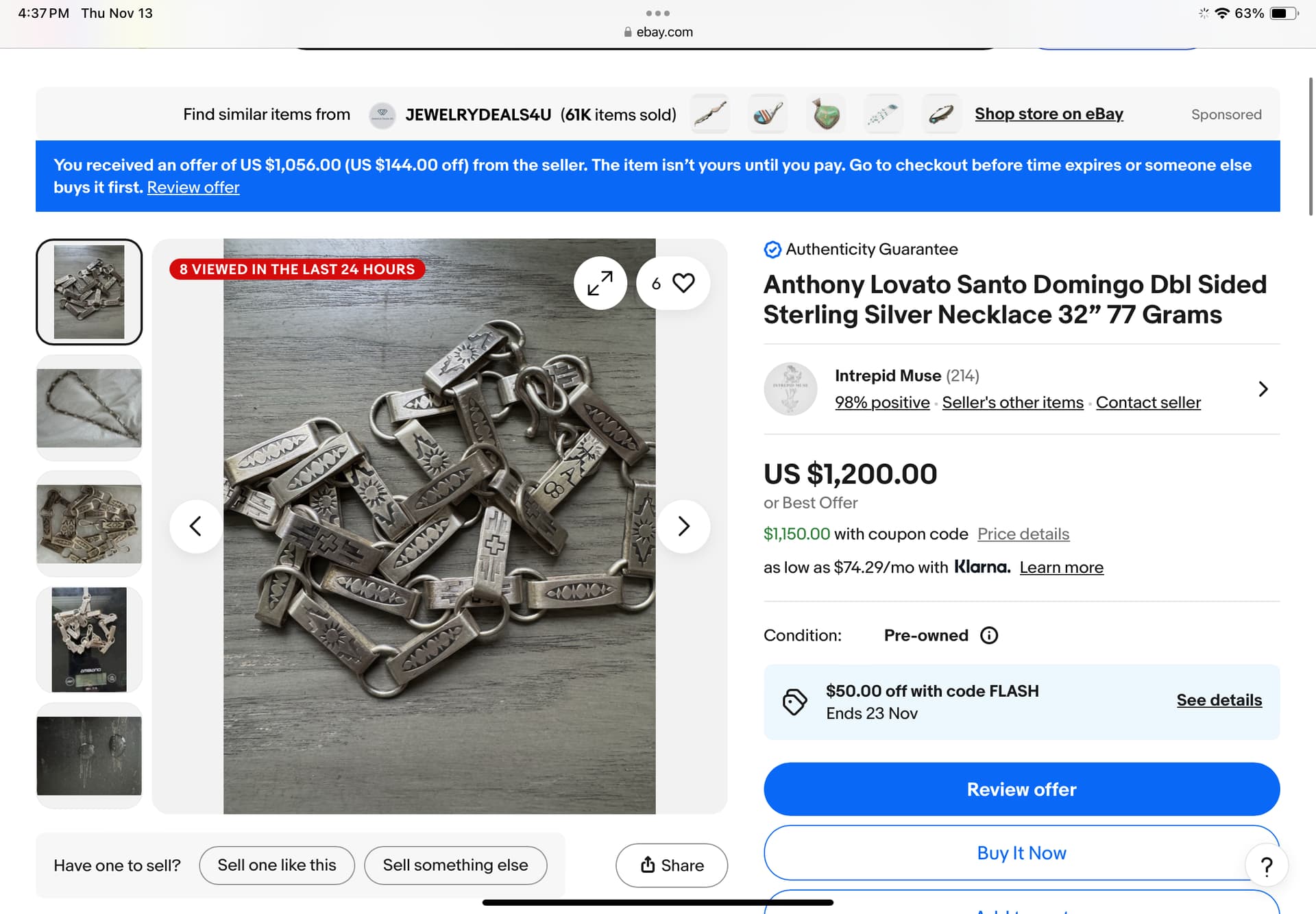 I’ve had luck at SGW..shop goodwill…but it is getting harder and harder to find a deal. I bought an Anthony Lovato necklace for under $400 there yesterday and looked to compare prices on EBay. Today I just got an offer from the EBay seller for the same necklace…uh…no thanks. I really like this style.