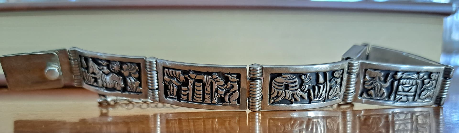 Interesting bracelet! Certainly appears well constructed. I agree; the type of closure reminds me of Taxco, or other Mexican silverwork. As I recall most Mexican silver pieces I’ve seen have .925, .950, etc, rather than “Sterling.” Also, I see similarities to typical Navajo storyteller motifs, but something about the design looks off. So I’m no help🥴, hopefully more knowledgable folks will weigh in.