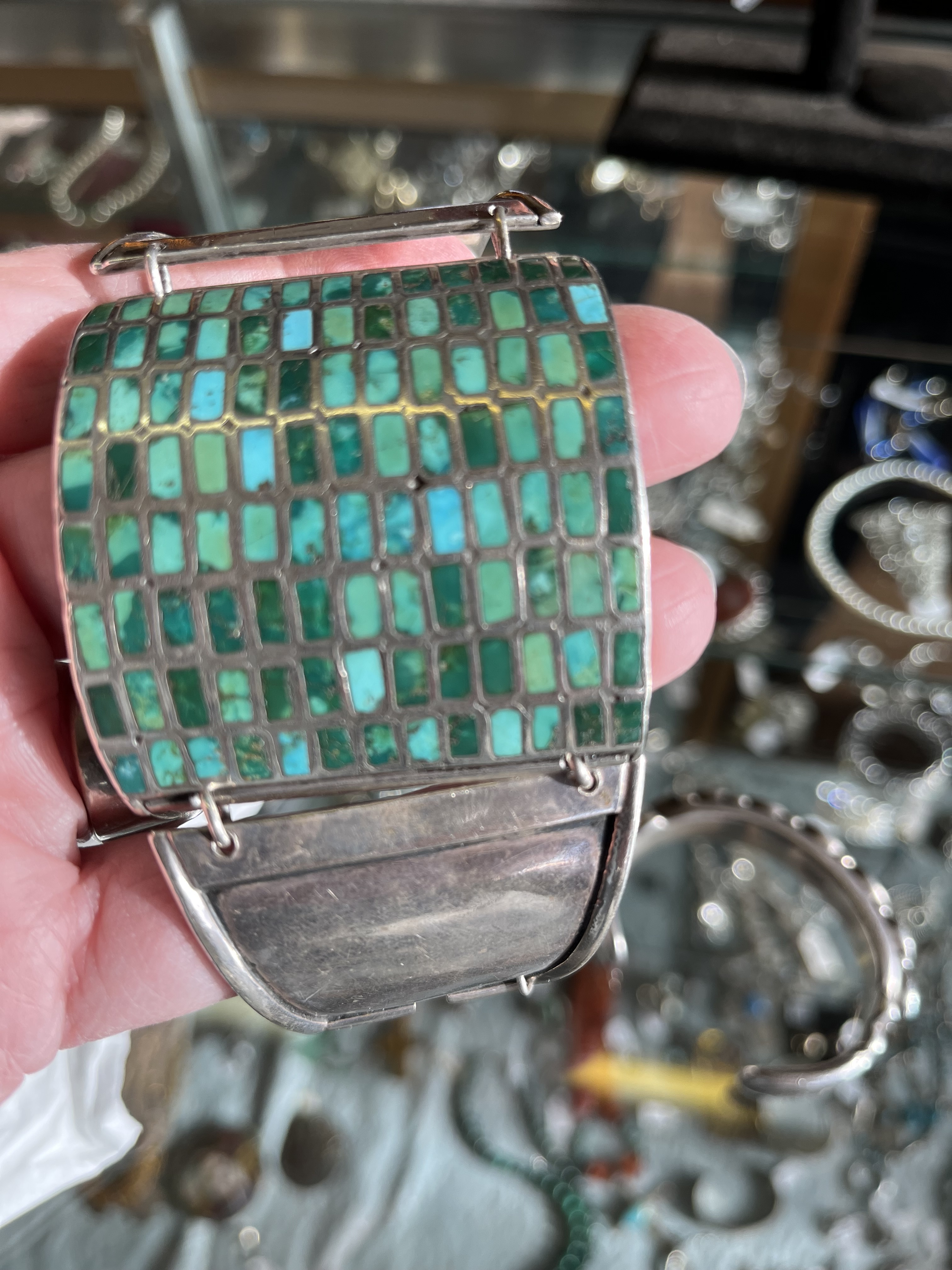 @Christibo; yep the Zuni-type inlay and the beautiful aged turquoise is what caught my eye…then I saw the construction and thought nope! it didn’t look repurposed, but who knows. if I’m back in the area, I’ll get better photos. Wish it had been a true Zuni inlay cuff😄.