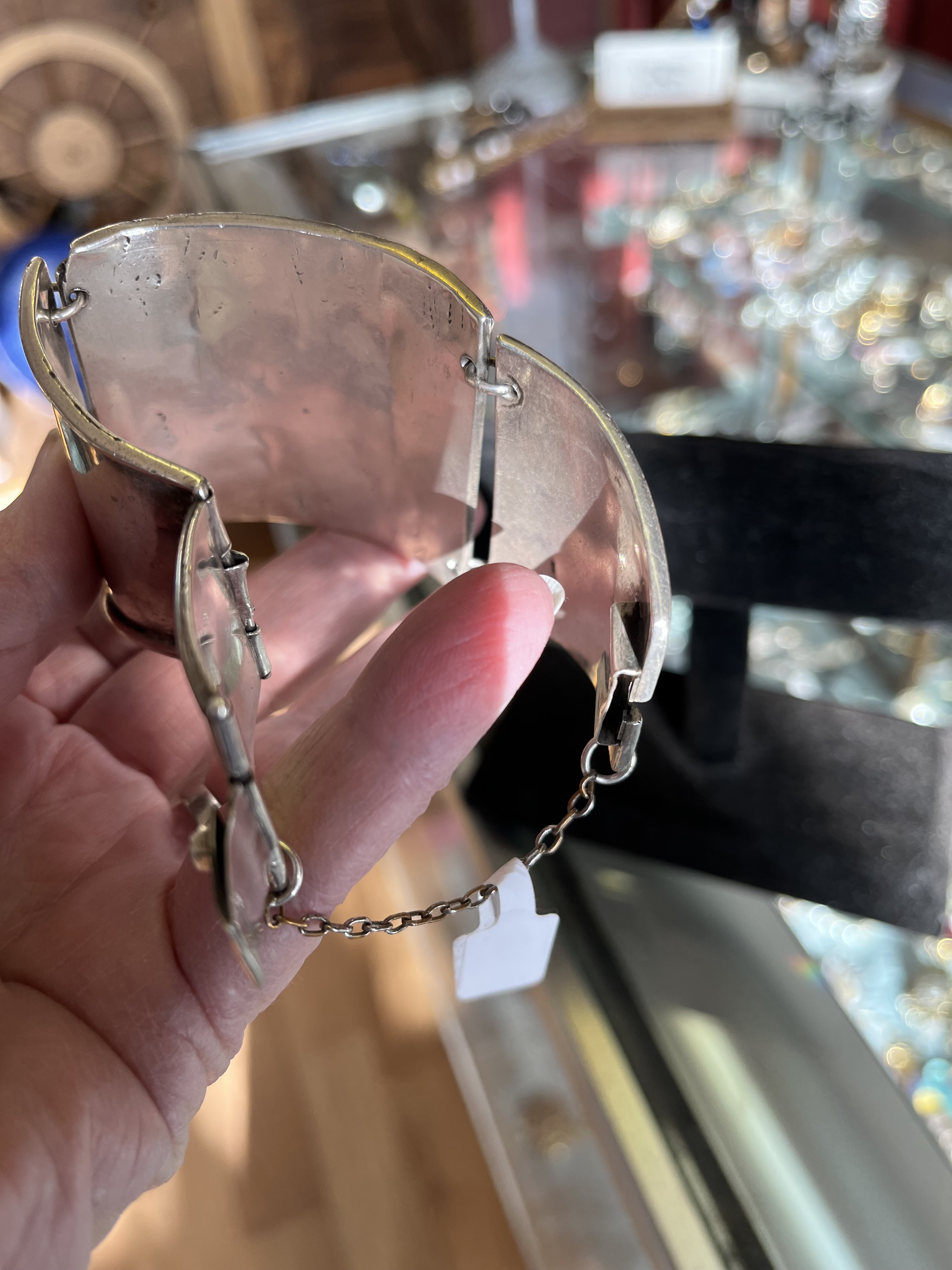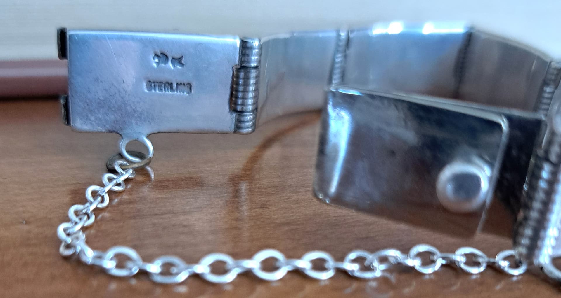 Here’s a Storyteller bracelet that I purchased many, many years ago. Even though it has representational elements of NA/SW life: people, hogan, weaving, horse, plants, goat, I’ve never considered it Native American made. Maybe others would, though. The construction of link panels, safety chain and type of closure doesn’t look like NA work to me. It’s hallmarked, though not with the usual Mexico hallmarks that I’m accustomed to seeing. Anglo made? The hallmark is unidentified.
