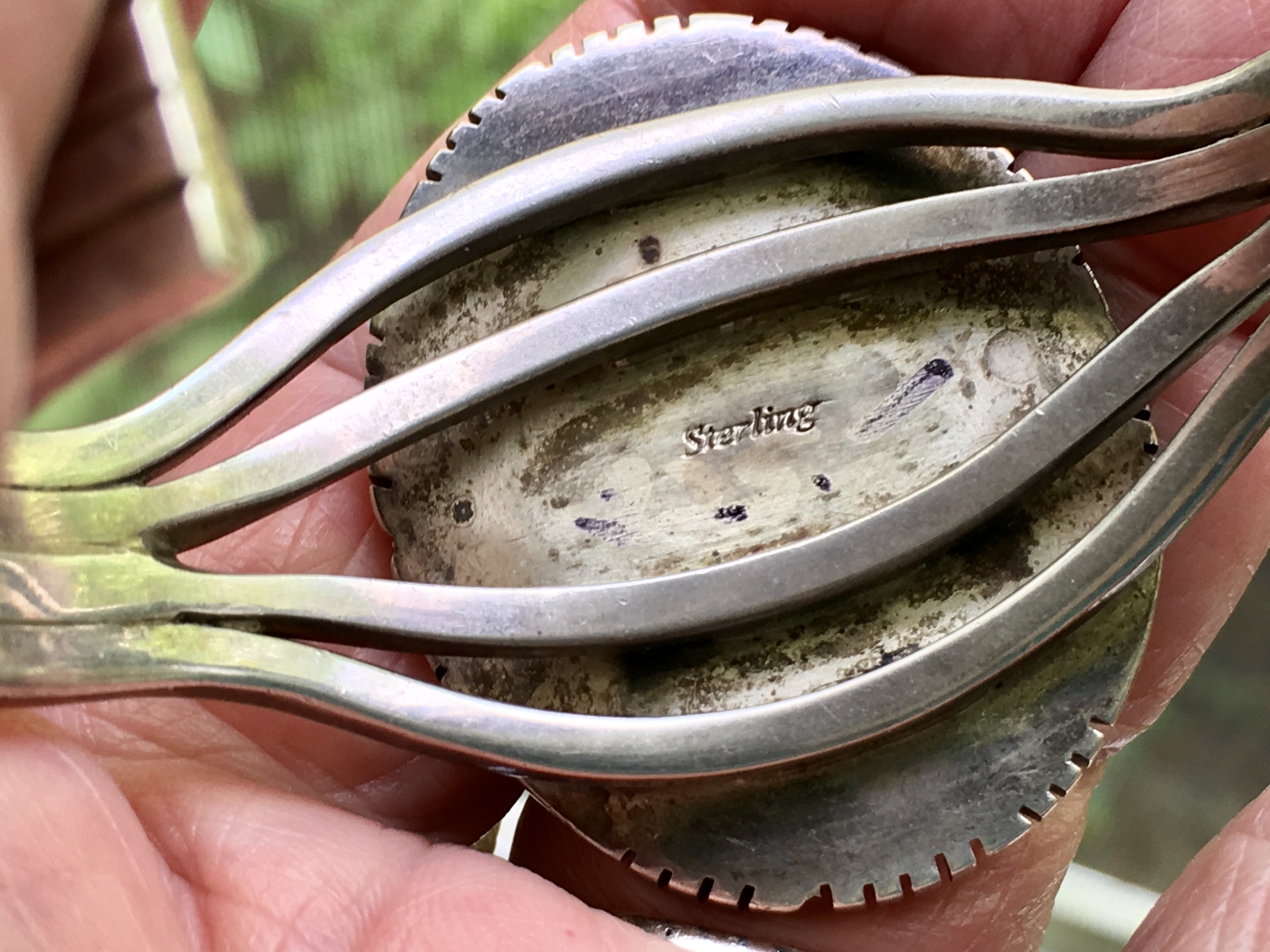 I got this cuff a couple of years ago because I thought the turquoise was beautiful. It was sold as Red Mountain and features a 1 1/2” by 7/8” cab set in a simple tooled bezel with plain bands. The cuff weighs 55.3 grams. It is stamped sterling but has no hallmark.