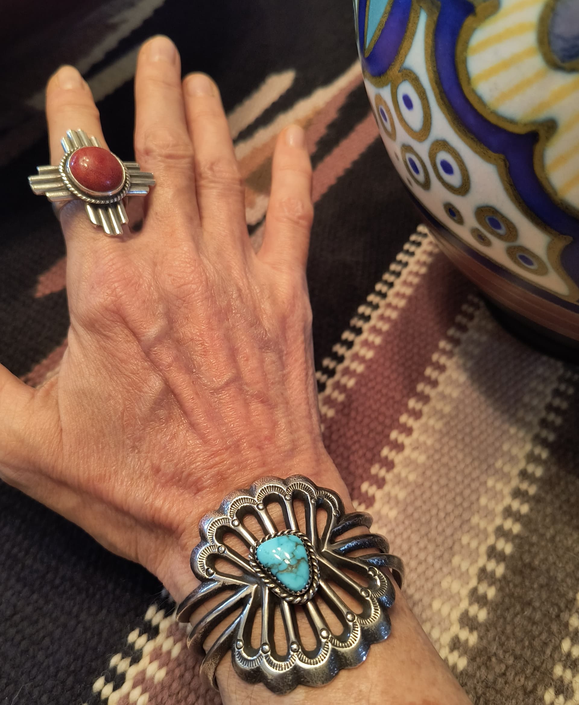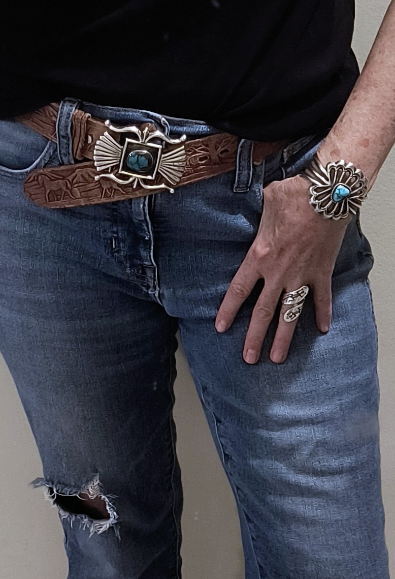 After I bought my cuff at the Market Sat, I went home and looked up the artist to learn more about his work. I was not familiar with him (although I’m not very up to date on artists), but talked to him and his son quite awhile before I purchased. I was not only impressed by their work, but also by how willing they were to spend time with me. I’m linking an excellent article with a great video inside. They don’t sell to galleries, and formed their own business called Dark Horse Navajo Jewelry. They sell through their site, on facebook, instagram, at art markets and such. Check them out!