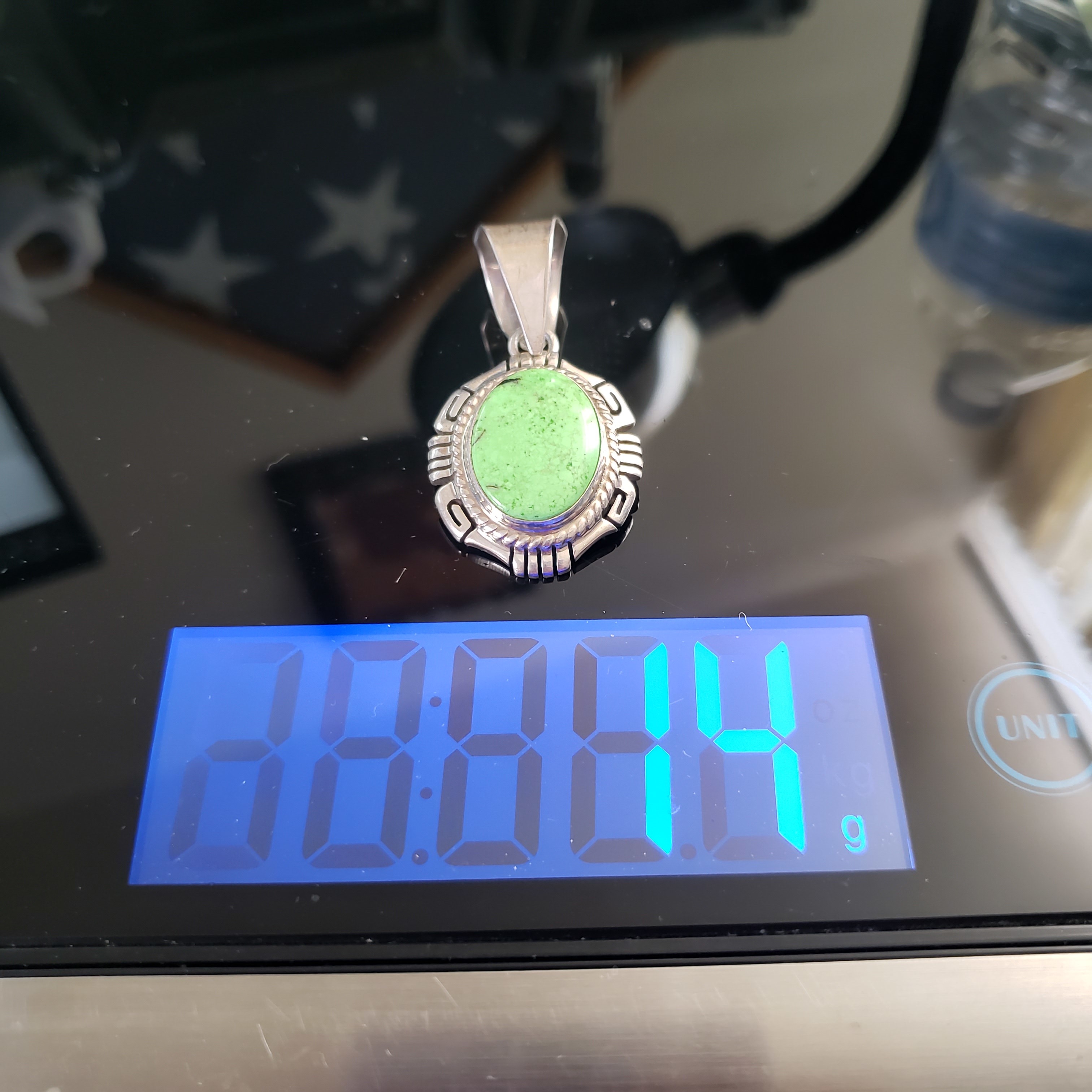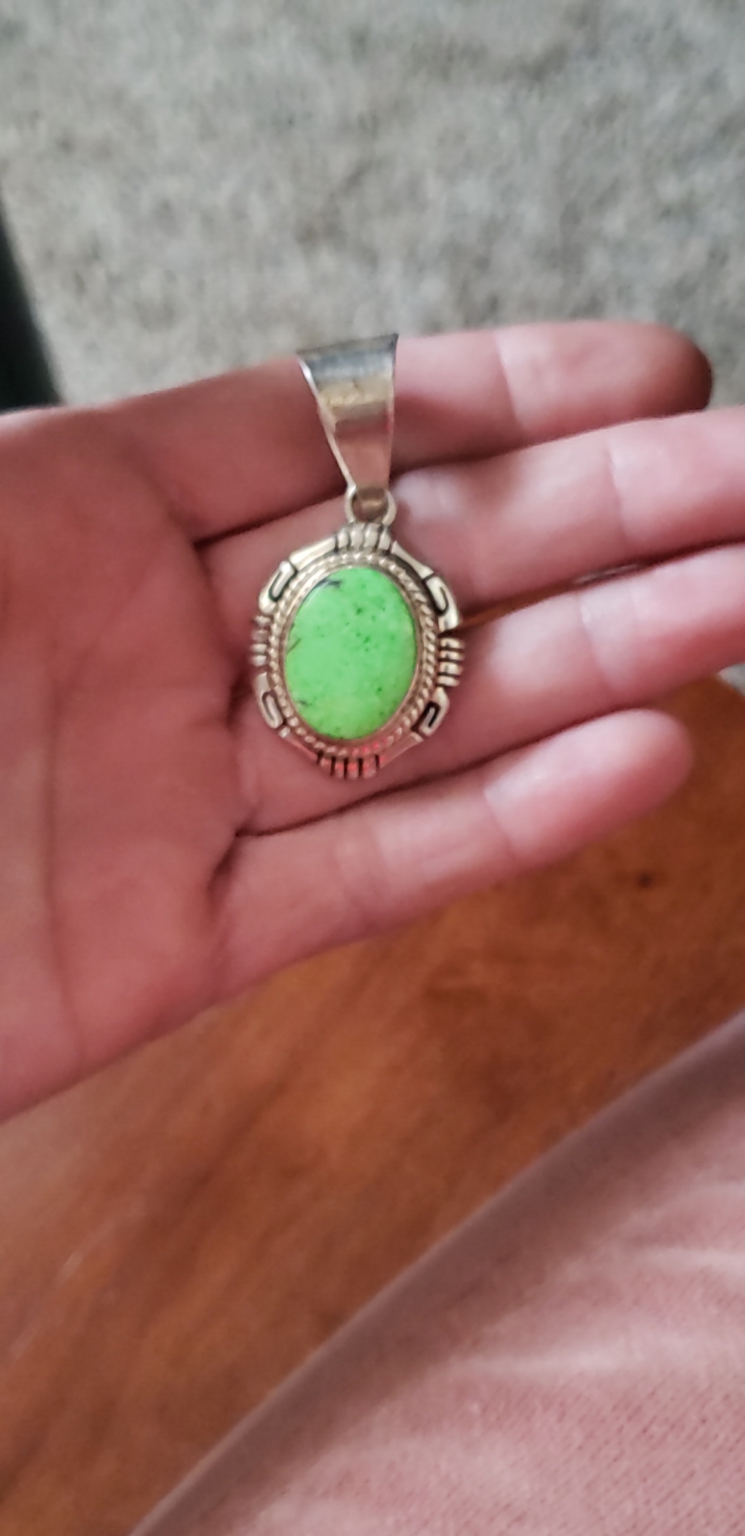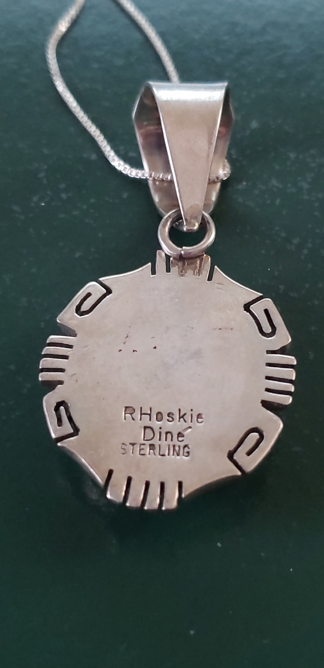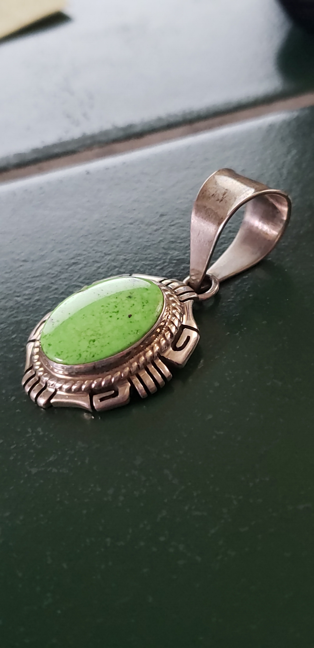 Ok so I tried to research this pendant and found several RHOSKIES! I could not find this mark though-also I was told the stone is either Gaspeite? or Turquoise-More ppl say Turquoise but I have never had a lime green one and no idea where it could have come from -any help is appreciated!