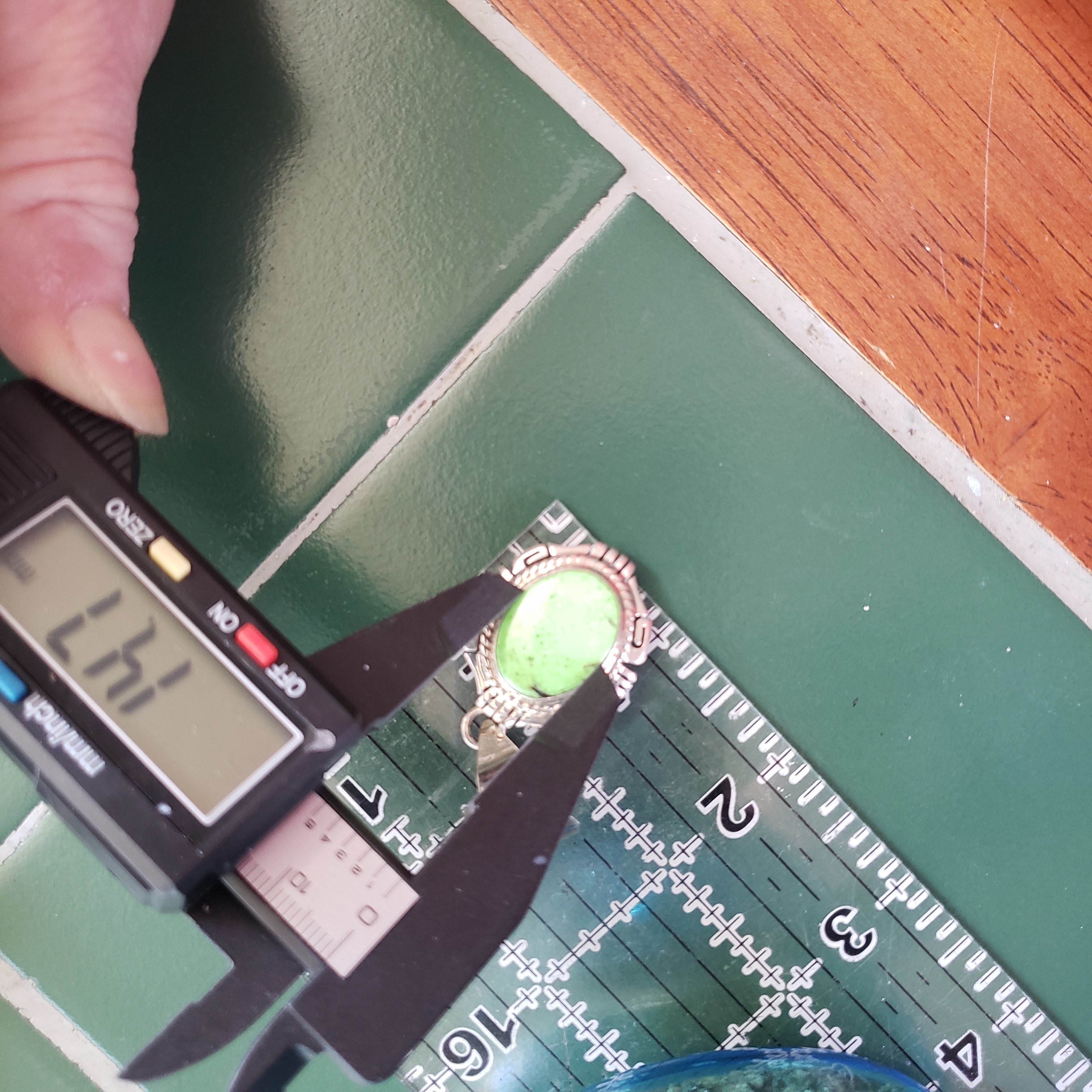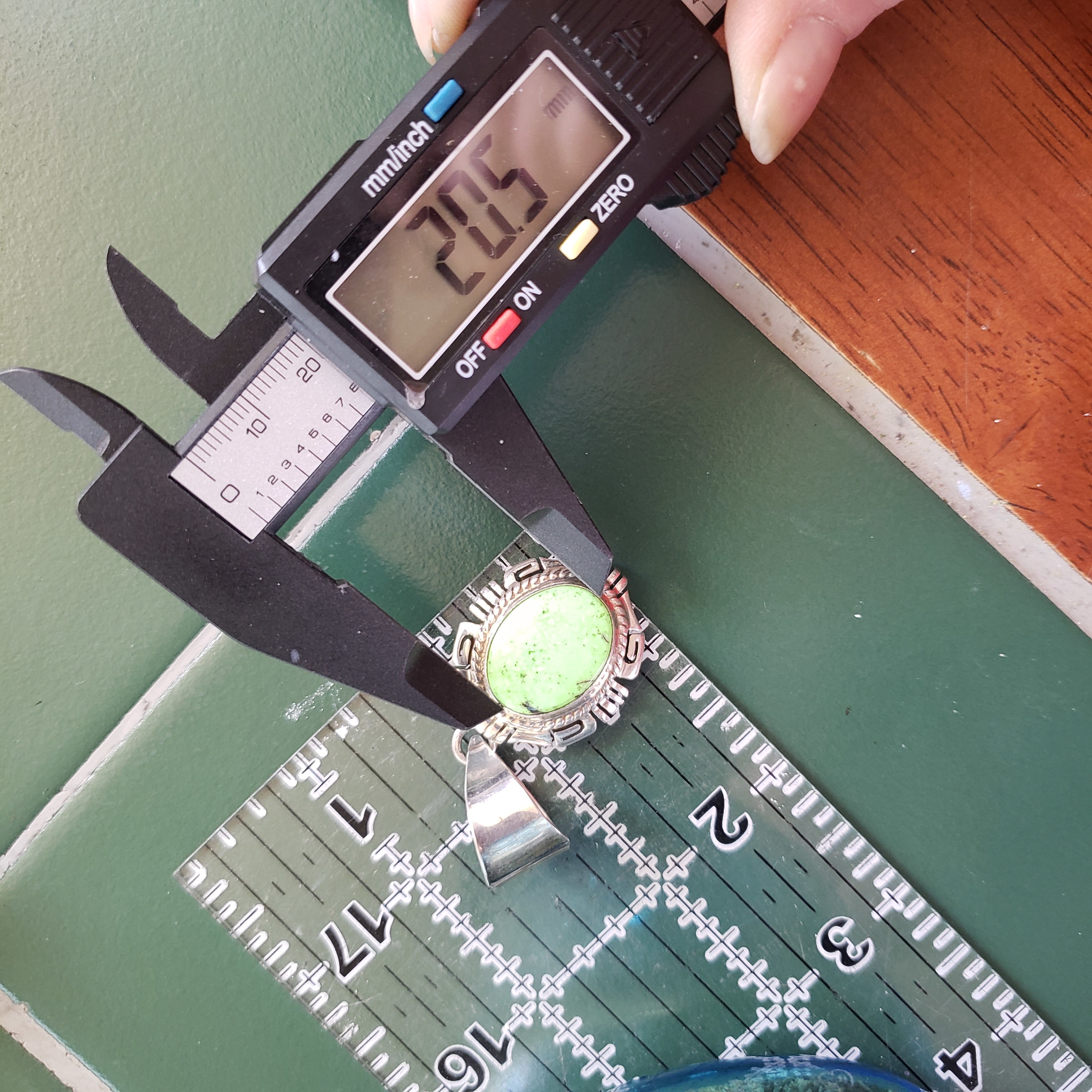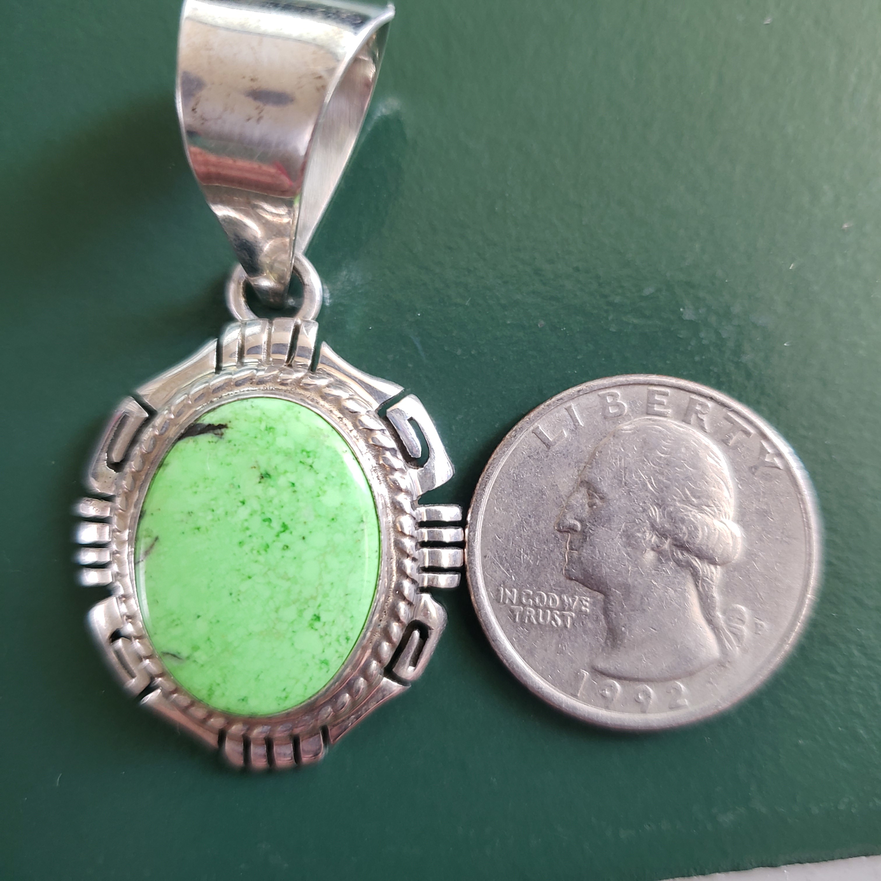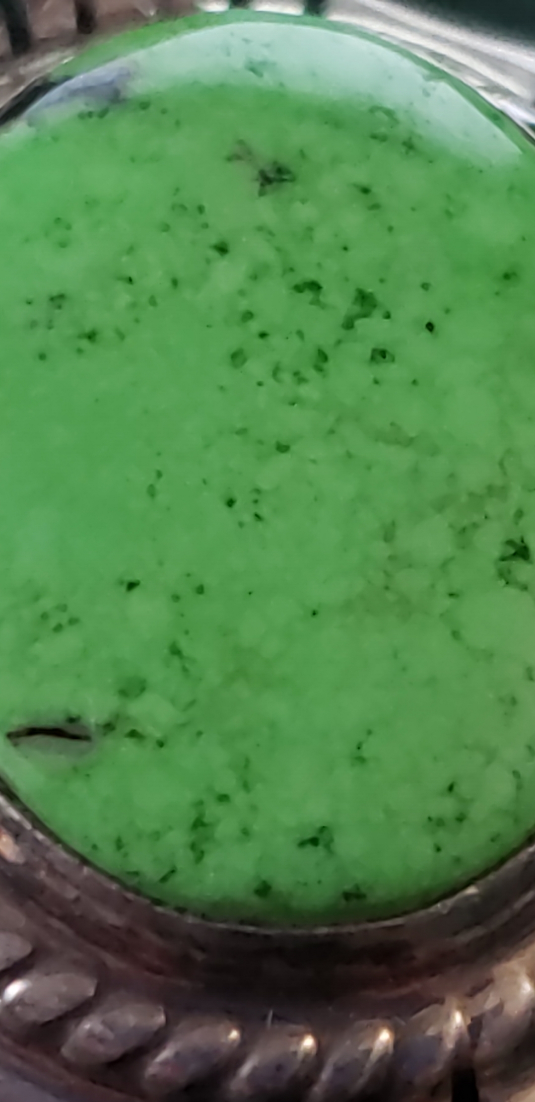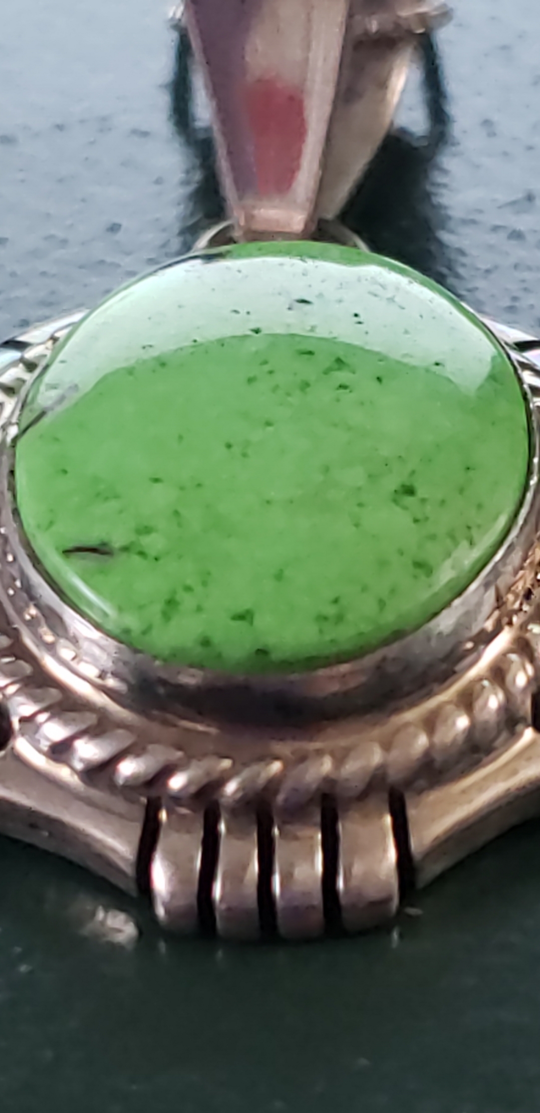 Ok so I tried to research this pendant and found several RHOSKIES! I could not find this mark though-also I was told the stone is either Gaspeite? or Turquoise-More ppl say Turquoise but I have never had a lime green one and no idea where it could have come from -any help is appreciated!