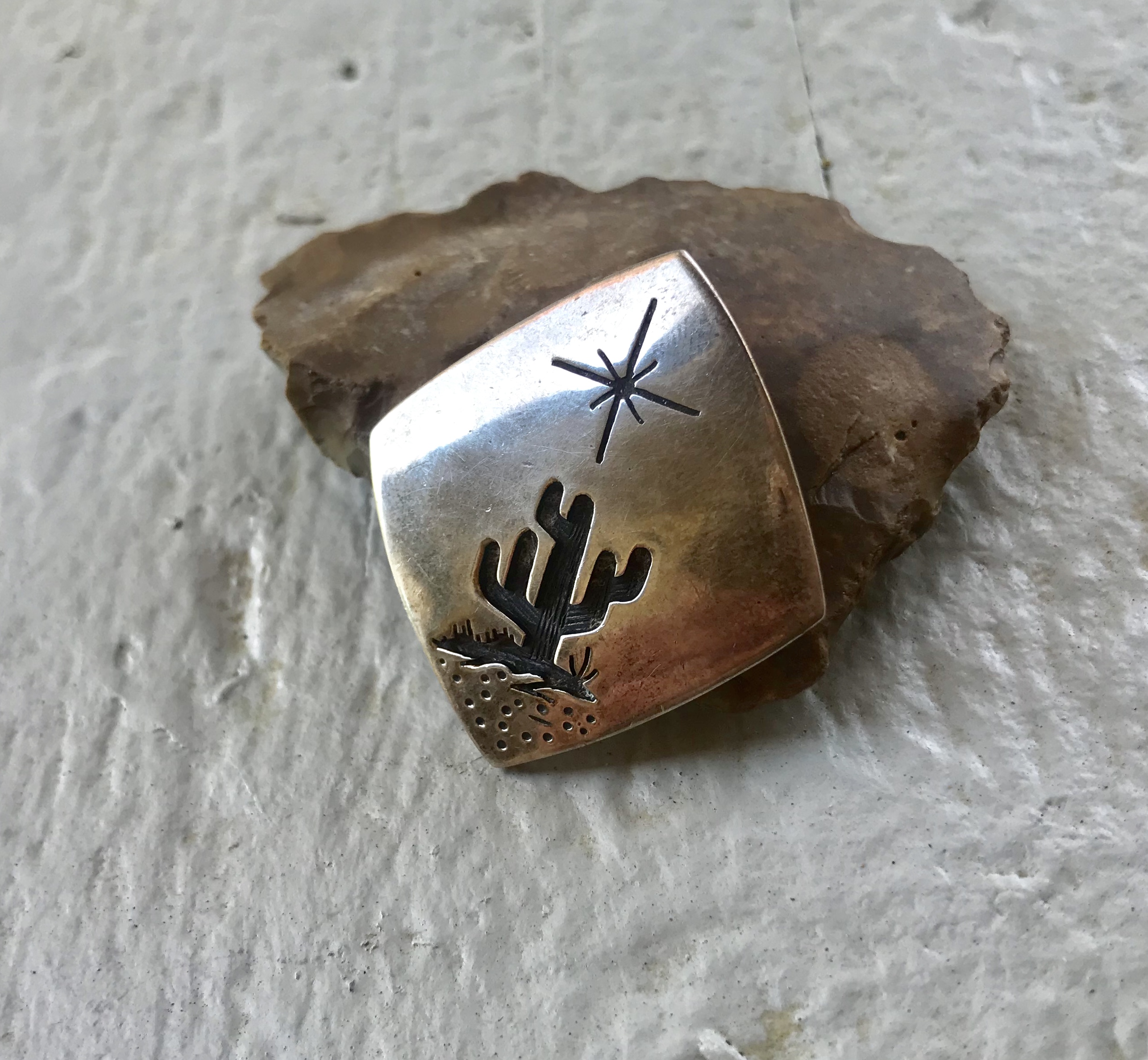 I purchased this pin because i love cactus imagery (which is hard to come by in Native jewelry). After researching it, I believe Rick Manuel is the artist. He is only one of two practicing Tohono O’odham (Papago) Silversmiths.