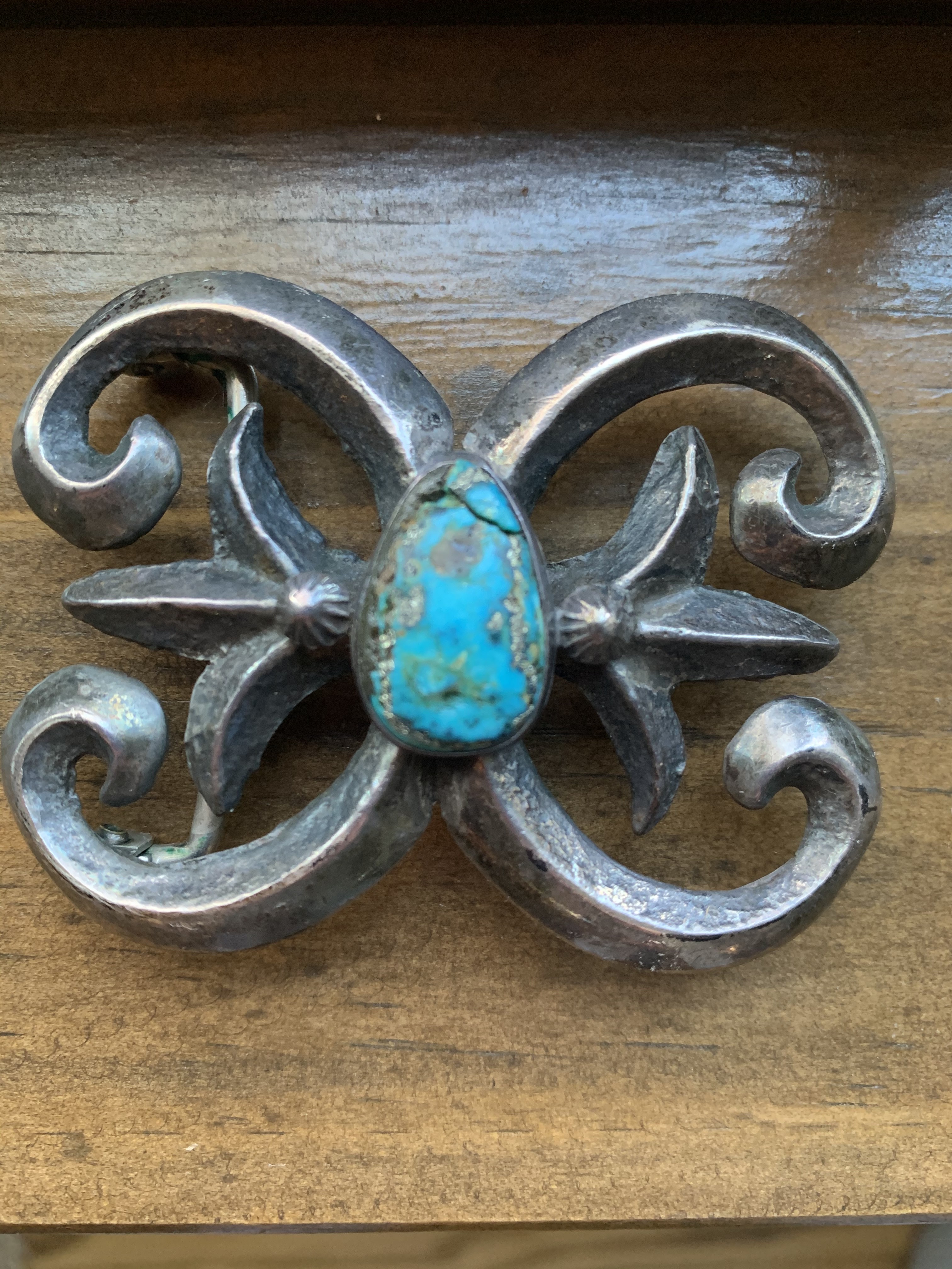 John Hornbeck was married to a prominent Native American Jeweler, Slivia Adakai. Interested in Native American Jewelry, He studied casting with Preston Monongye, a famous Native American Silversmith, and went on to establish himself as an important maker in his own right. He has worked for many years and produced many outstanding pieces. This piece is marked with “deer tracts”, his common mark.