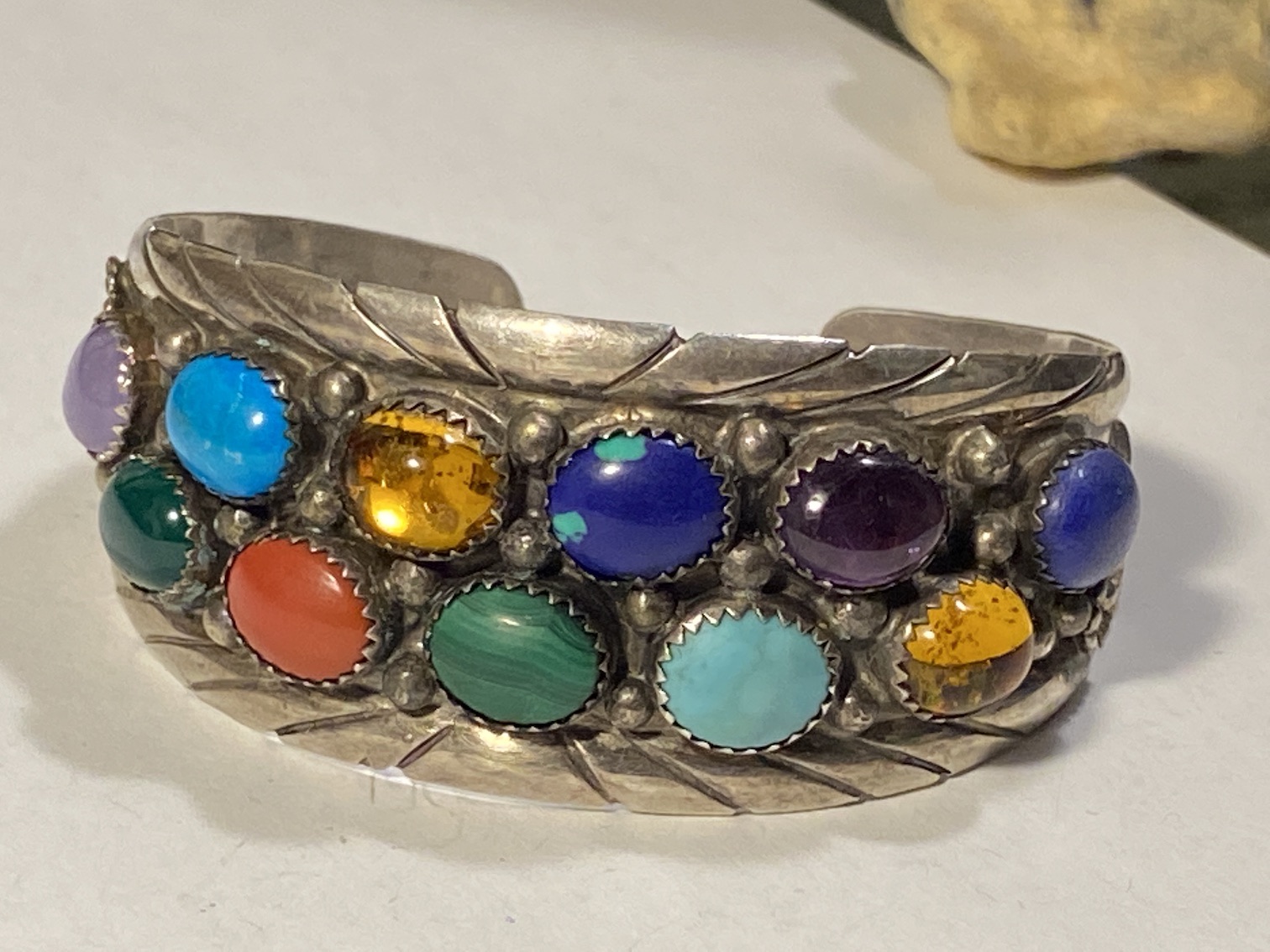 Hi what a WOW! Piece…I would definitely call this Native American late 70’s or 80’s style Navajo or Zuni work but its definitely different with all the various gemstones(malachite, larimar, red jasper or red coral, bumblebee jasper, amber, malachite/azurite, amethyst, turquoise, lapis lazuli, Chalcedony? Light translucent purple and maybe jade) they used…maybe a custom job based on that…the mark is a hard one though because it appears as though its partially rubbed away …maybe an A and then??? Hopefully that gives you a few new clues to do some sleuthing on google and the books😉