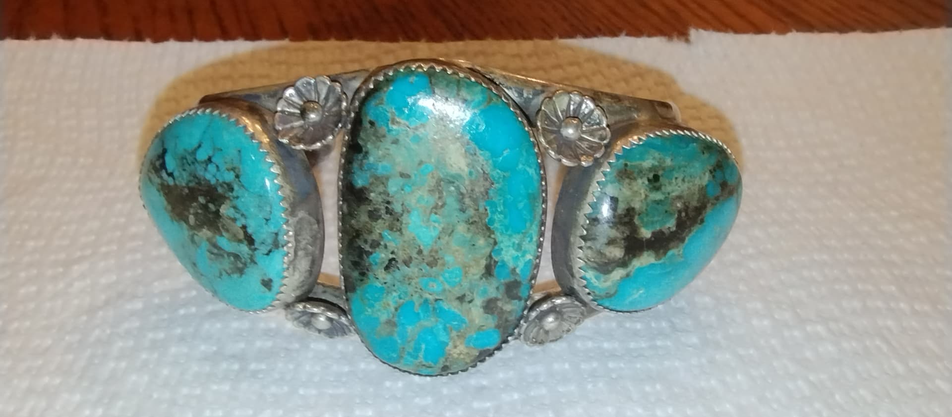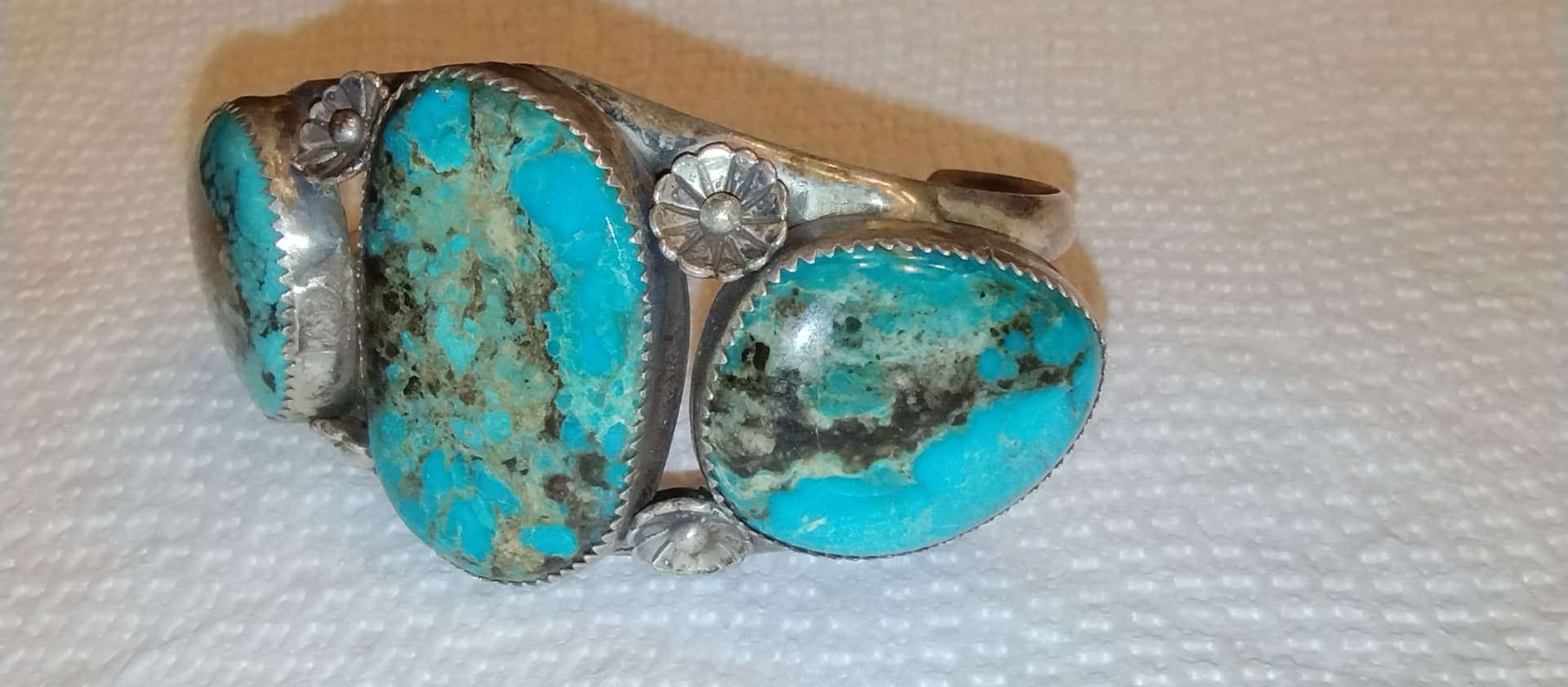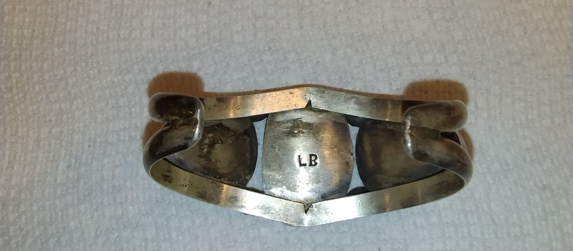 Cuff #1 (Three stones with flowers, sawtooth bezels, sterling/unmarked, hallmark “LB”): I believe is made by Leo Burnside based on the hallmark, but please confirm. It is sterling but isn’t marked as such. I would like to know 1) the origin mine of the stones and 2) approximate age.