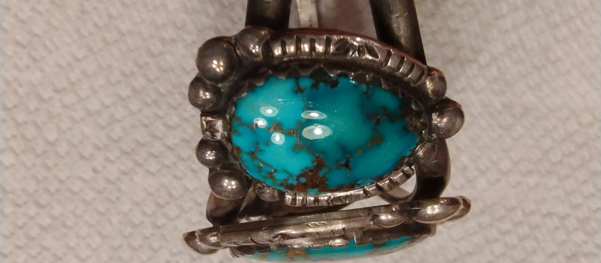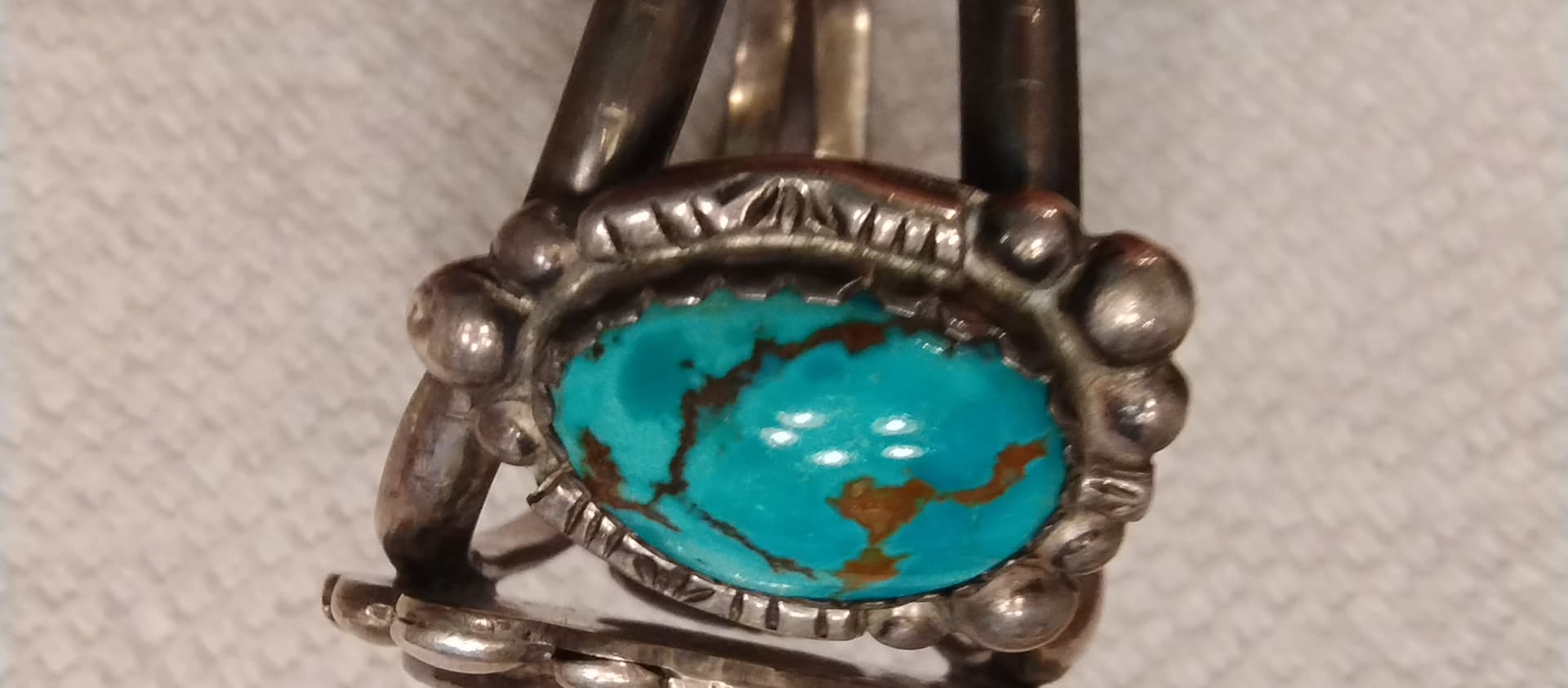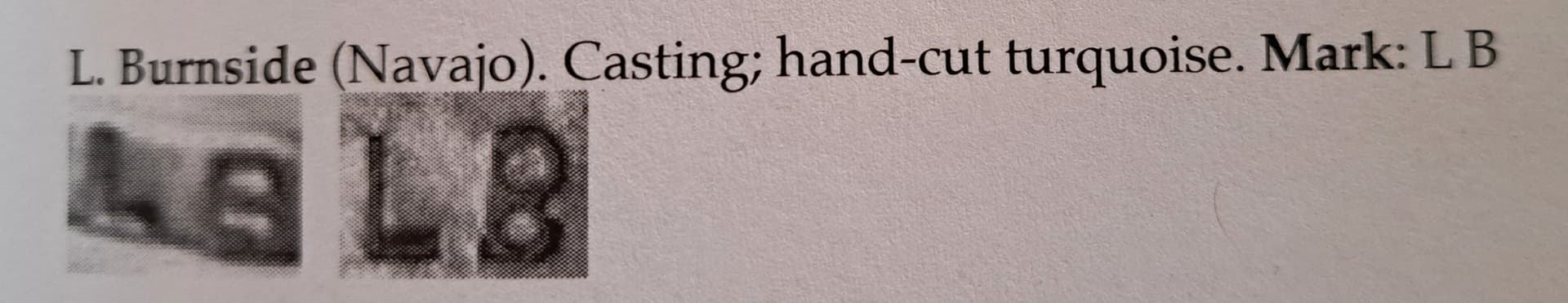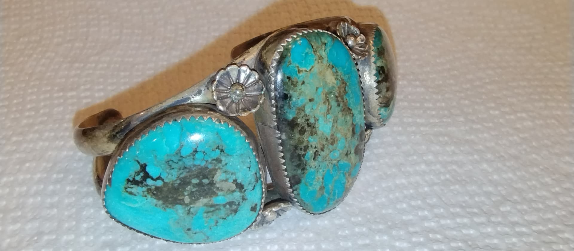 Cuff #1 (Three stones with flowers, sawtooth bezels, sterling/unmarked, hallmark “LB”): I believe is made by Leo Burnside based on the hallmark, but please confirm. It is sterling but isn’t marked as such. I would like to know 1) the origin mine of the stones and 2) approximate age.