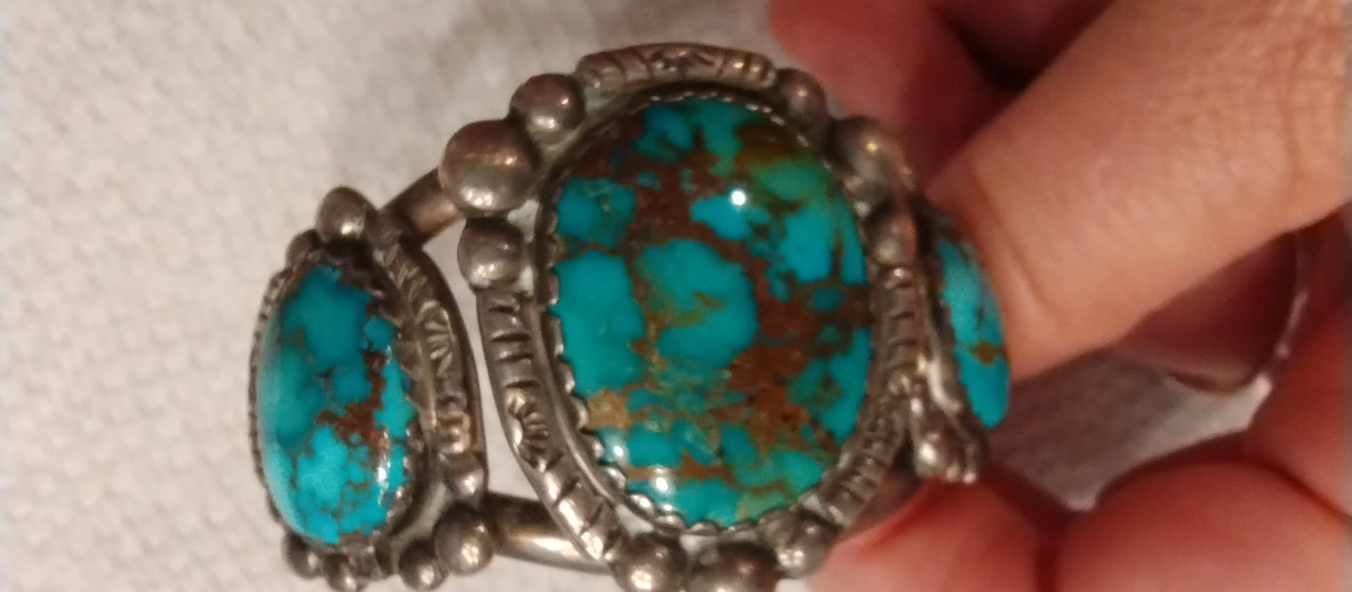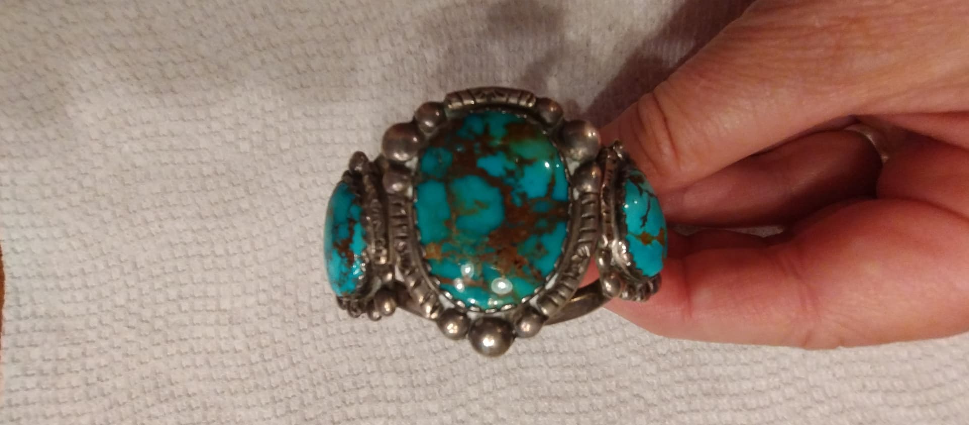 @mjbrindlebull Those are 2 really nice cuffs with terrific turquoise. My guess on the 3-stone cuff is maybe 1980s, 1990s. The other cuff maybe 1970s. I have a book I’ll check for the “LB” hallmark. On the other cuff, it looks like a hallmark to me & not just random scratches (kind of like a tic-tac-toe design). Unless you have good provenance for the turquoise, it’s very challenging to determine the type or the origin mine.
