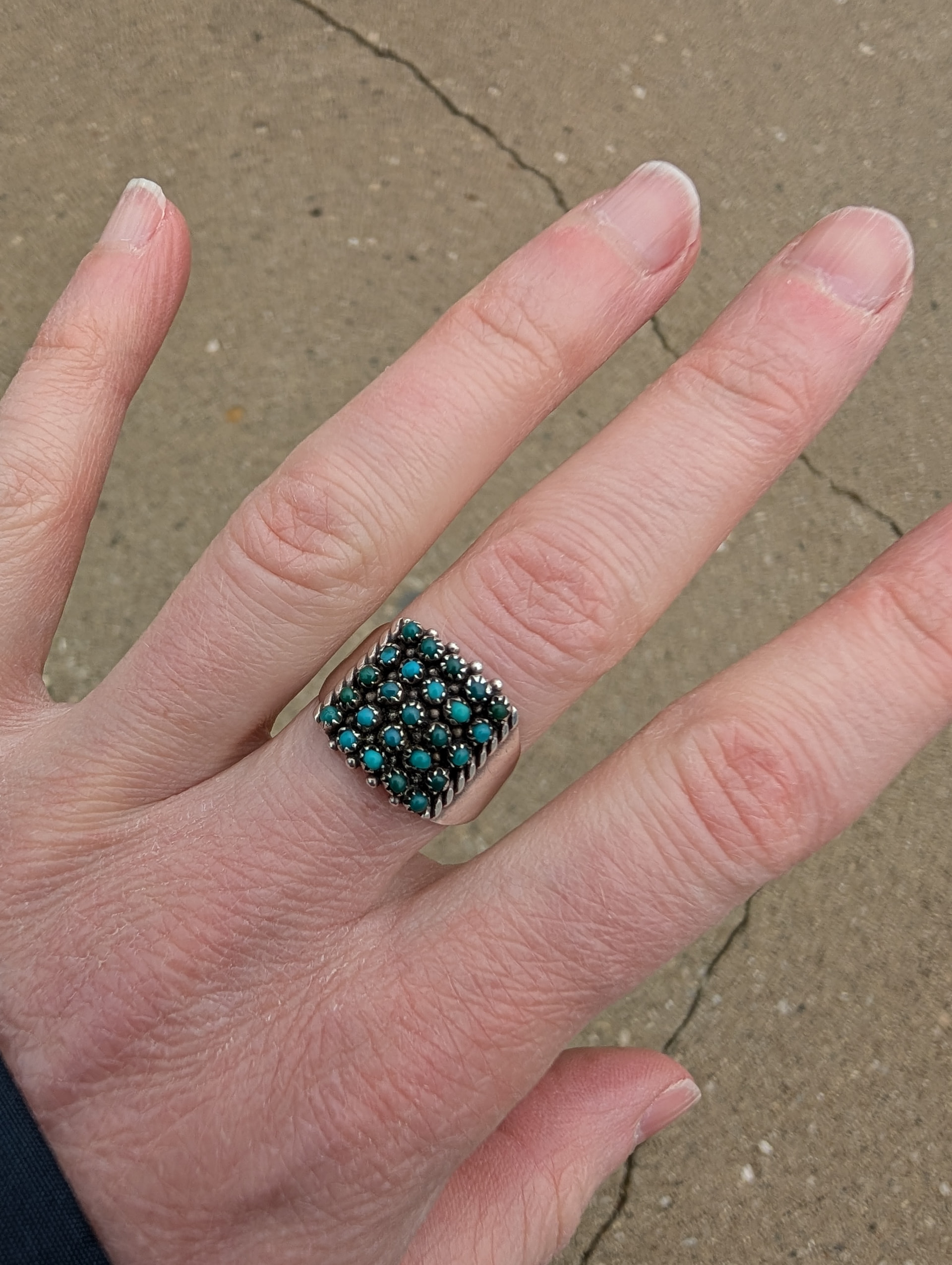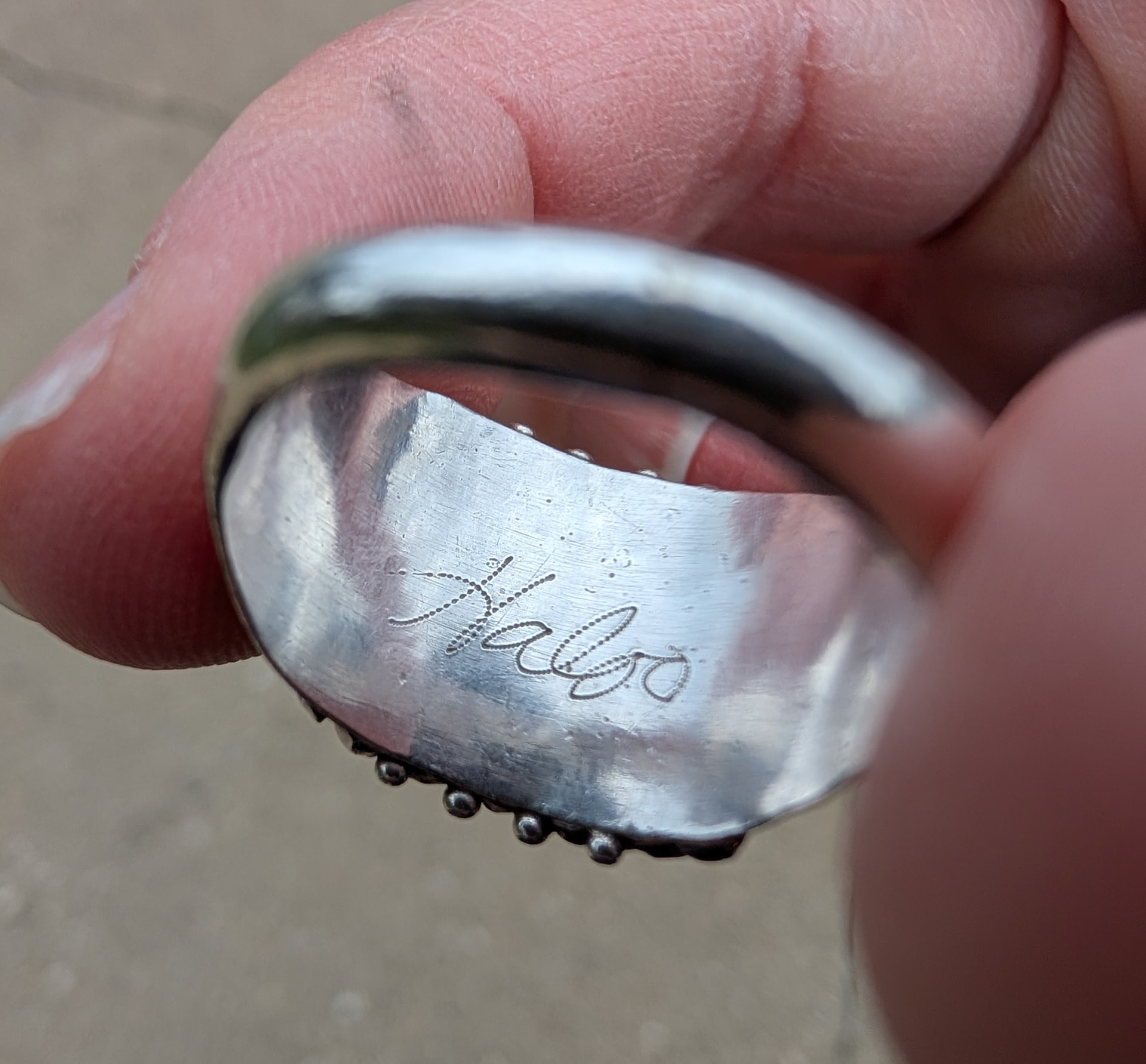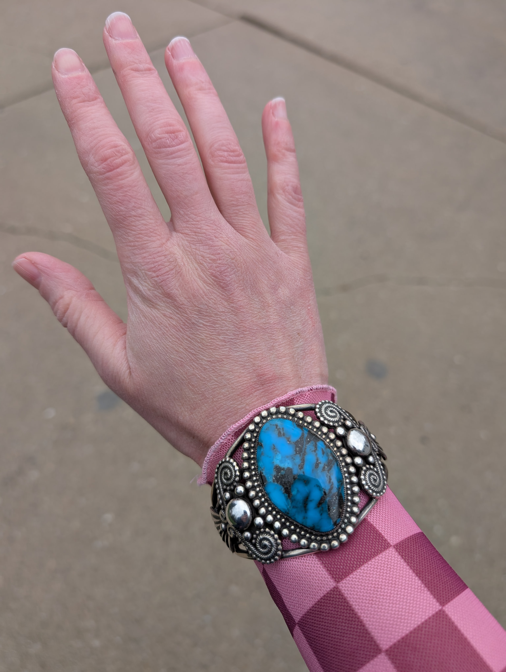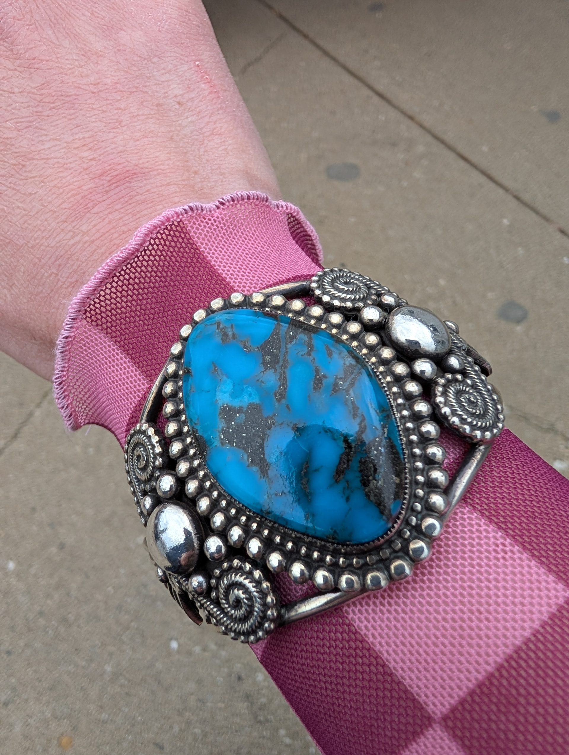 My first Native American jewelry purchase was a Rick Martinez cuff, and it still holds a special place in my collection. I love the intense blue, and there are very small specks of pyrite in the matrix. The cab has backing and it looks to be stabilized. I don’t know the cab’s mine origin. The cuff is admittedly a bit large on me, but I may add some backing. That said, I don’t mind the size since it works well over long sleeves.