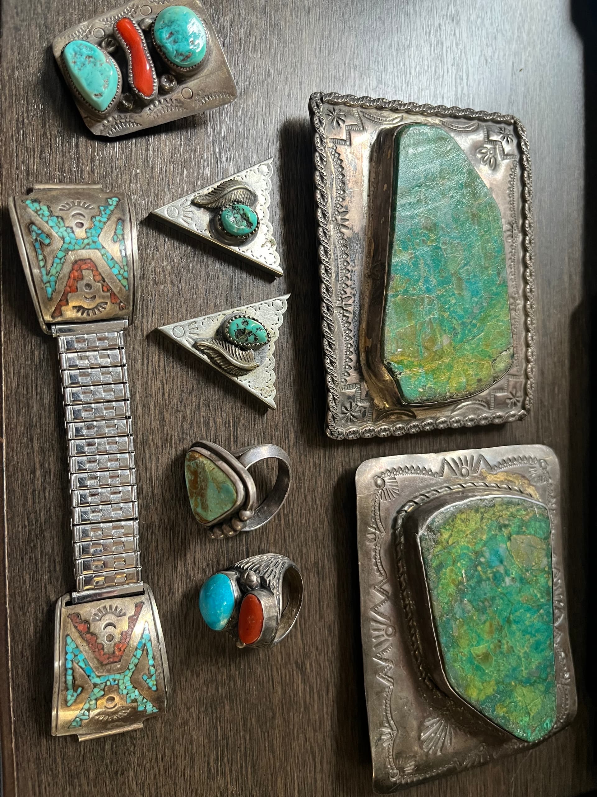 These are some other pieces I’ve had since I was a kid over 50 years ago. The 2 belt buckles were supposedly made by my grandfather on my dad’s side. The stones were ones he sourced on his property in Arizona, he said that it was not turquoise, it was chrysocolla. The other stuff I don’t recall where I got it but probably grandparents. Some have marks “NL” and “NM or WN”.