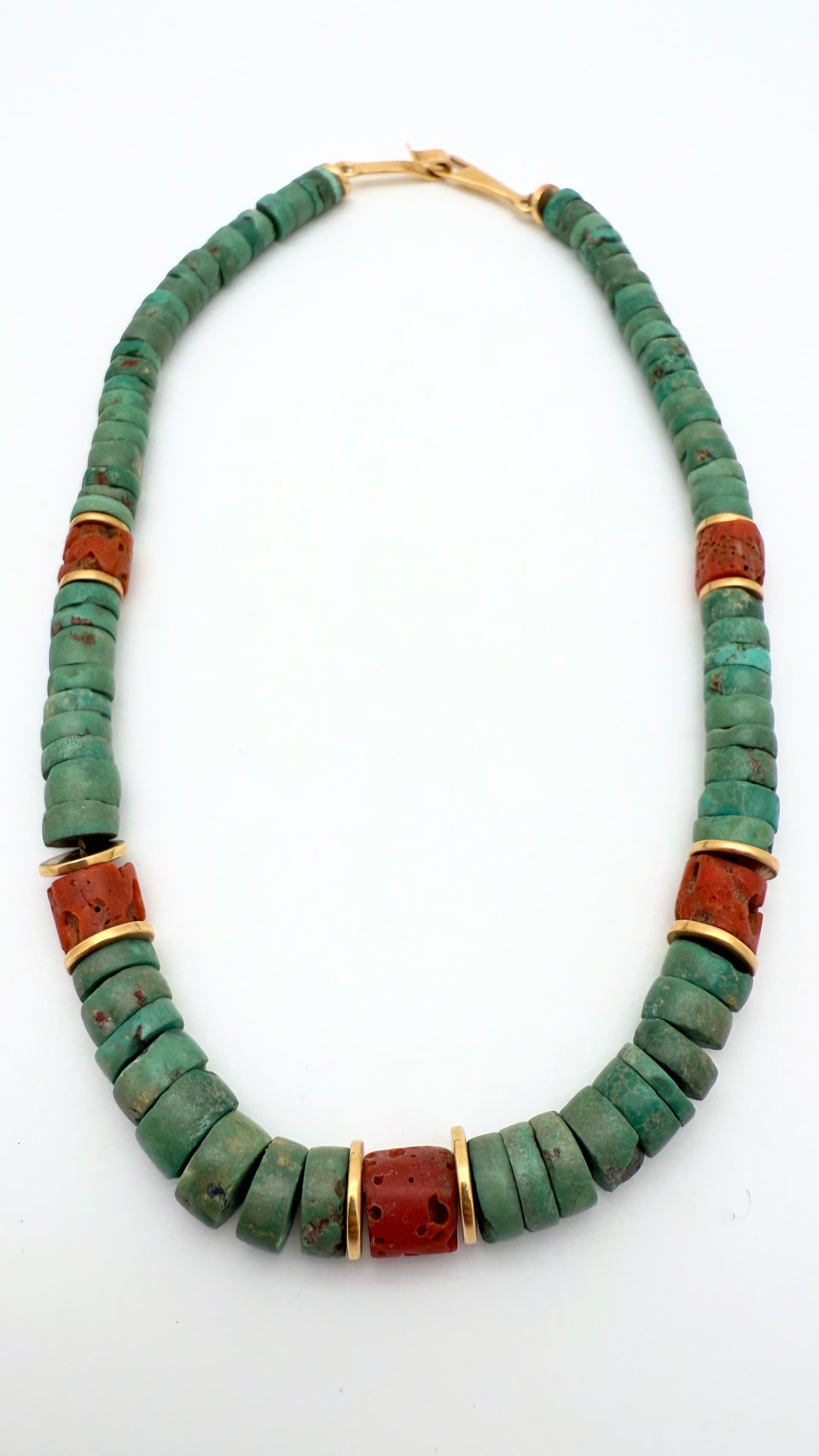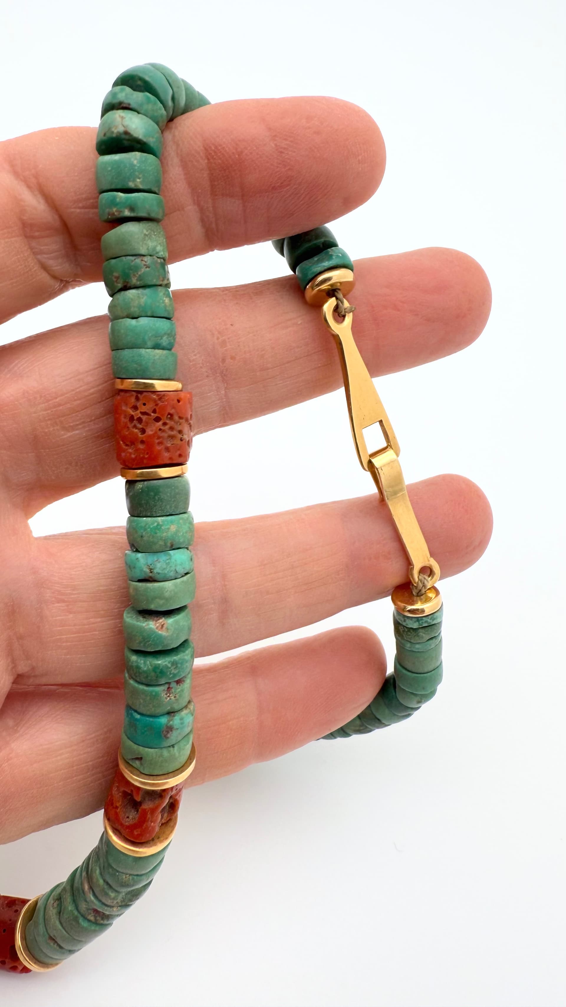 This beautiful necklace was in the jewelry case at my local thrift. Without even touching it I said I would take it. I don’t know a thing about its provenance, and will never know as there is no makers marks. What I do know is that the gold bits tested greater than 18 and I still see a line with 22 acid. Will have to have that verified. But it’s a rather hefty handmade clasp. The beads are strung on a cord. I’m sharing as this one should be shared but I don’t know a thing about its maker or wearer before me. Don’t even know if it was made by native hands or not. But I love it so.