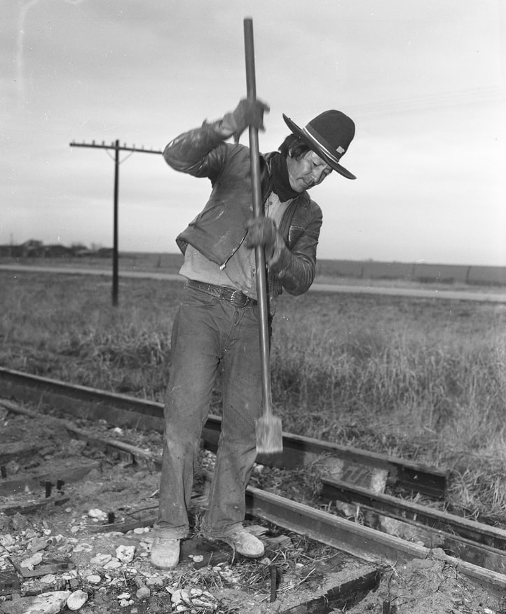 Ashishie, a Navajo man, was one of sixty six Navajo at the Santa Fe Railway’s track working camp west of Cleburne in 1945. The men were brought in as temporary workers during a manpower shortage brought on by WWII. This photo appeared in the Fort Worth Star-Telegram on February 11, 1945.