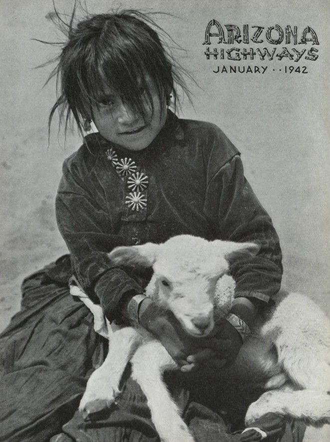“The young miss of our cover is Hosteen Cly Bit-sui, a Navajo maiden of eight pleasant years, who lives in the Valley of Grandeur, Monument Valley, Arizona-Utah. Her charming portrait is the work of Joseph Miller, whose works have graced these pages many times these past few years.”