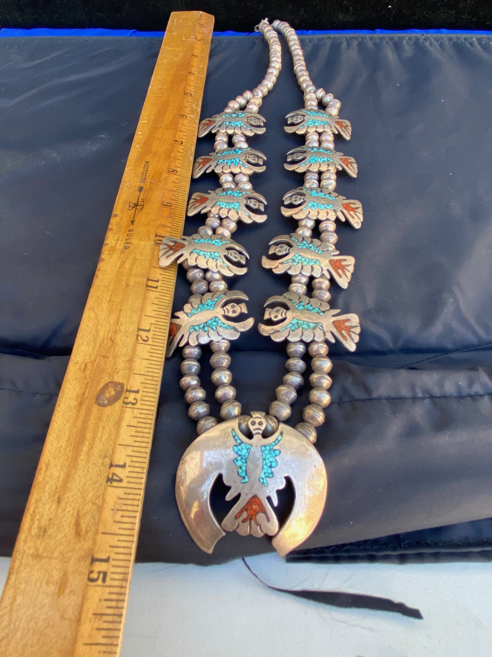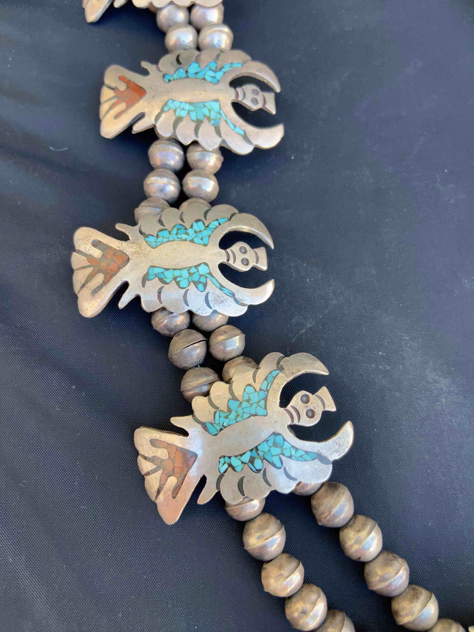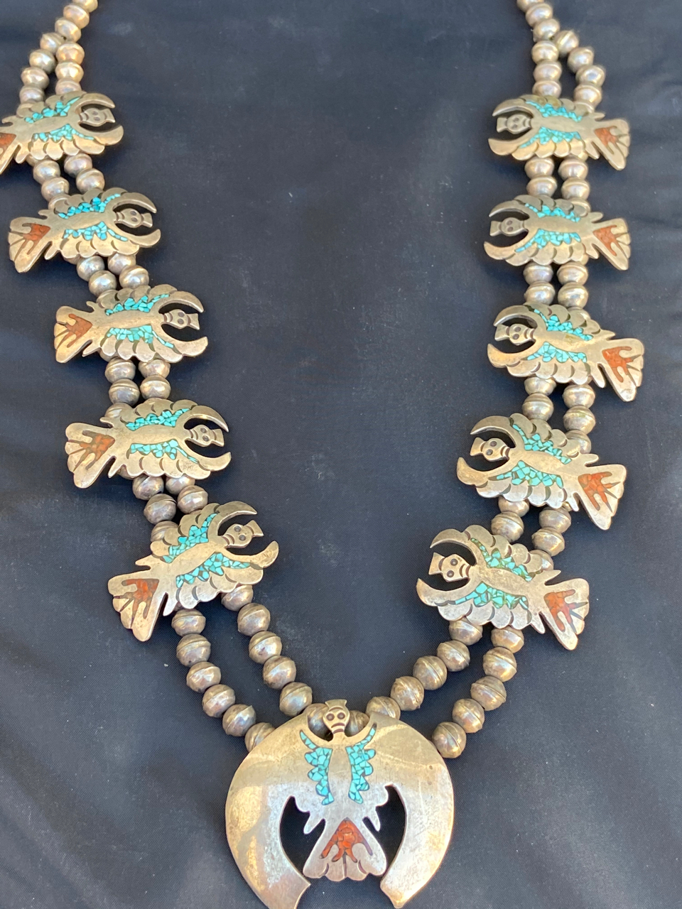 This item is a squash blossom necklace , it appears to be silver with chip inlay with turquoise and coral. Looks to about 15" long. The clasp end is closed off by metal/silver? not string. There are no Hallmarks or markings that I could see. This item has been sitting in an estate for about 30 or 40 years? My father in law is from Arizona, just south of Flagstaff. As an aside, He was aquainted with the fellow who is credited with taking the idea for navajo code talkers to the military during WWII, interesting story. Anyway, i’ve included some photos. Hopefully they’ll be clear.