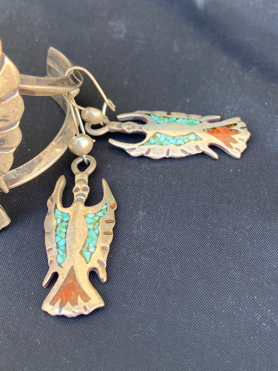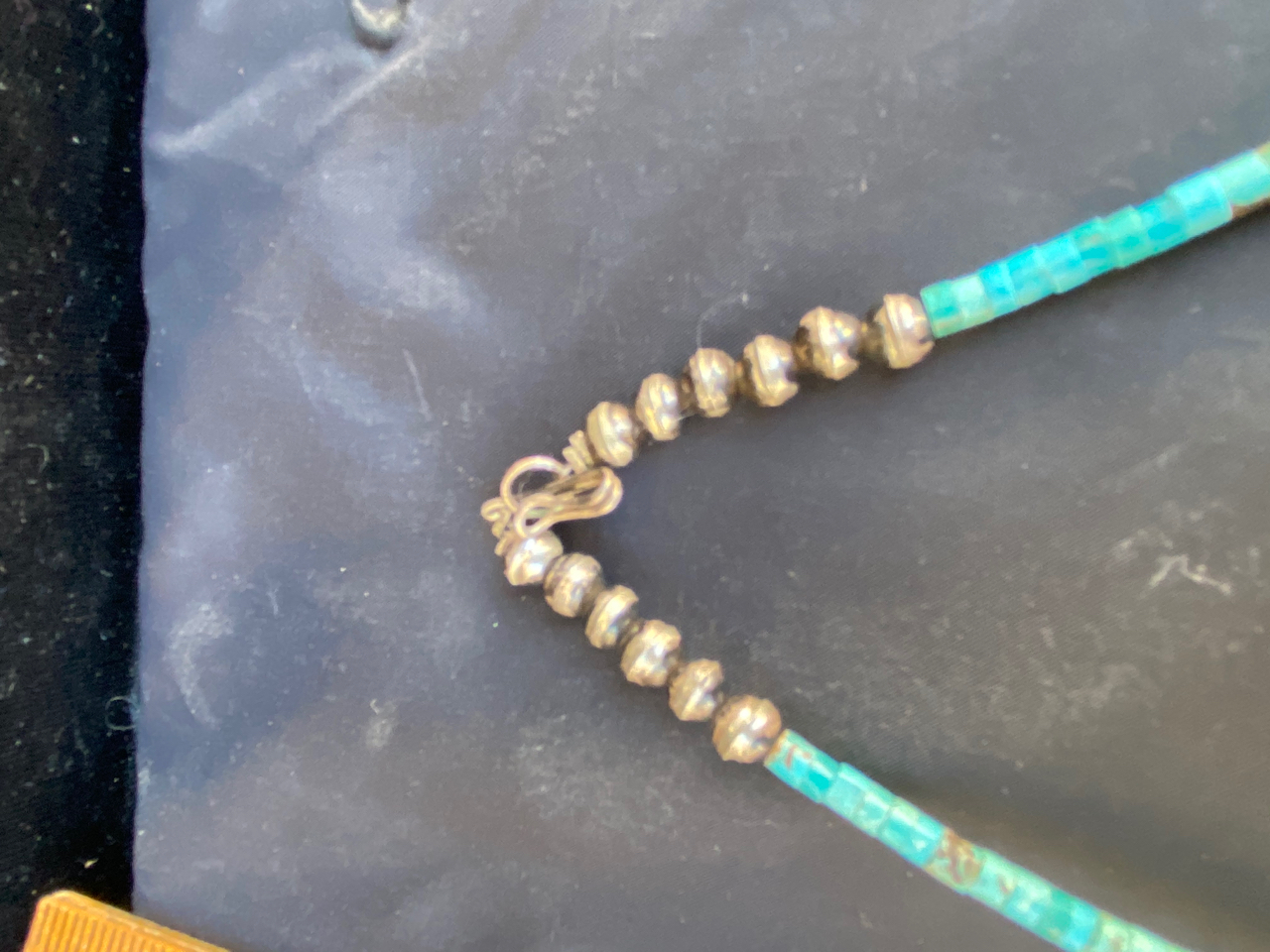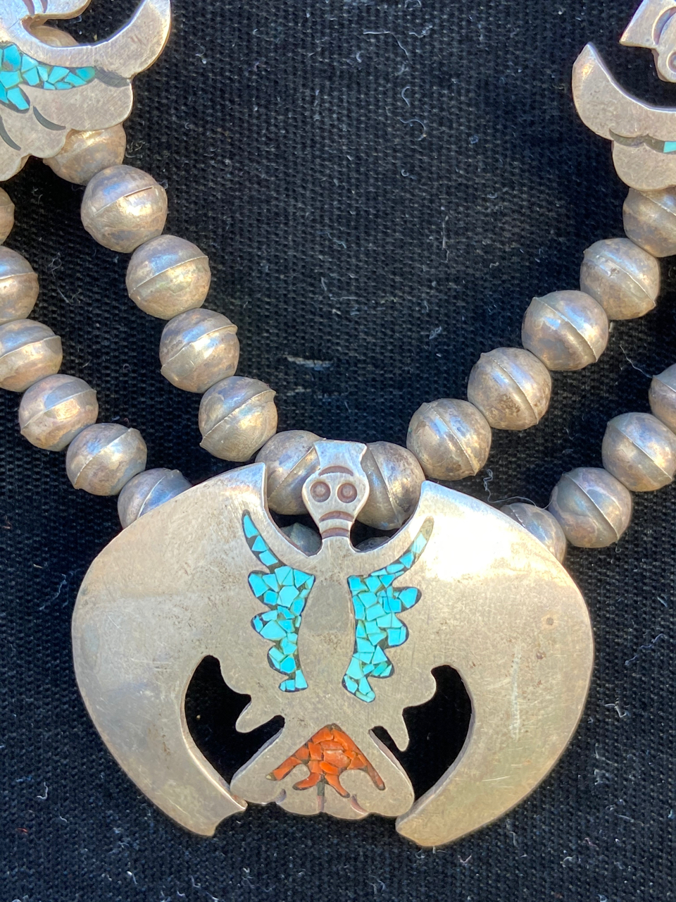 This item is a squash blossom necklace , it appears to be silver with chip inlay with turquoise and coral. Looks to about 15" long. The clasp end is closed off by metal/silver? not string. There are no Hallmarks or markings that I could see. This item has been sitting in an estate for about 30 or 40 years? My father in law is from Arizona, just south of Flagstaff. As an aside, He was aquainted with the fellow who is credited with taking the idea for navajo code talkers to the military during WWII, interesting story. Anyway, i’ve included some photos. Hopefully they’ll be clear.