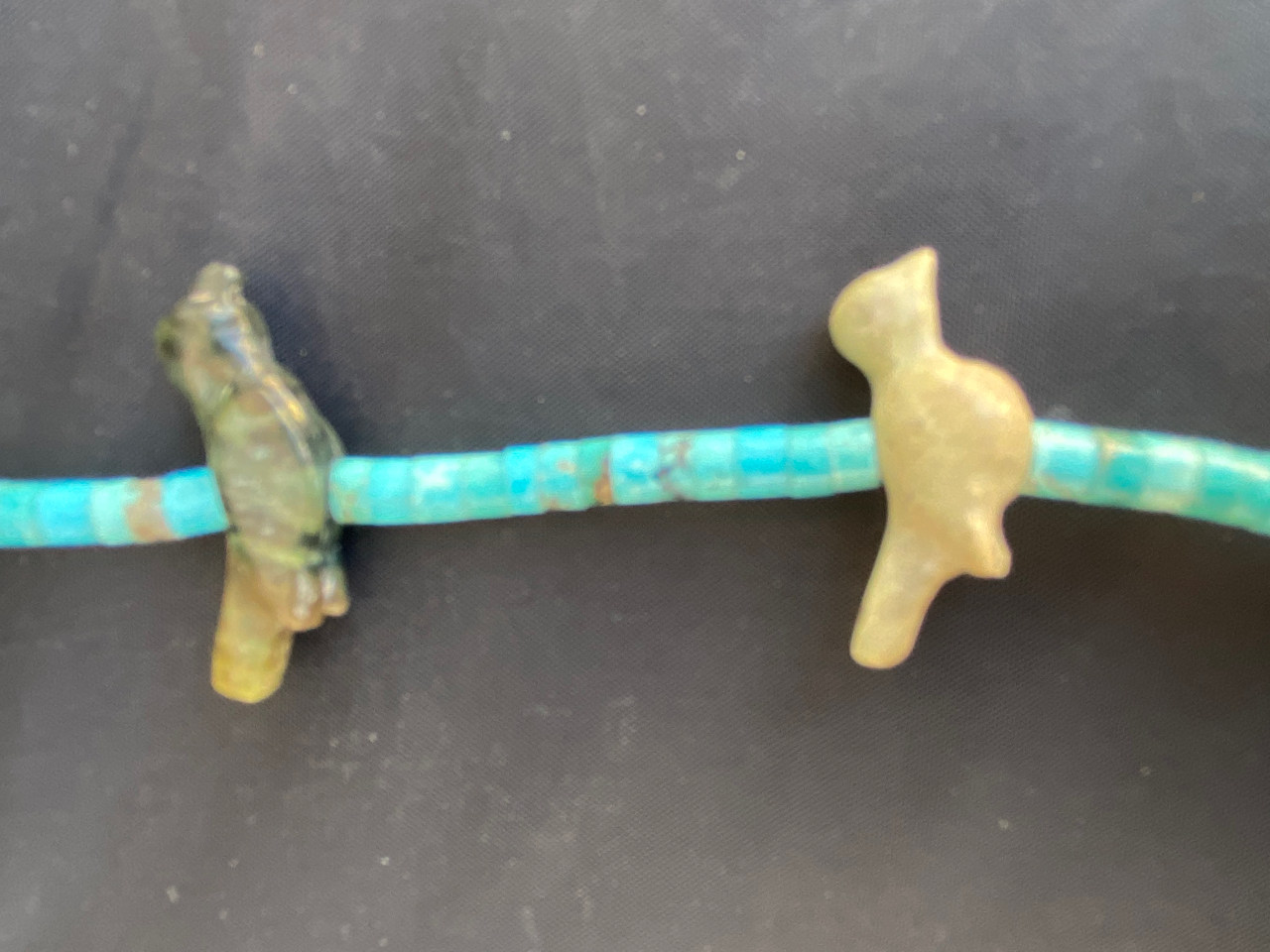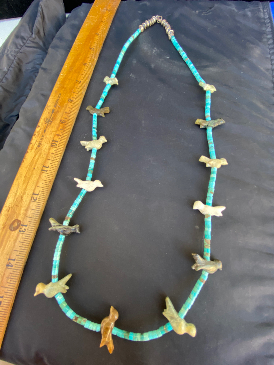 Heishe are tube (or disc) shaped beads that are ground smooth on stone. The turquoise beads on your necklace would be considered heishe. Often it is made from shell and can be made from other stones besides turquoise as well. The fetishes are the carved birds (or other animals). So your necklace could be described as turquoise heishe with bird fetishes.