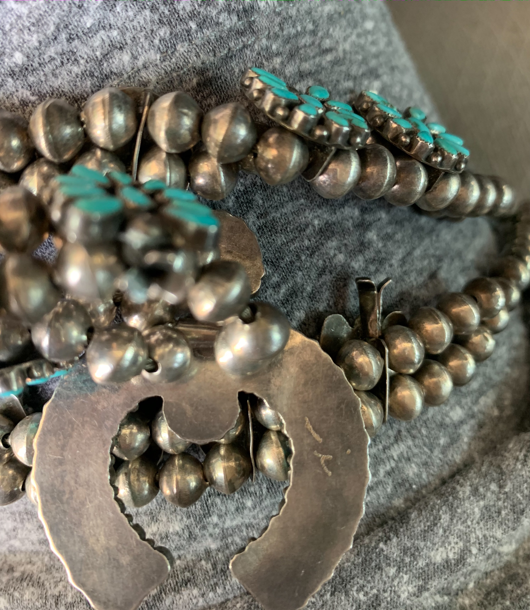 Welcome to Turquoise People. This is a very nice Zuni squash blossom necklace. I can’t make out the mark, reminds me of Irene Palyusi work. Would call this 80s. Don’t know what you paid but would expect to see this around $2000 - $2500.