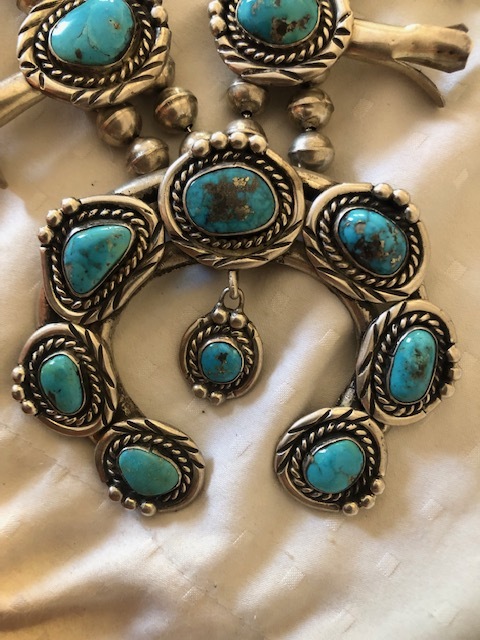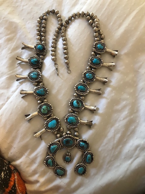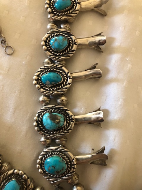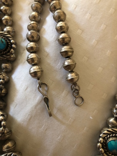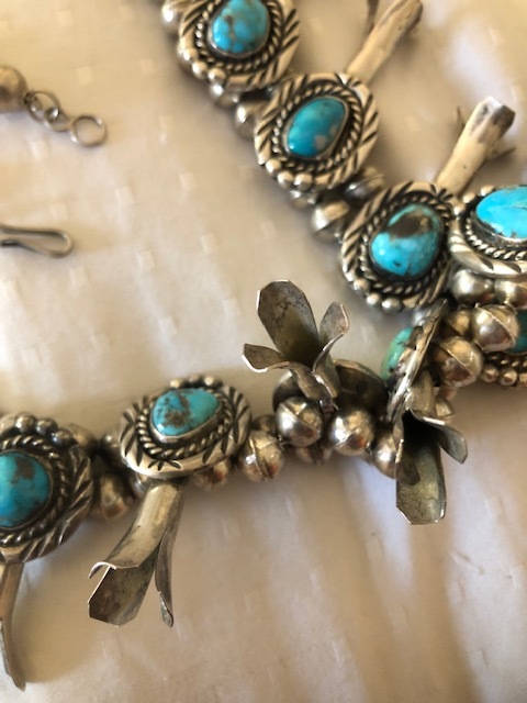 I have always wanted a squash blossom necklace so my boyfriend bought one for me but I can’t figure out if it is real or not. It does not stick to a magnet at all. The stones have roughness where they should. The seller told him it was old pawn from the 1970s and the stones were most likely Morenci Turquoise because of the color and the presence of pyrite. It has one marking of “BT” on the back of the Naja. I can’t seem to find anyone to authenticate anything about it in Florida. It appears to have been polished and cleaned which is part of my hesitation although the inside of the squash blossom beads appears to be dirty and tarnished. Any assistance is appreciated.