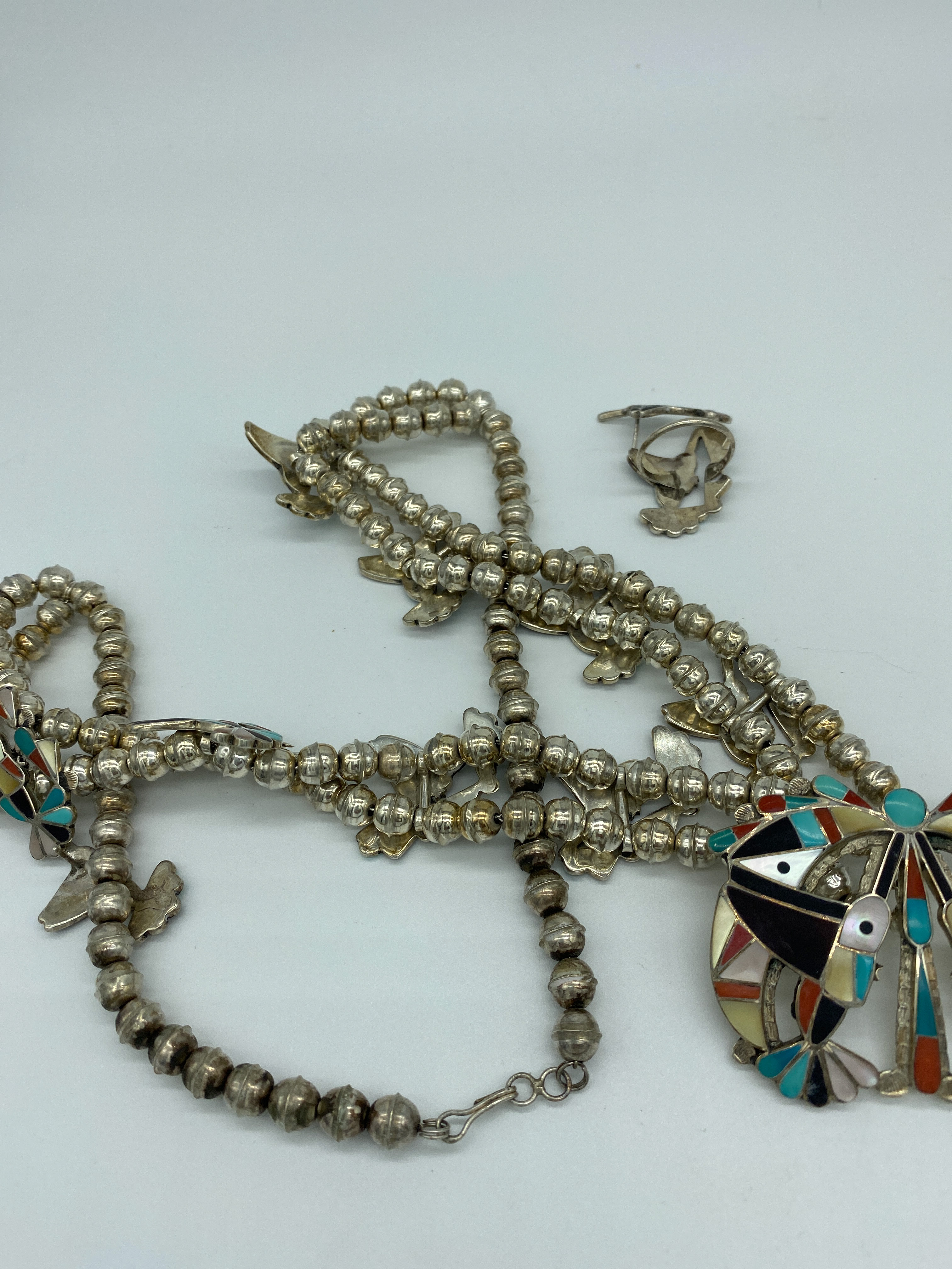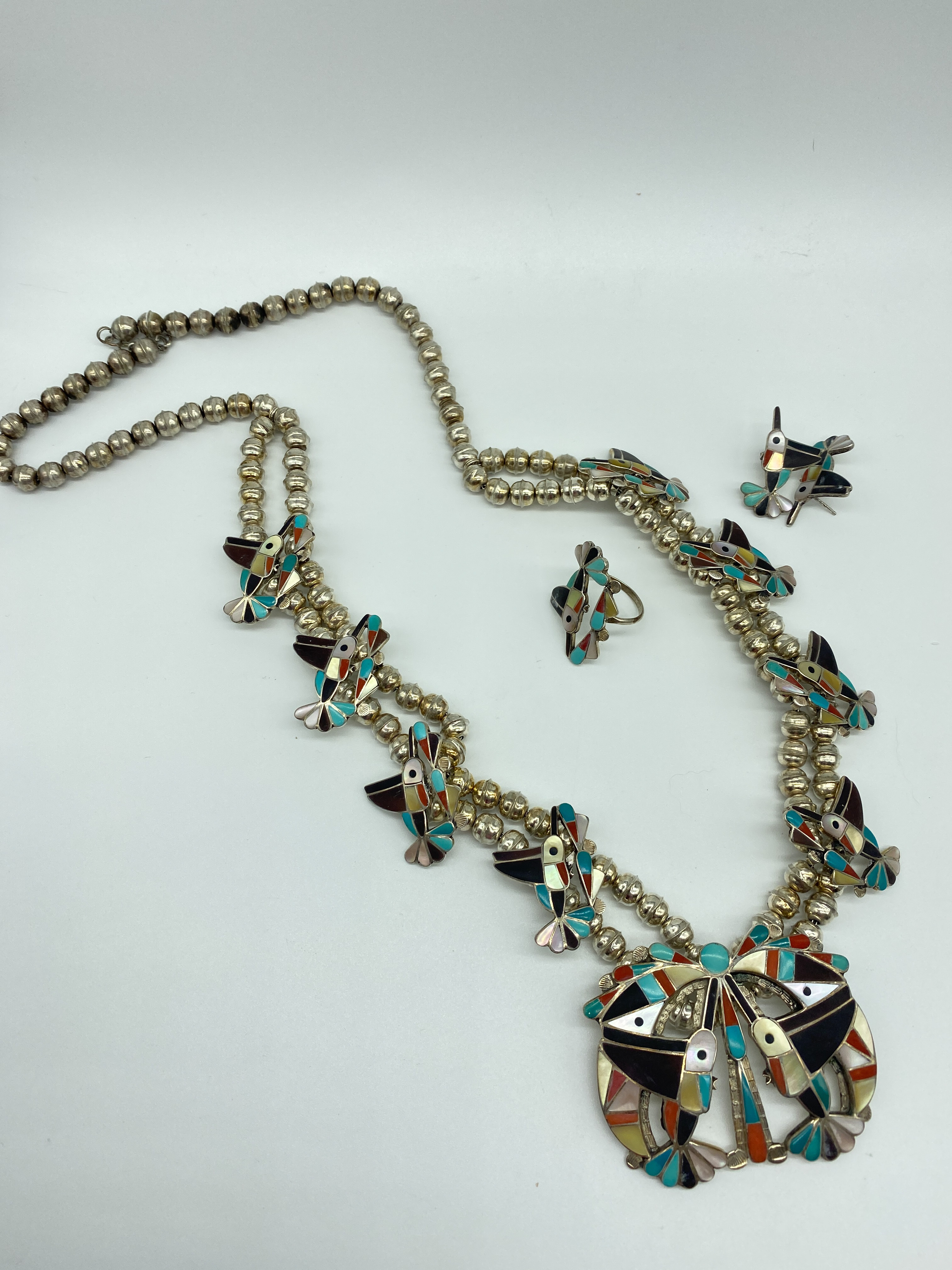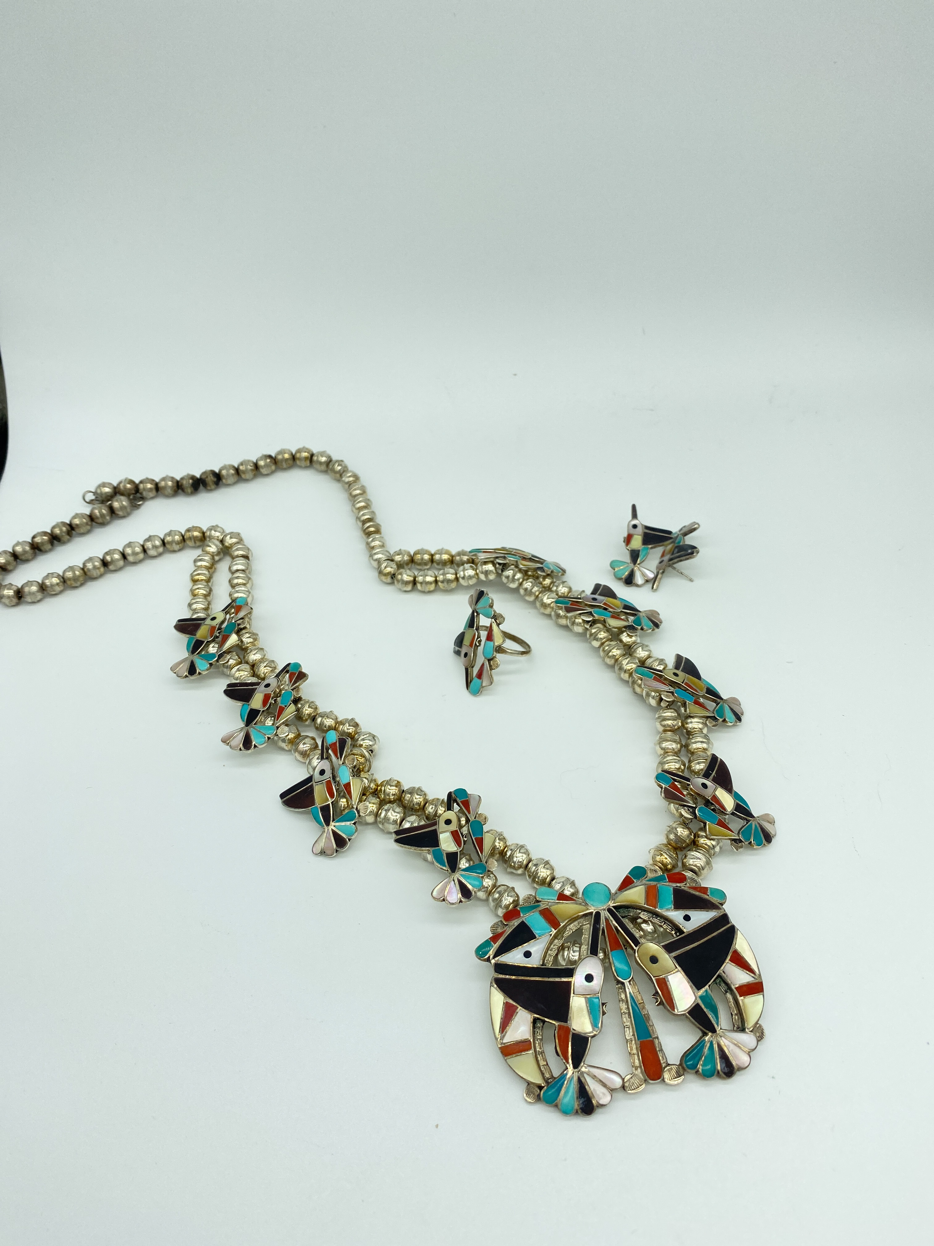 Necklace is approx 92 grams. 31 inches end of pendant to end of necklace. Necklace alone hangs 28 inches and pendant is 3 inches Earrings weigh approximately 5 grams and ring approx 4 grams