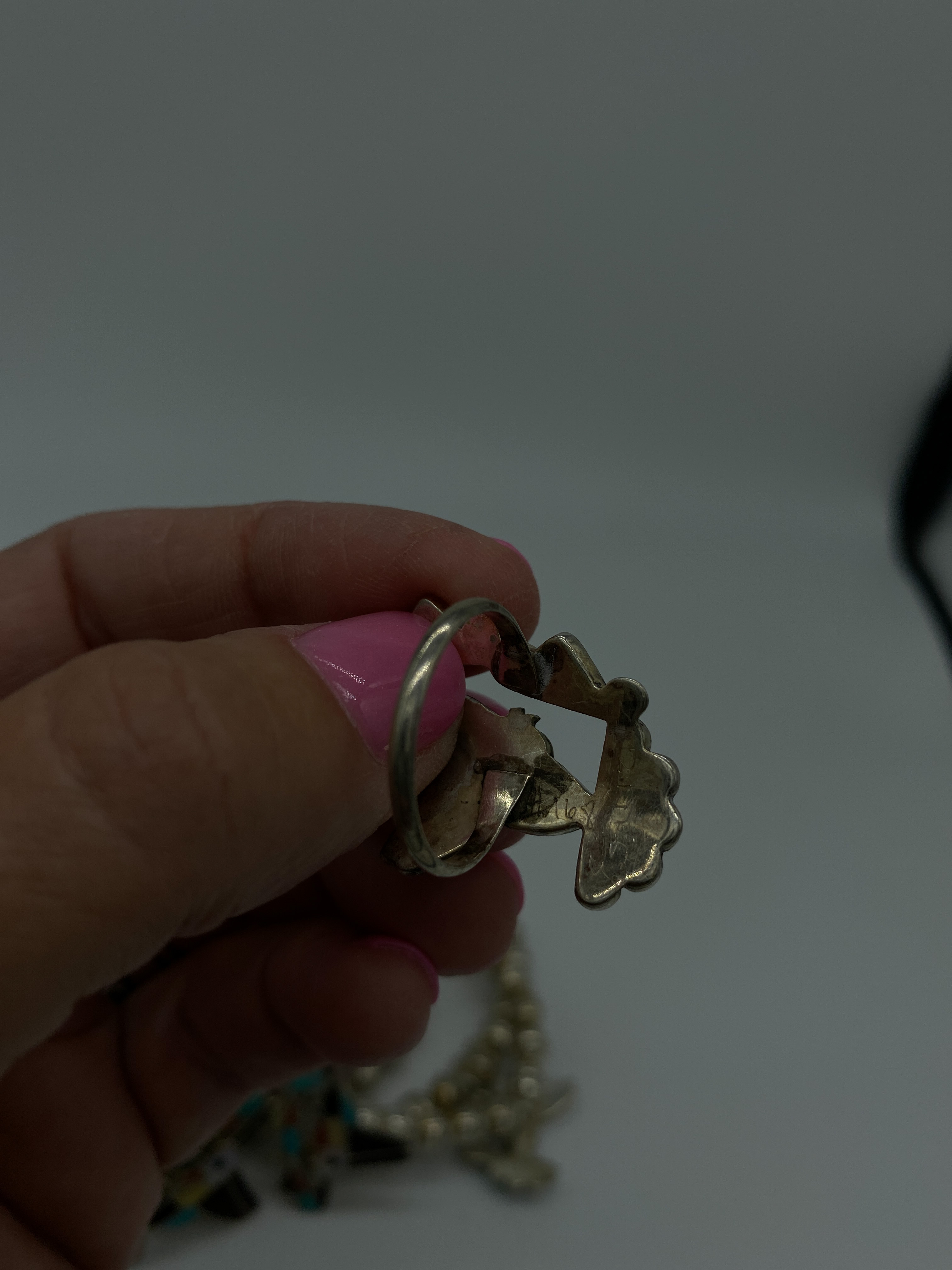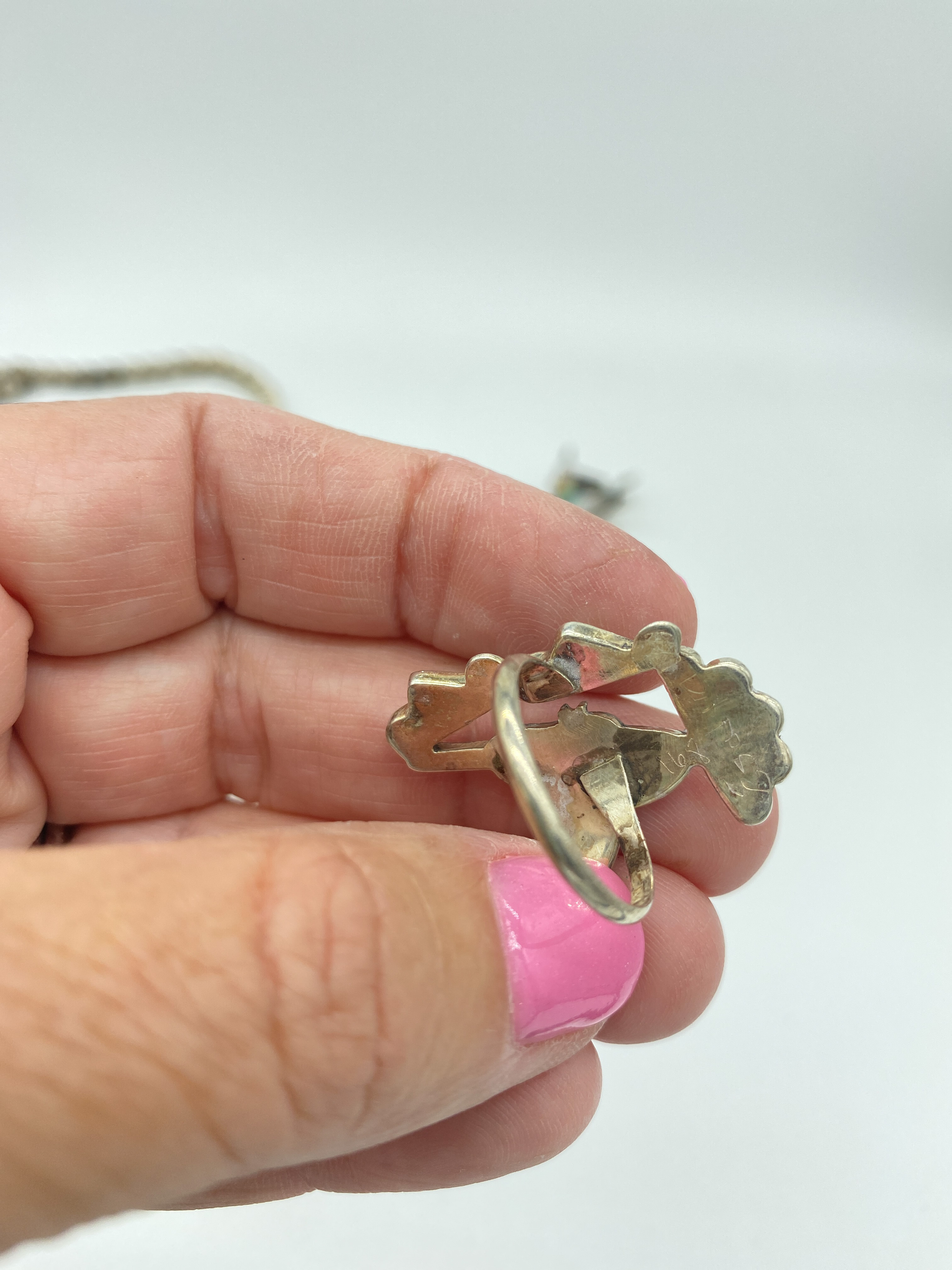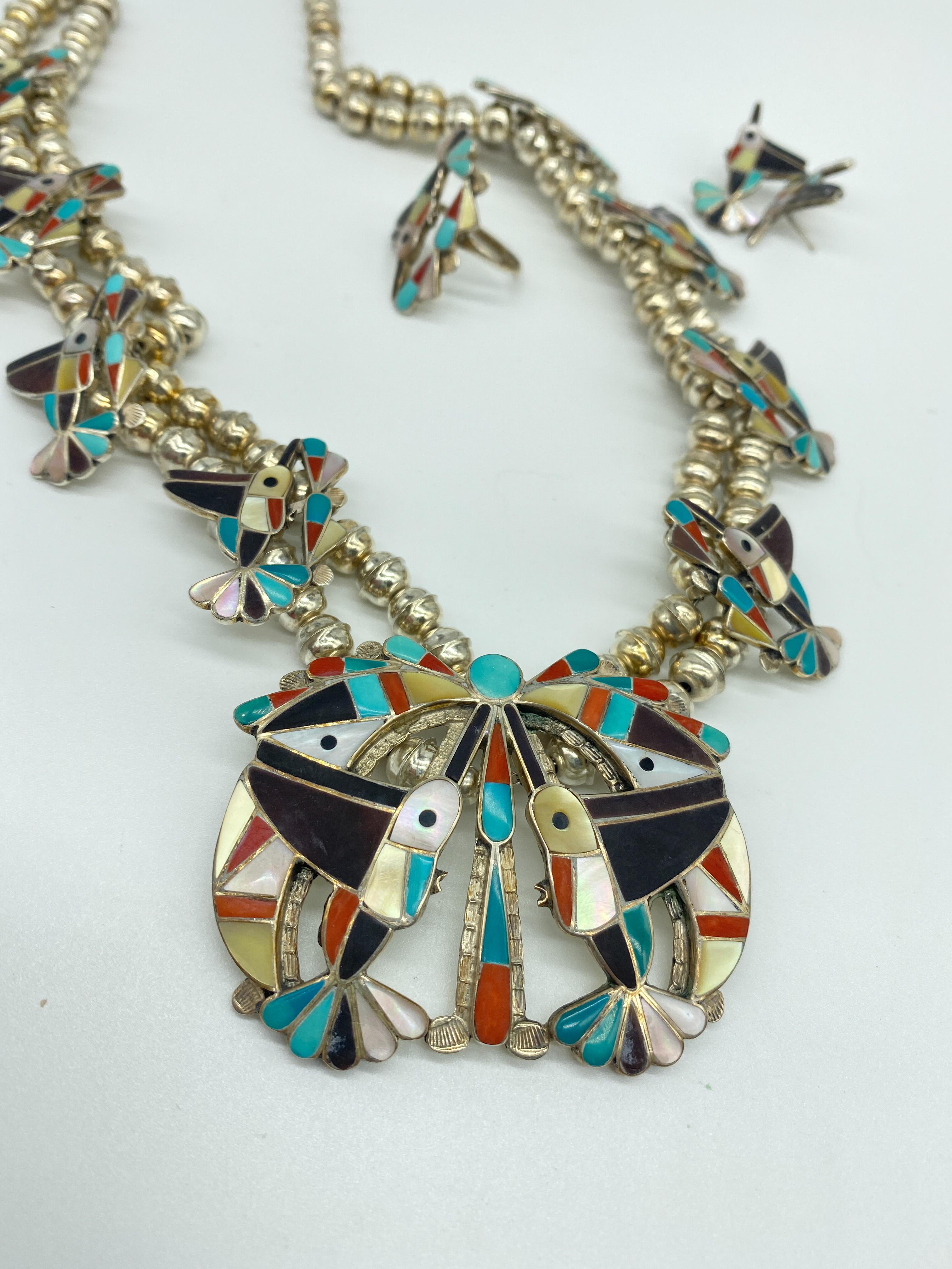 Necklace is approx 92 grams. 31 inches end of pendant to end of necklace. Necklace alone hangs 28 inches and pendant is 3 inches Earrings weigh approximately 5 grams and ring approx 4 grams