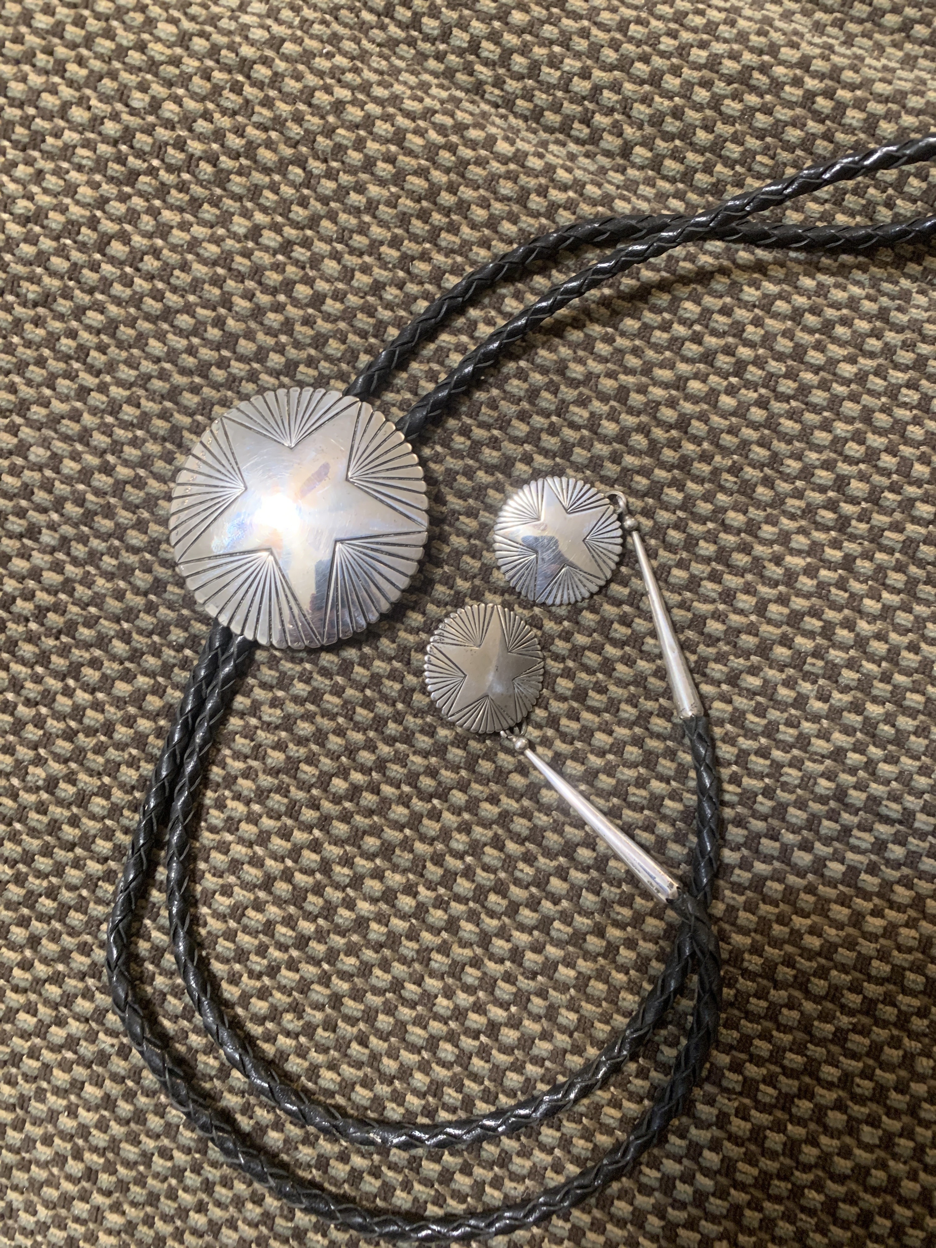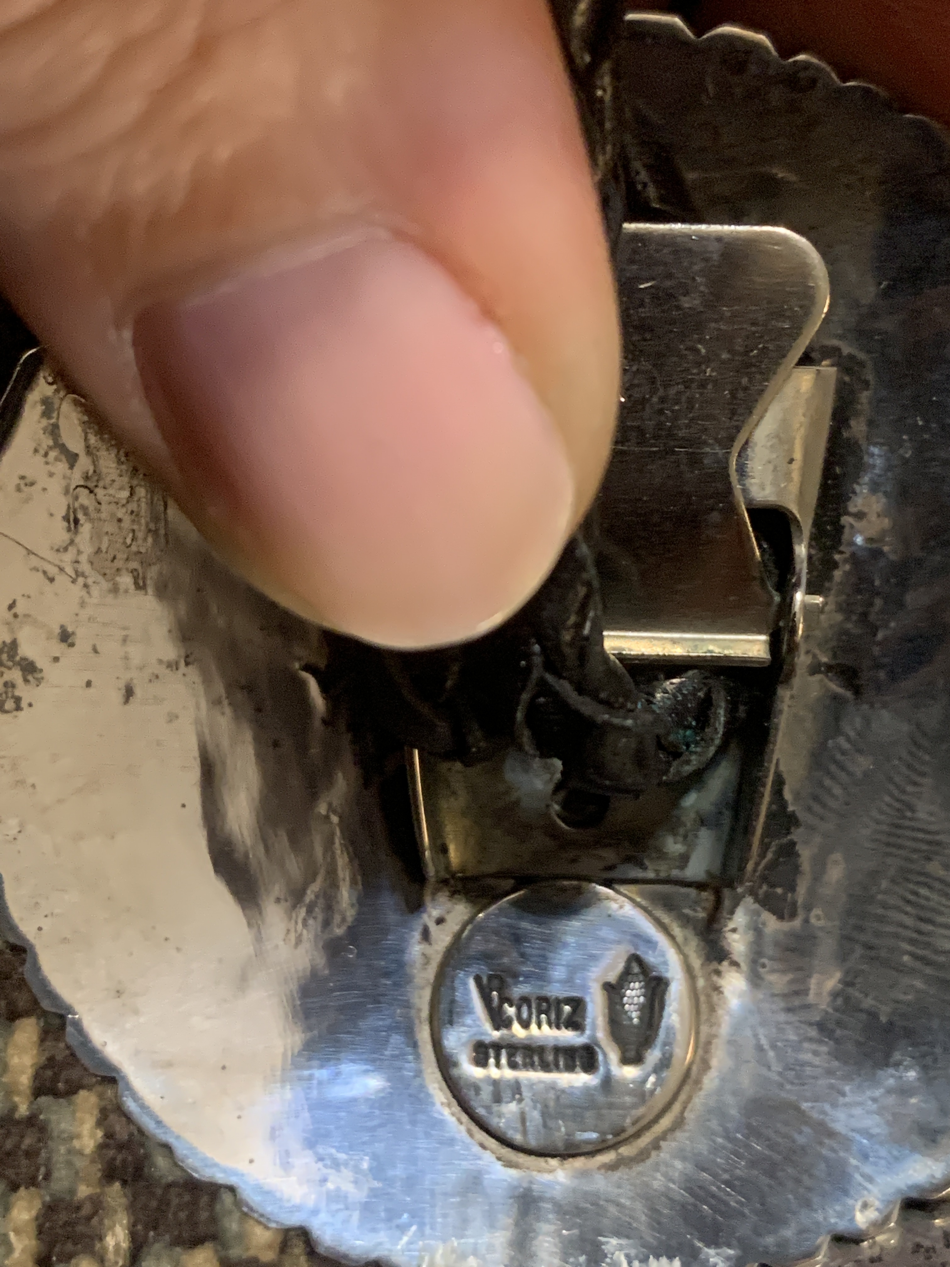 I am so happy to have found this cute bolo tie for only $3 at my favorite thrift store, but I have no idea about where it came from. It says “sterling” but no 925. It also has a very pretty little ear of corn stamp, and some letters which are hard to make out. It looks almost as if it says “VPcoriz” (???) Any guesses or tips? Thank you!
