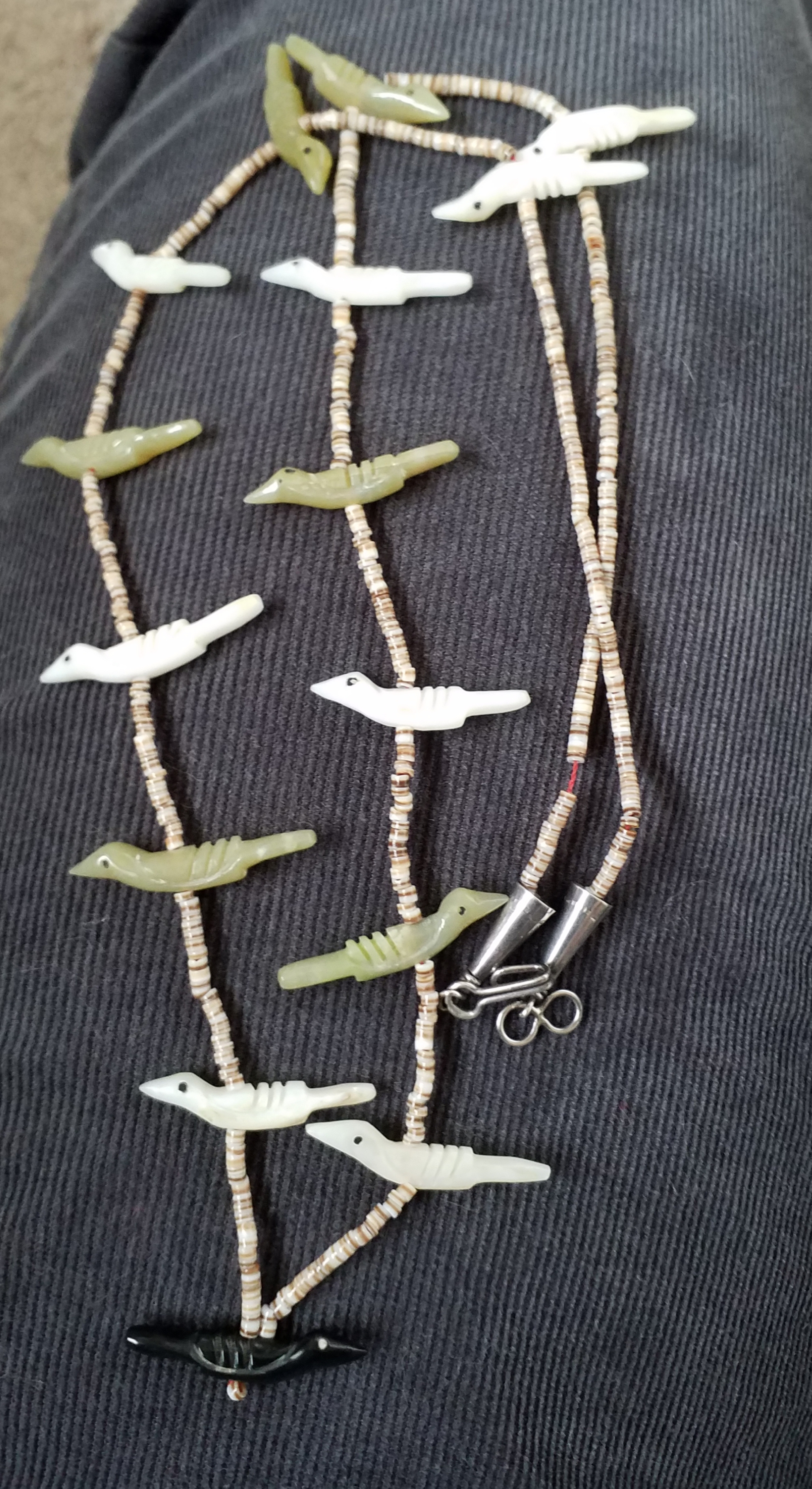 My friend who is now in her 80s gave me this necklace back in 1994 (she is Chinese and was on one of the last boats out of China in the 1950s). She thought it was Zuni 1970s at the time “it’s just a cheapie”. She used to buy her jewelry from an elderly gent at the swap meet. It is strung on red thread, which has stretched. That is something I learned beading - “Stretch the thread, then thread the needle” if you don’t, it will stretch on its own afterward.