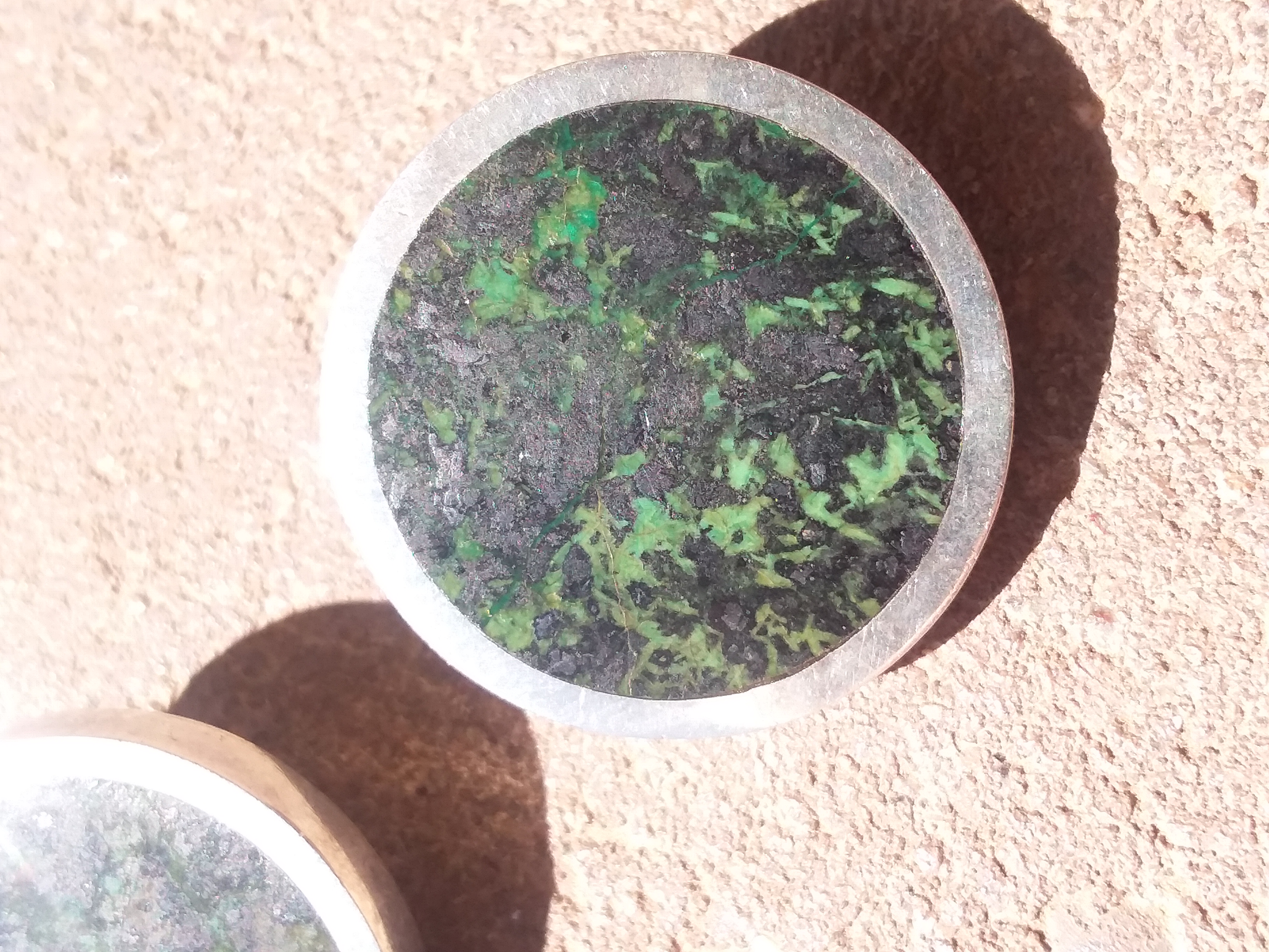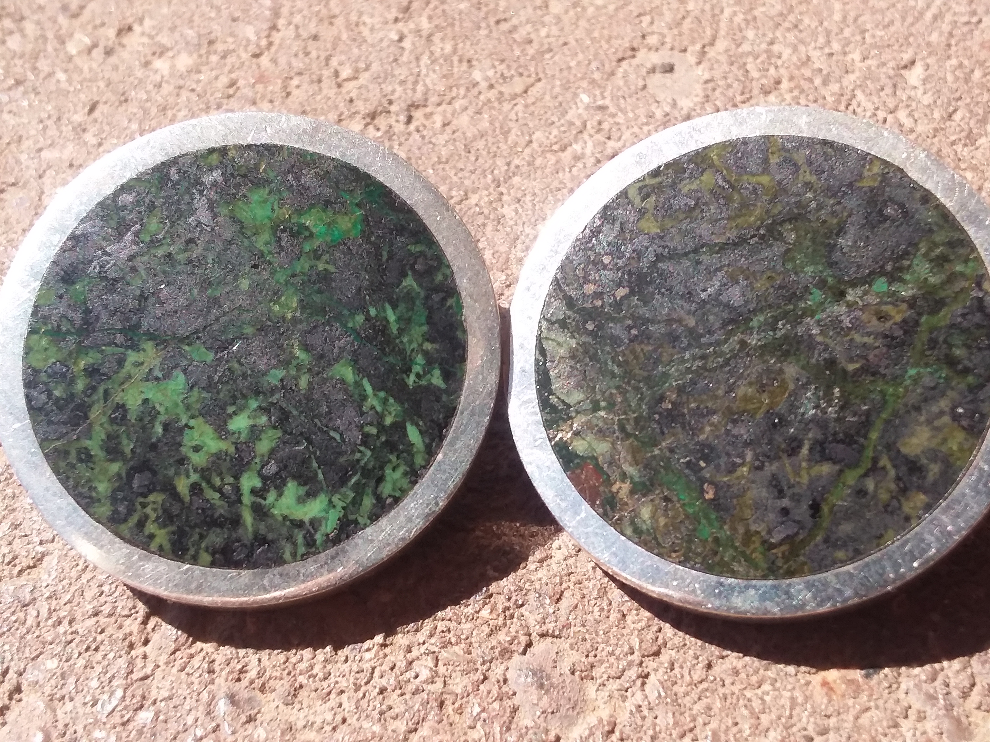 The one on the left looks similar to some Mexican Leopard Opal I’ve seen, which can include opal with fire or the more opaque type; the black matrix is typically basalt. The green also resembles chrysoprase and it could also be that. The one on the right with the red spot and the green seams looks like it could be a mix of basalt, red jasper and green chalcedony/chrysoprase or maybe olivine. These are very interesting, one of a kind pieces!