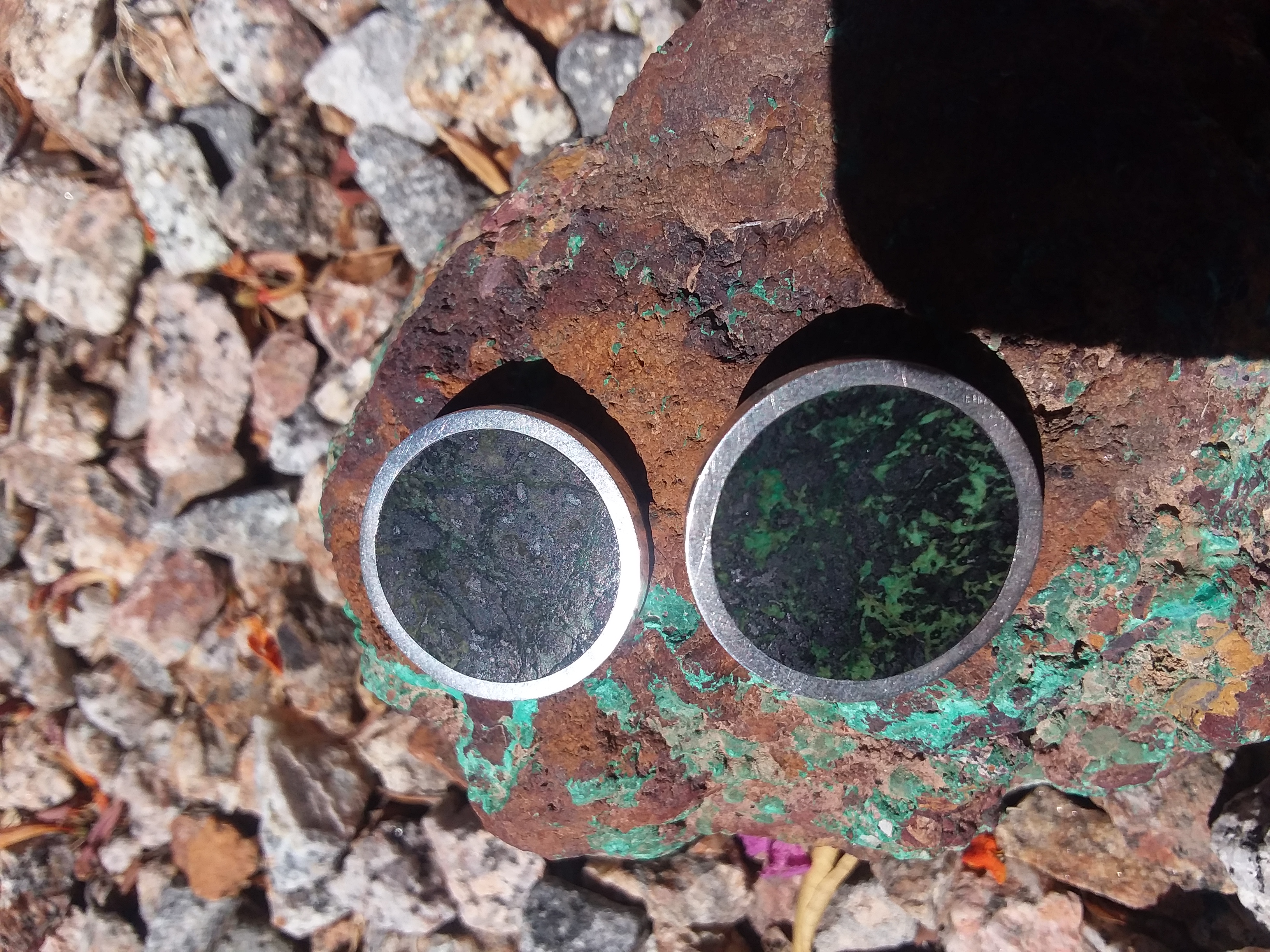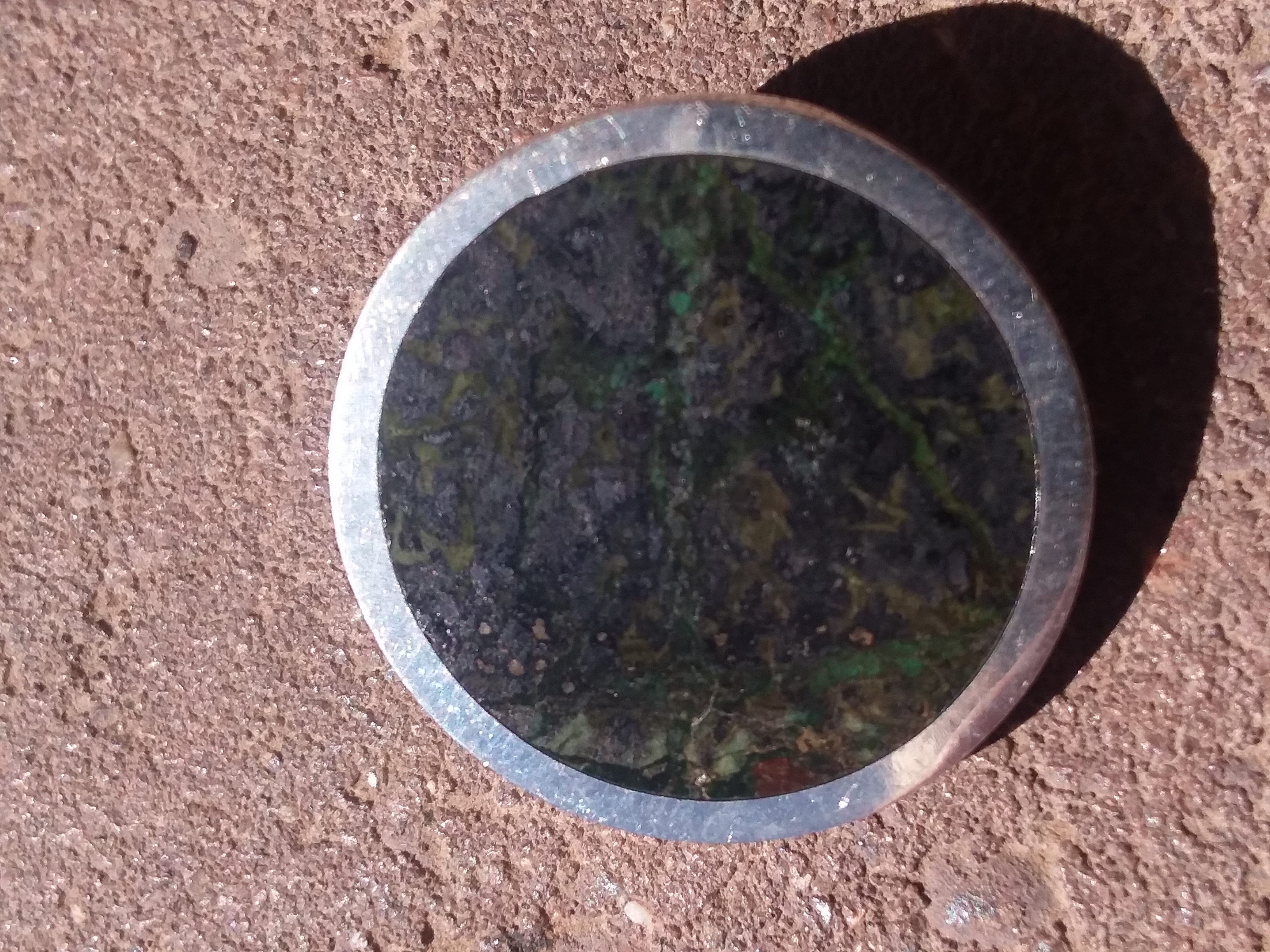 Its not magnetic, though when it catches the light just right, it looks mirrorlike. The color really doesnt look like its from copper in the stone, but I have learned not to make that assumption. I think the closest thing I found when looking was green granite. But I was not confident enough in that to call it that.