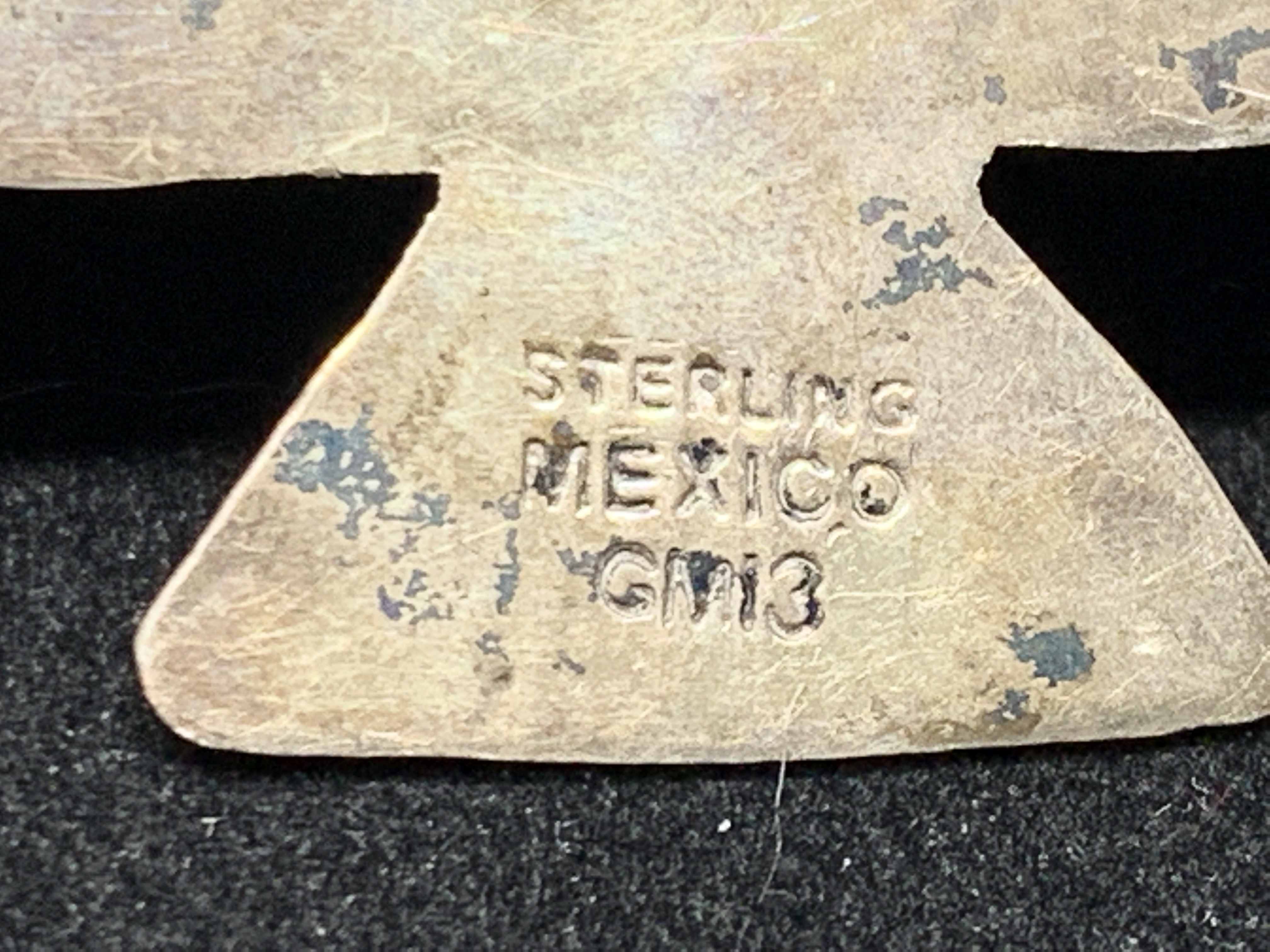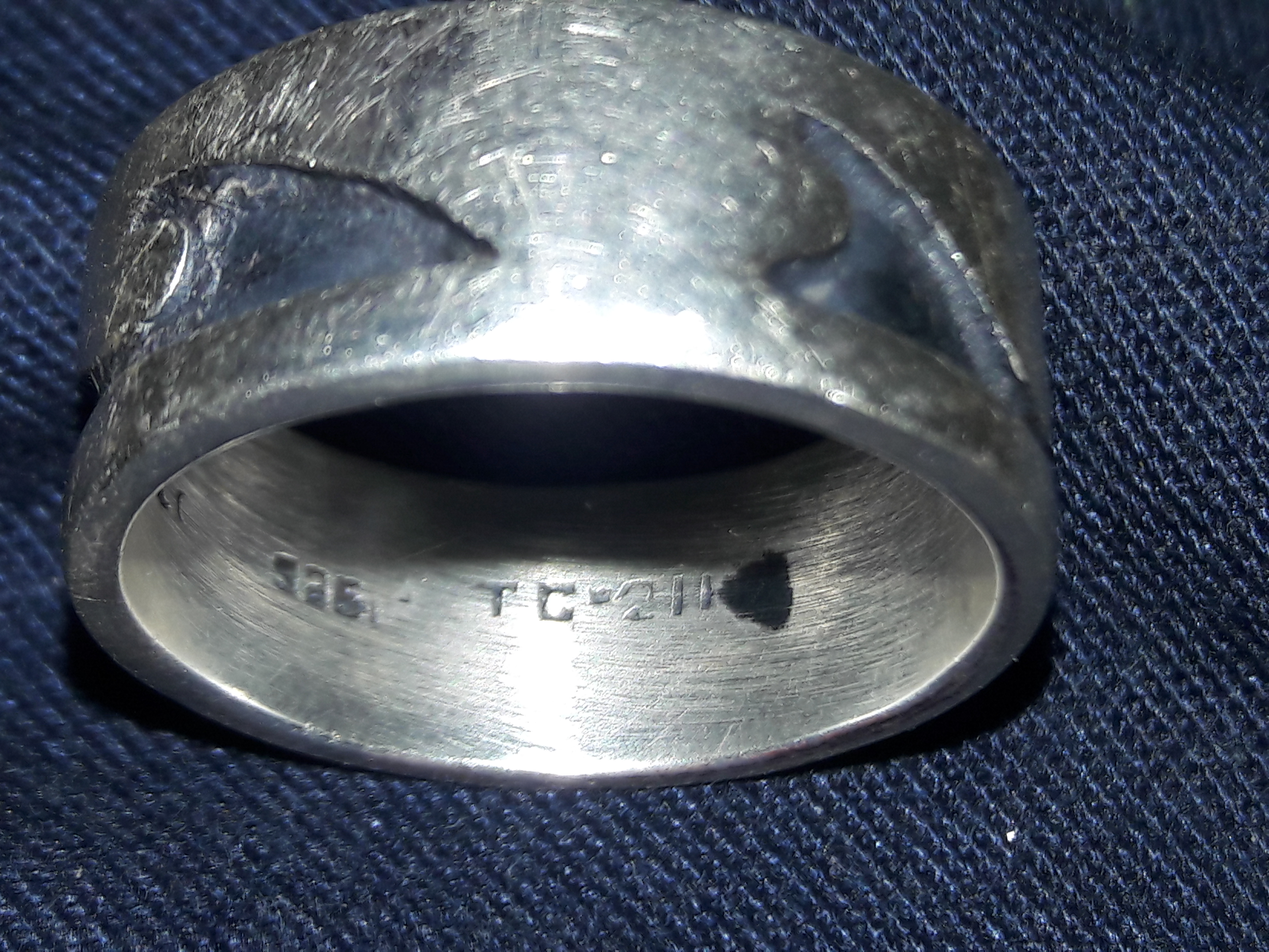 I guess that’s a good thing, I bought it at a pawn shop for $9.95 and all I could really make out at the time was the .925 I’ve read a little bit about Mexico silver trying to figure out what the other letters were. Seems to be TC-211 can’t tell if there’s anything else being covered by the black blob. So? Made in Taxco by the 211th silversmith who was registered, whose name starts with the letter C? (Edit)…Answering my own question, it seems it would be the 211th silver house, not smith, and they would have used many different smiths under this hallmark.