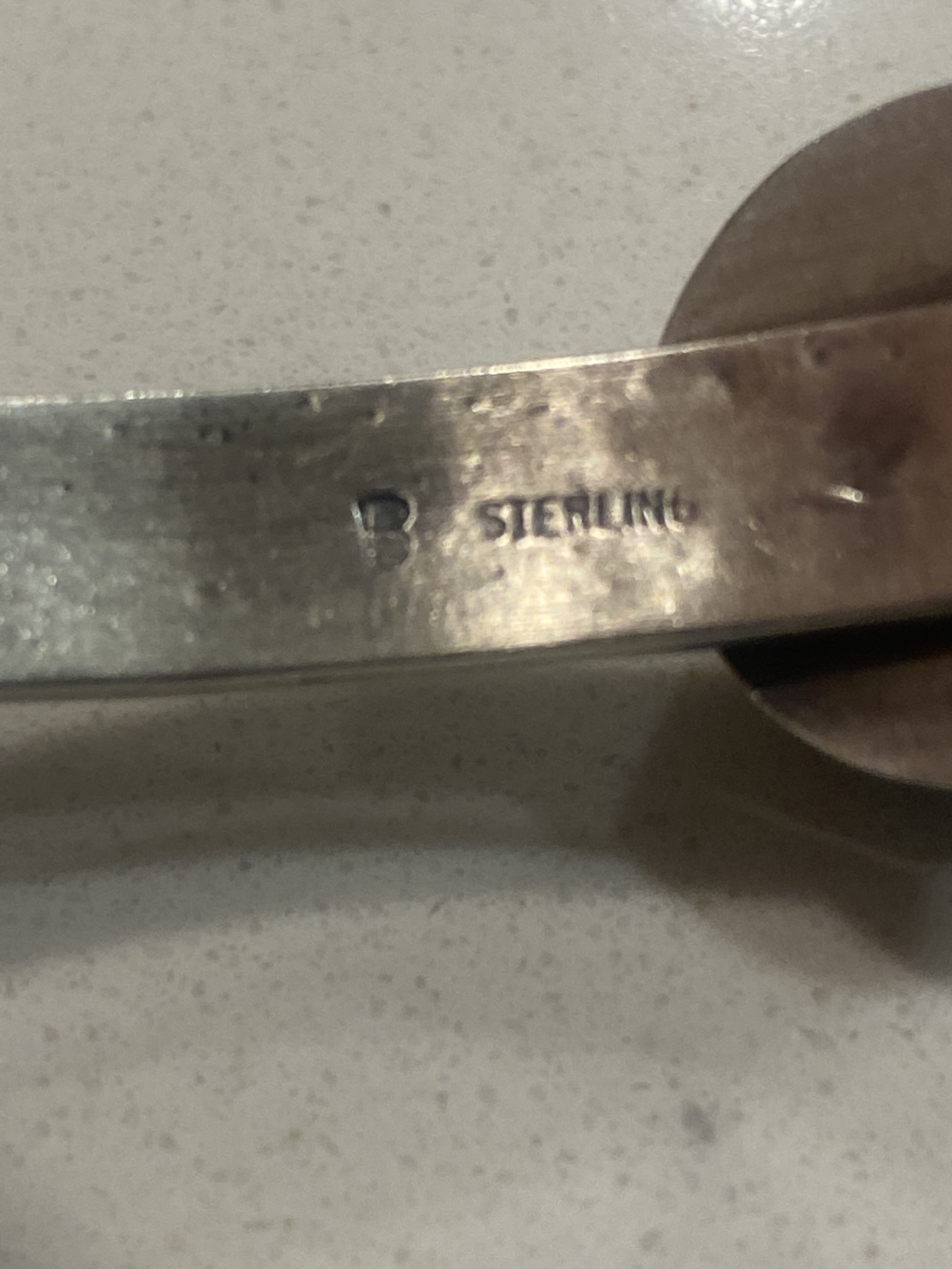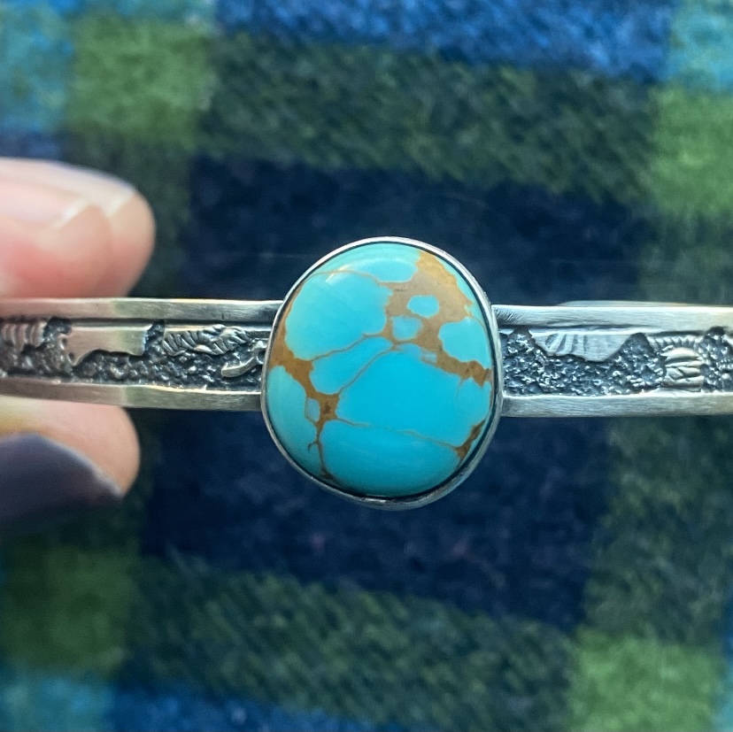 I purchased this bracelet online a few months ago. It photographed better than it looks in real life unfortunately. The seller is a boutique that caters to a sort of cutesy western audience; they claim their pieces are native made and real turquoise. Anyway, I think the stone looks suspicious, as the color is too uniform and the matrix doesn’t look right. I think it is could be block. Also, the silverwork doesn’t look right either. It won’t take a polish and the marks on the back don’t look right. They just seem off if that makes sense. What does everyone else think?