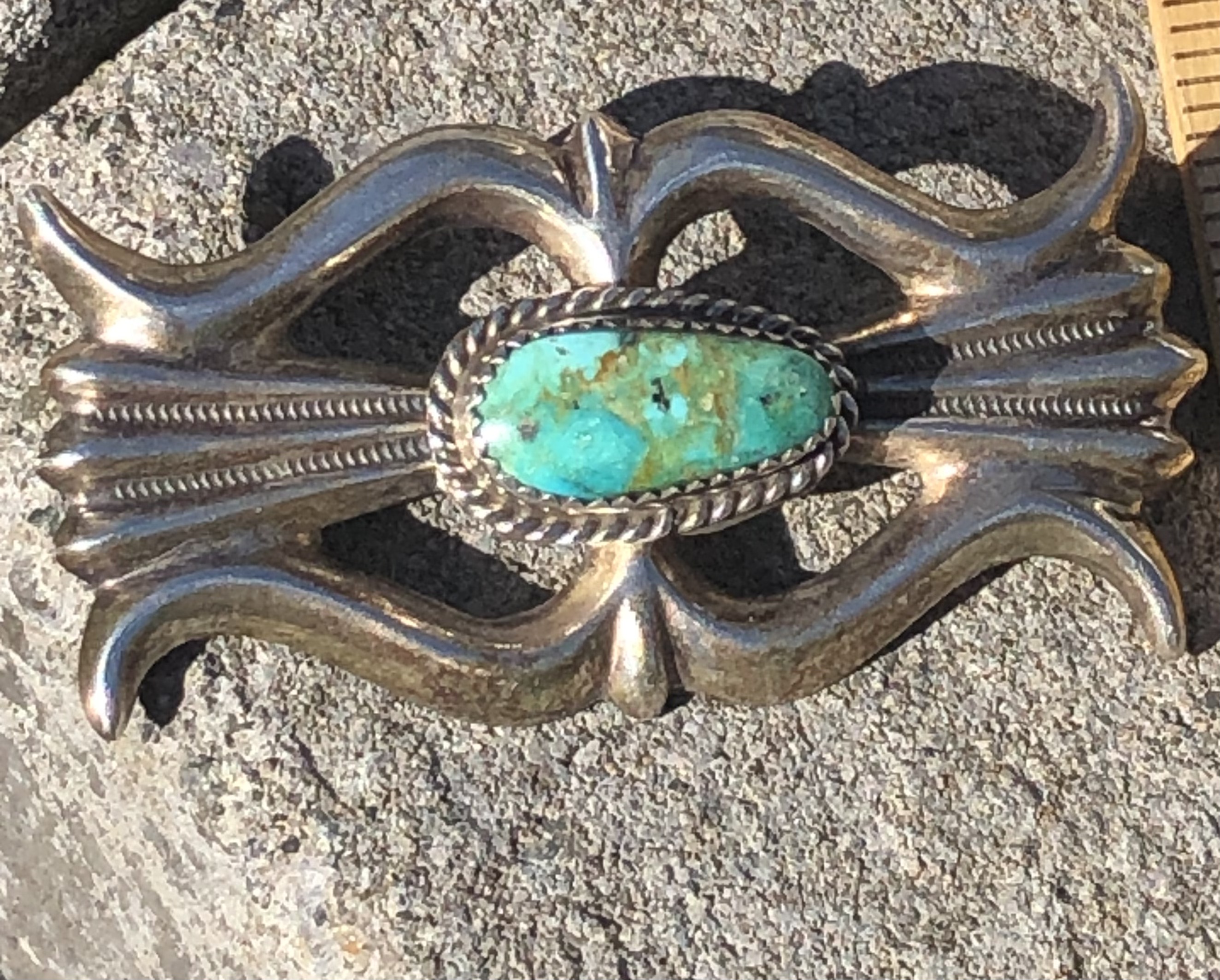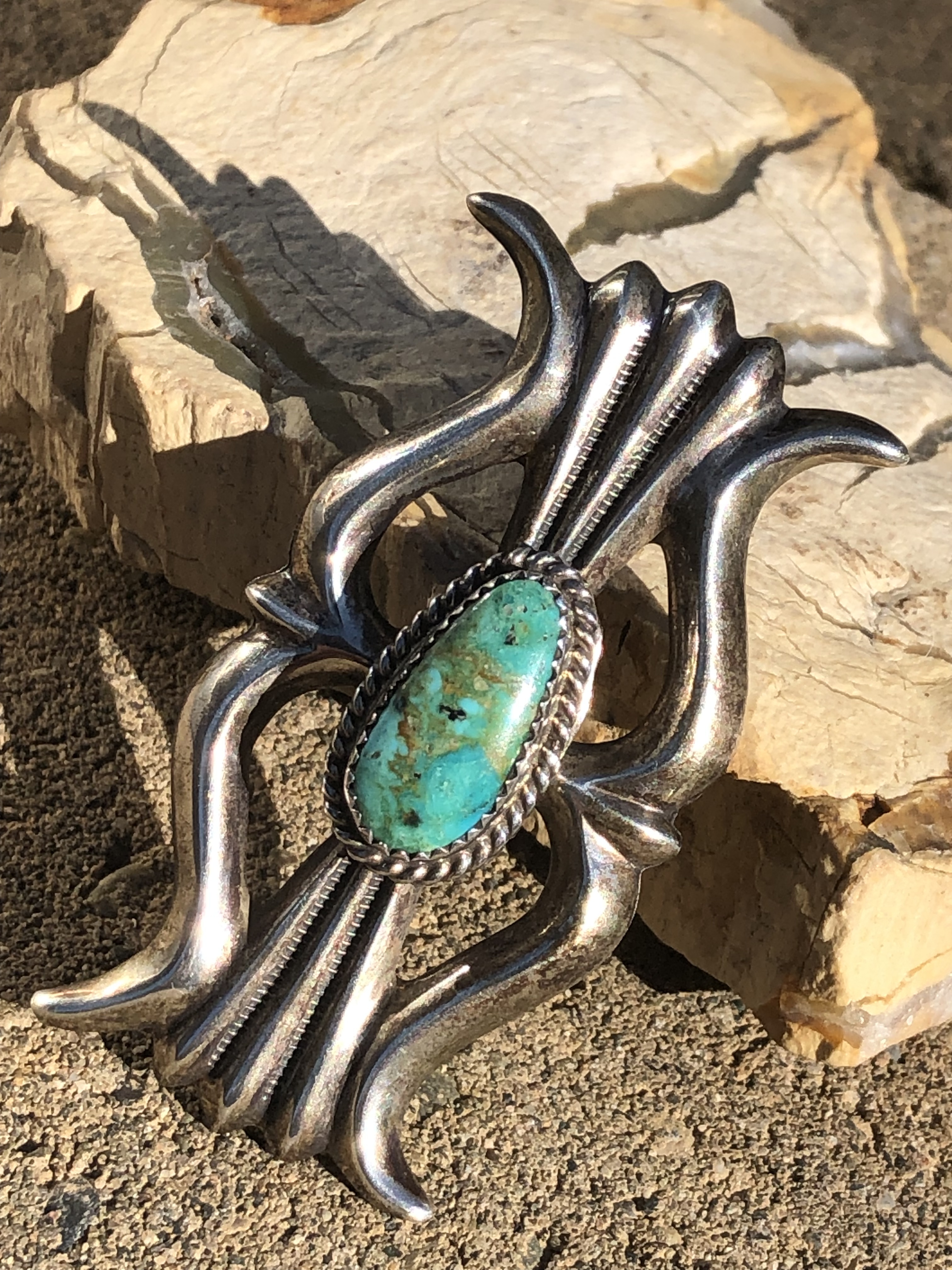 I found a number of his pieces on their site; if you click on Navajo jewelry you have to scroll quite a bit to find them, although a butterfly pin comes up almost immediately. Here’s a cuff I actually almost bought this past spring but it was too big.