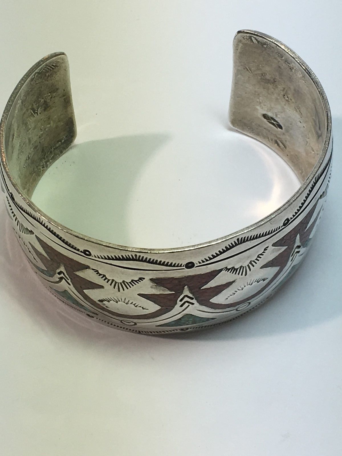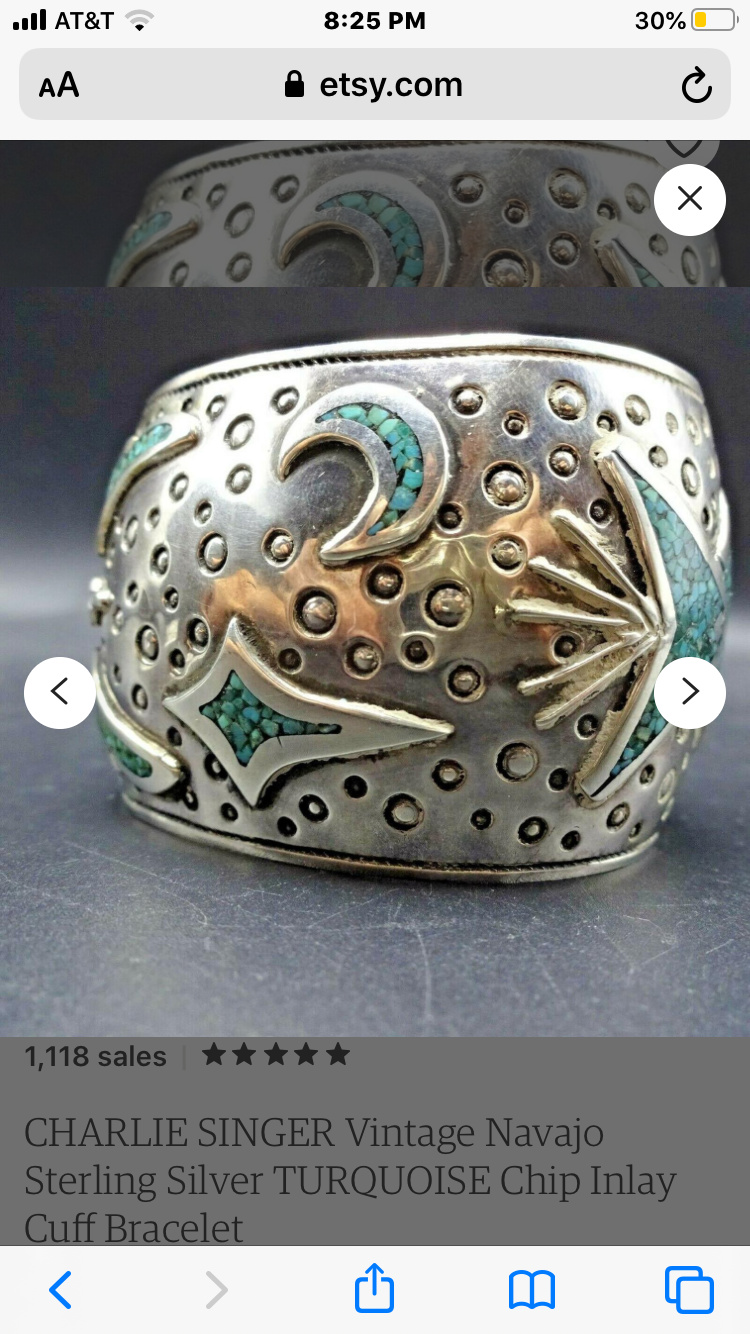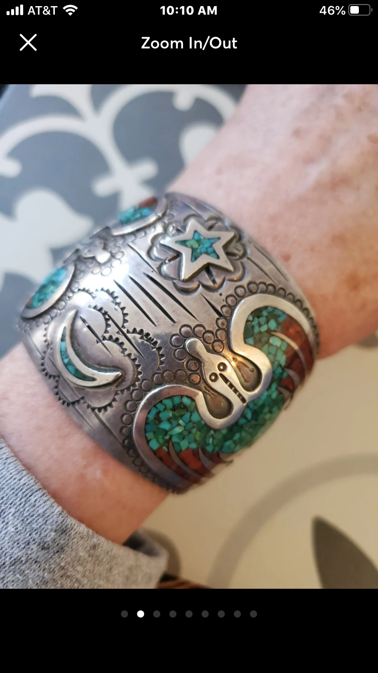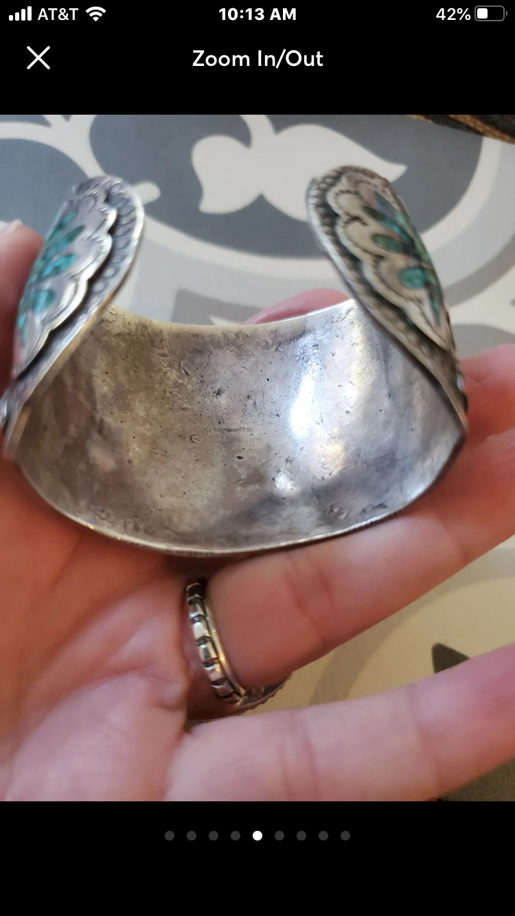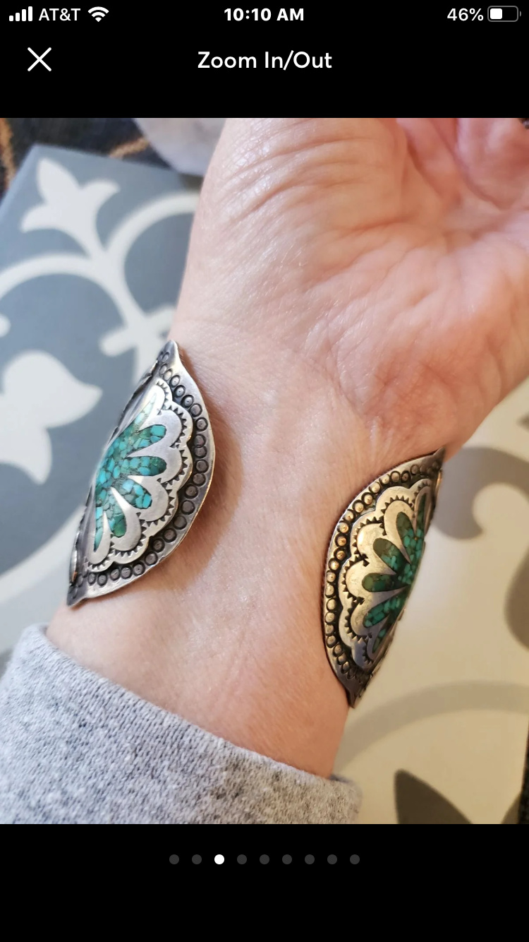 Unlike many other silver bracelets, chip inlay bracelets must fit you right without adjustment. You must measure your wrist and check the measurements on the cuff if you can’t try it on in person. If the seller doesn’t list the dimensions, Ask the Seller a question & ask them to measure for you. Chip inlay cuffs can’t be bent. If you bend them, you will loosen and crack or pop out the inlay. I recommend buying the heaviest, thickest chip inlay bracelet you can, not just to invest in silver, but to get something you can avoid accidentally flexing. Also, know how to put on a cuff bracelet correctly.