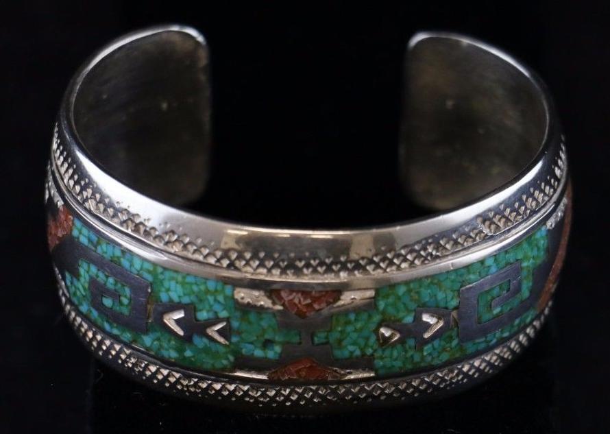 I’m not an expert, but I am a collector who has focused on a particular artist and on a particular object, the cuff bracelet. I own 67 cuffs in the chip inlay style made by Delvin J. Nelson, a Navajo artist. While amassing this collection, I’ve looked at a lot of chip inlay. I’m passing along some notes about chip inlay, based on my experience.