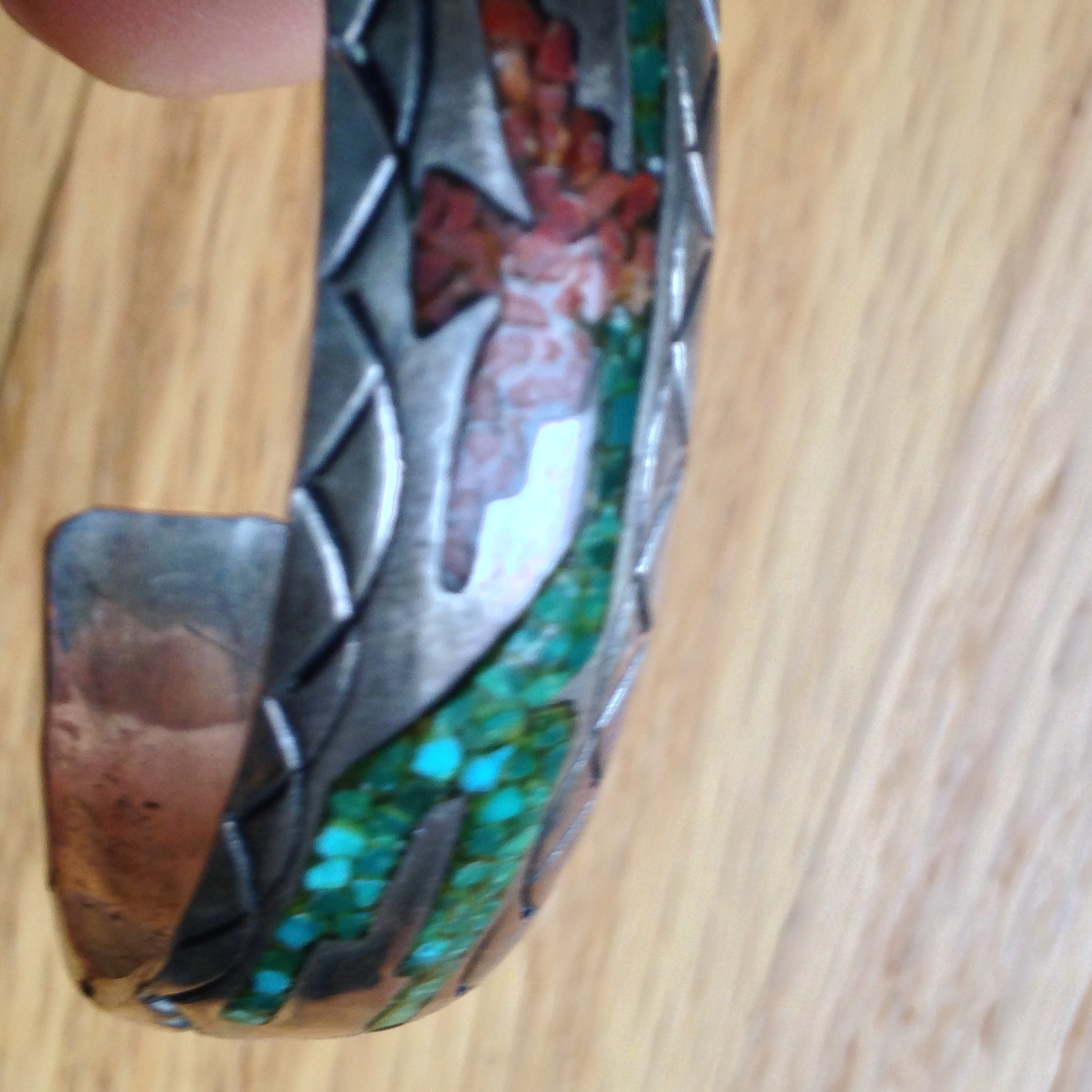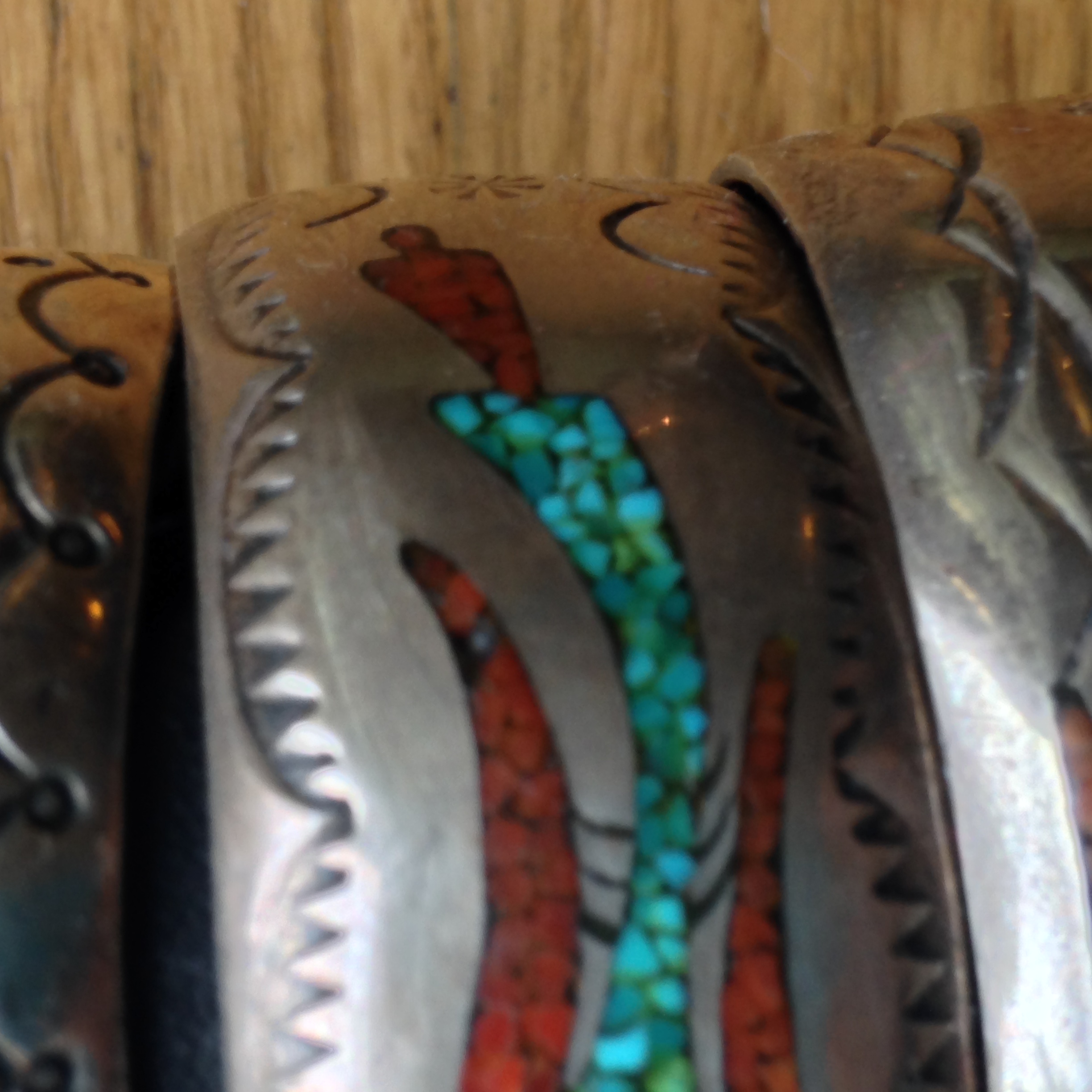 - Check every tiny inch of your chip inlay bracelet before buying it. Ask for more photographs if the seller doesn’t supply enough. If you’re buying in person, hold the bracelet at an angle away from you, run your finger over it. The inlay ought to be perfectly flush with the silver or even a little lower. If it’s starting to lift upward in the channels that hold it, it may have been compromised. I bought a bracelet like this once by accident, and as soon as I began rubbing it with a polishing cloth, I lost part of a section of inlay!