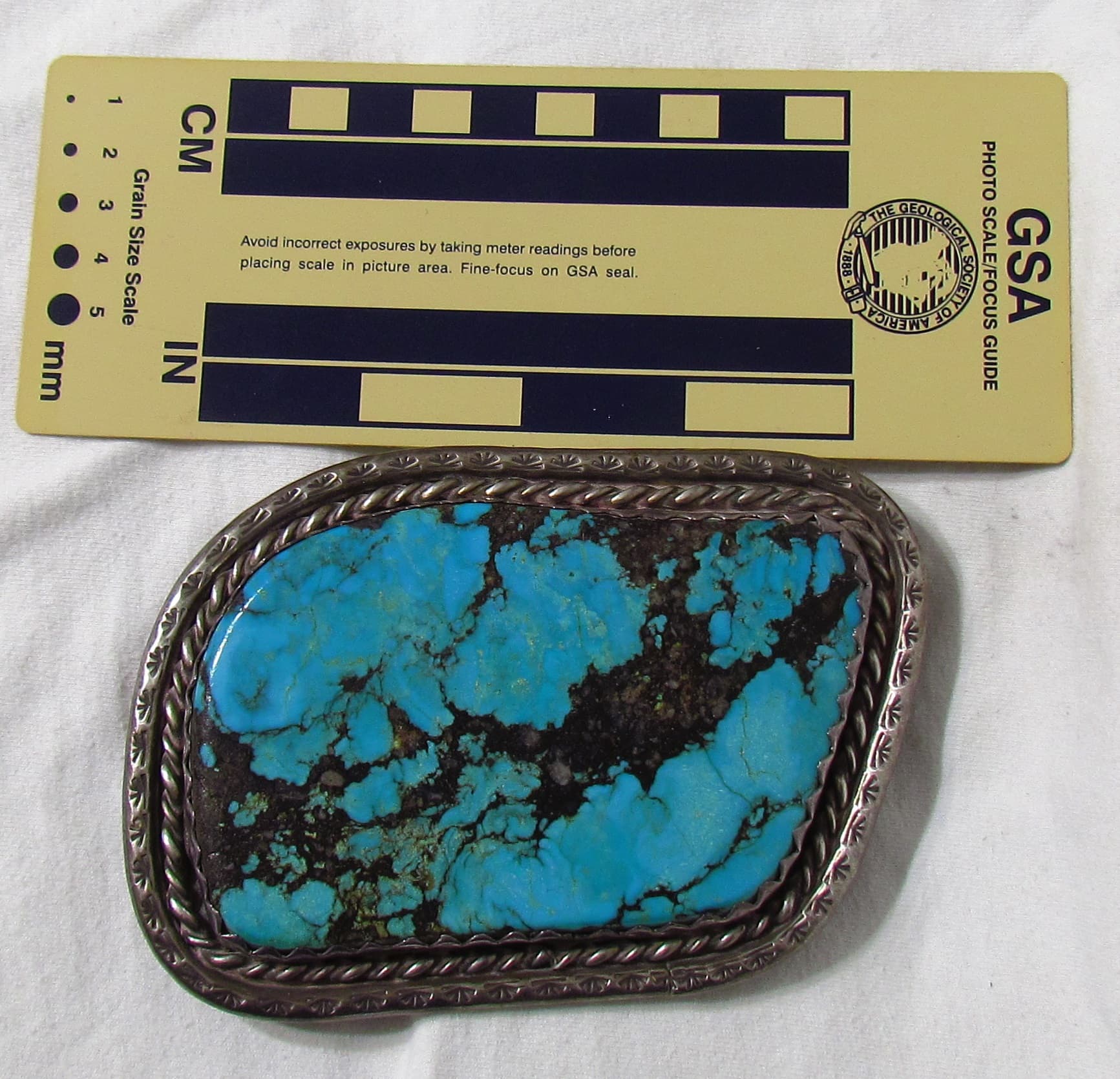 My girlfriend gave this buckle to me as a gift several years ago. I think she outdid herself in finding the largest turquoise stone I’ve ever seen in a NA piece. I have not been able to ID the maker although a seller on Etsy has one for sale by the same maker claiming c1960s vintage but I have no idea.