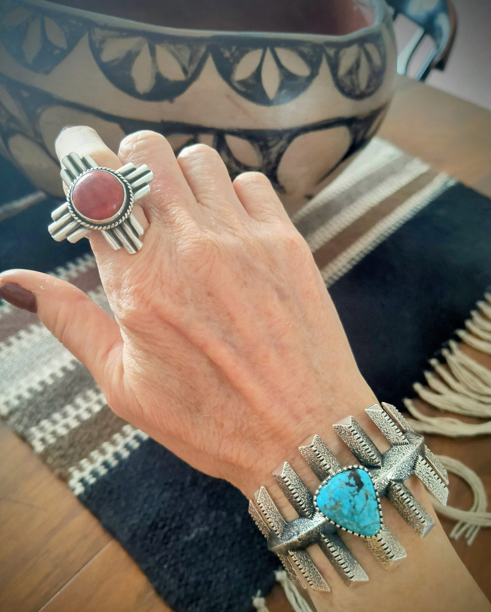 Thank you! I couldn’t decide between the 2 cuffs last spring, and it was the Blue Gem stone in the other that finally swayed me to bring it home first. But now I love them equally. And I did break my unofficial “rule” to buy in person, but I bought a ring online last year from Garland’s and a little cuff for Christmas this year from Medicine Man Gallery. Rules were made to be sometimes broken, right?